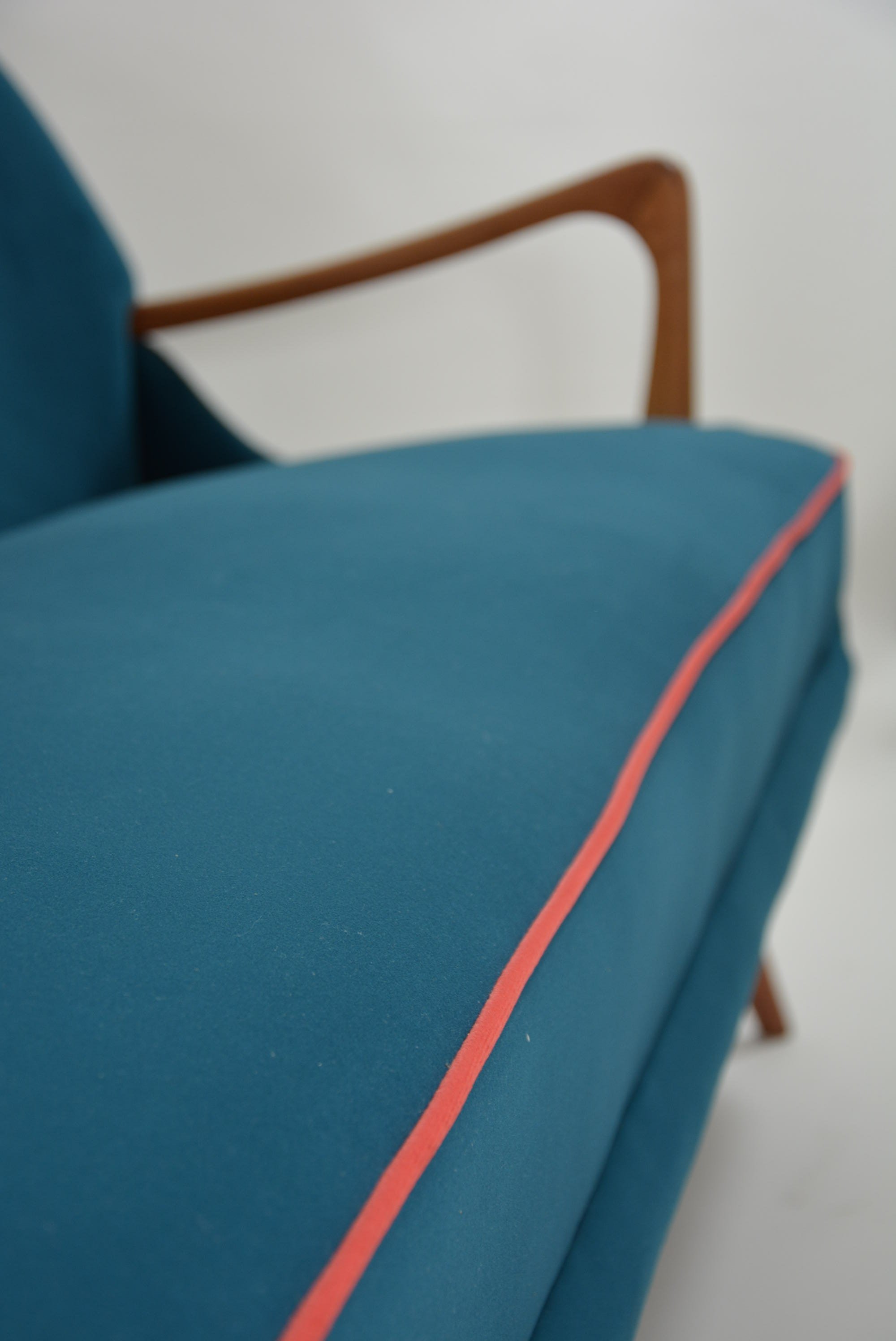 Entièrement rénové. Recouvert d'un tissu très haut de gamme velours antitache canard mat. Passe-poil corail profond autour de toute l'assise.