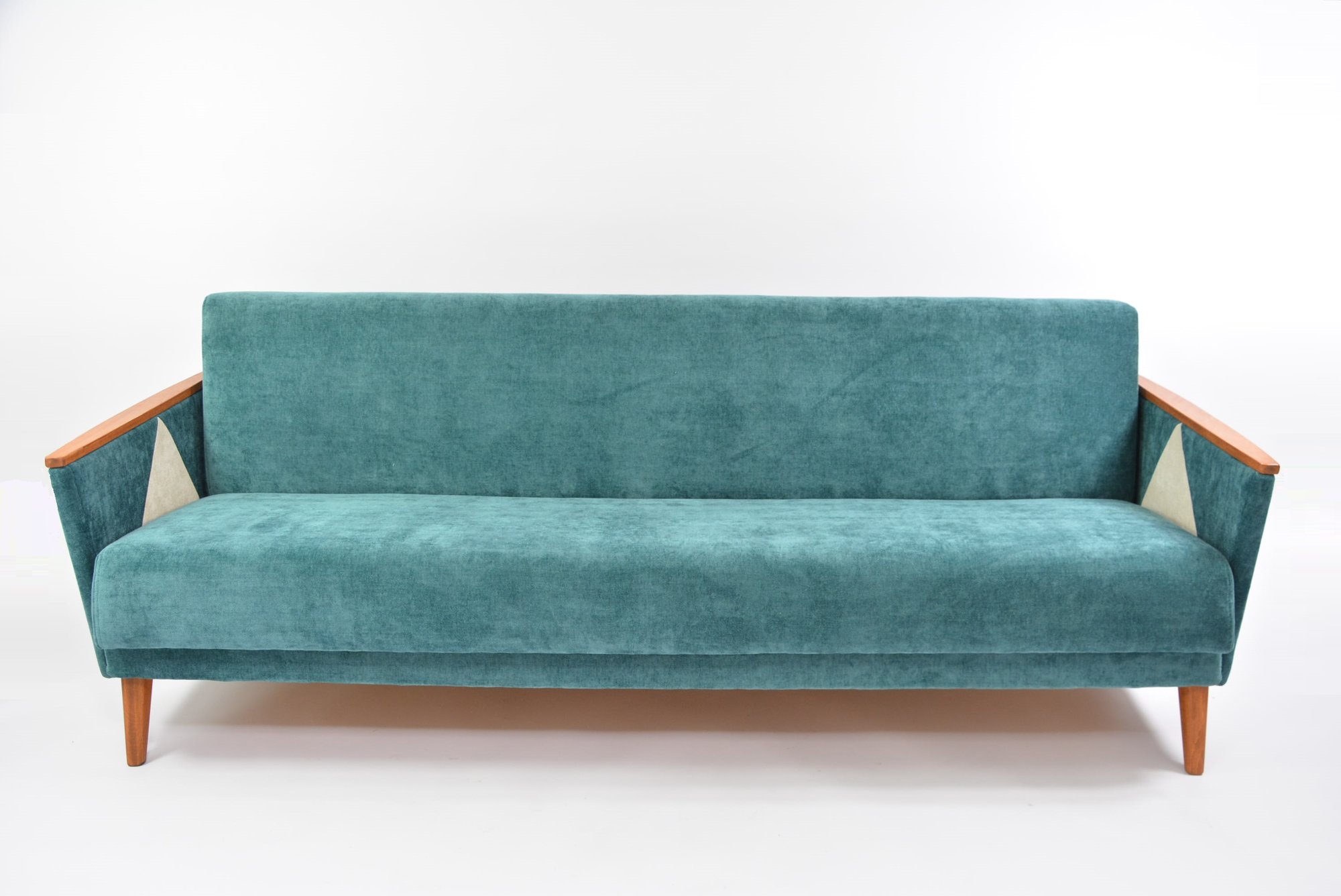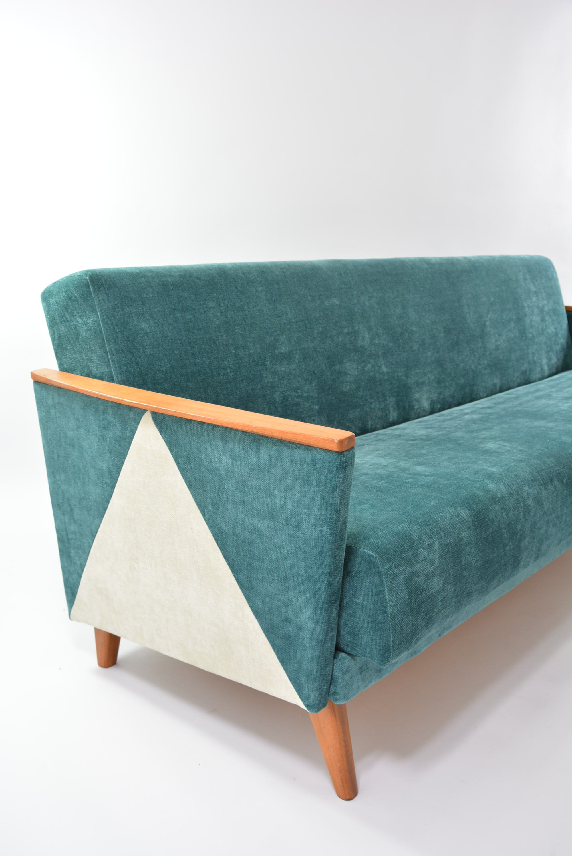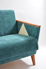 Rénovation intégrale : bois, garniture - ferme et idéal pour le couchage- tissu bleu canard antitache. Accoudoirs restaurés avec l'intégration du tissu ivoire en forme de triangles.