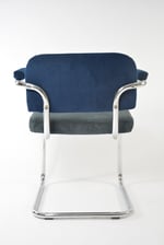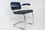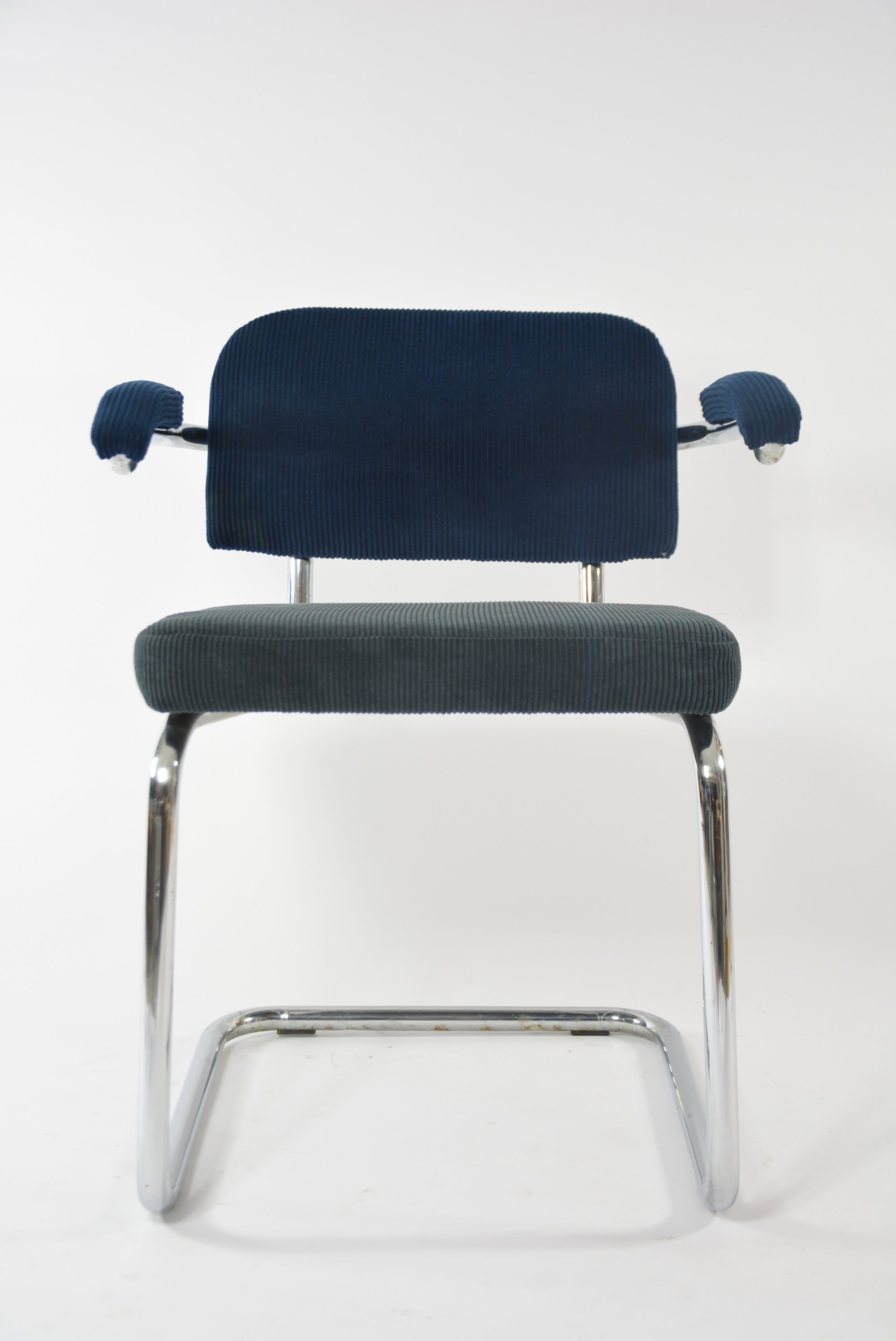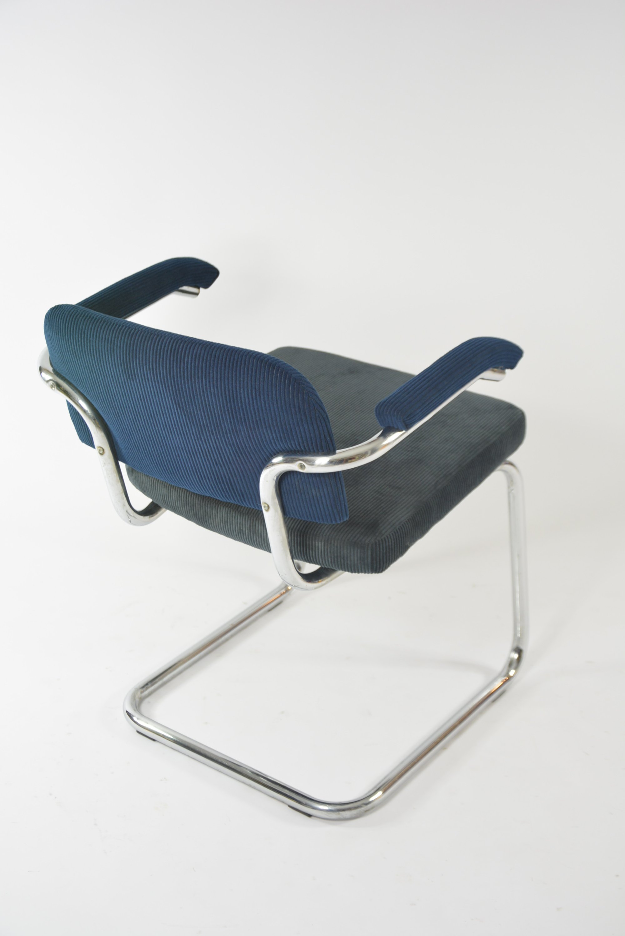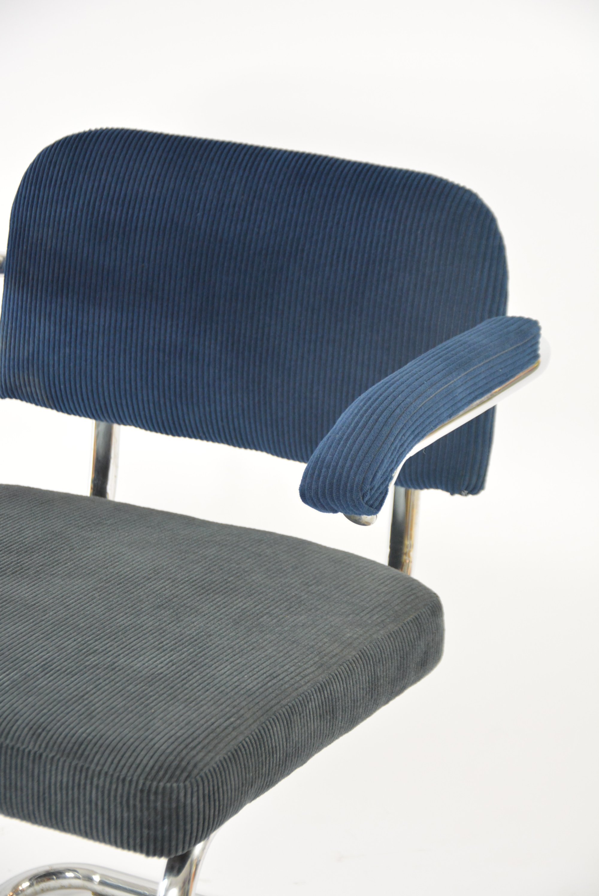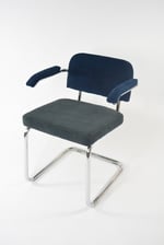Structure en acier chromé, assise, dossier et les accoudoirs tapissés en tissu côtelé antitache bleu et anthracite.