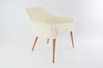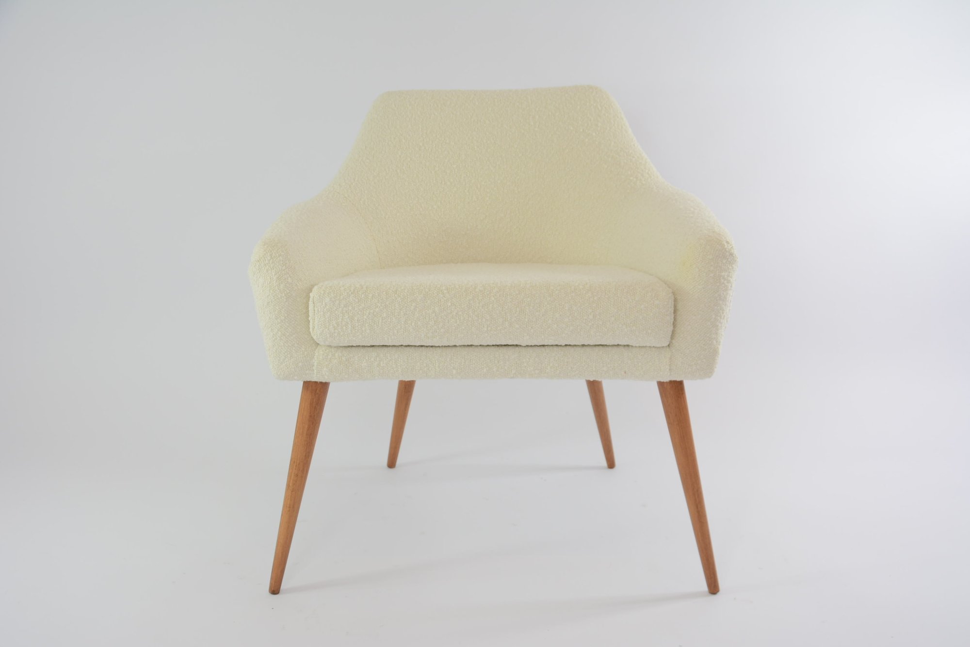 Fauteuil entièrement restauré: garniture, ceintures, tissu bouclette synthetique lavable ivoire clair. Coussin de l'assise amovible et lavable (zippes).