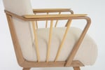 Entièrement restauré et recouvert d'un tissu chiné beige, marron, orangé. lavable. Piétement en compas et les accoudoirs restaurés.