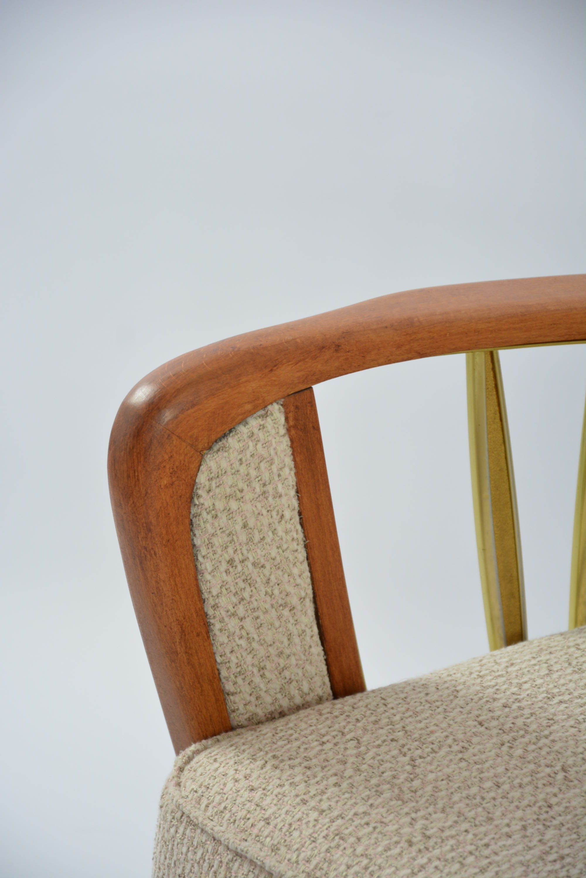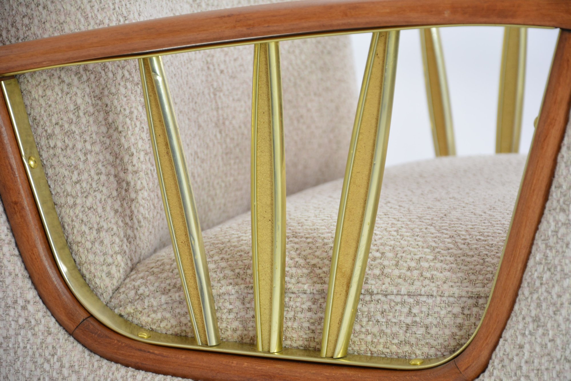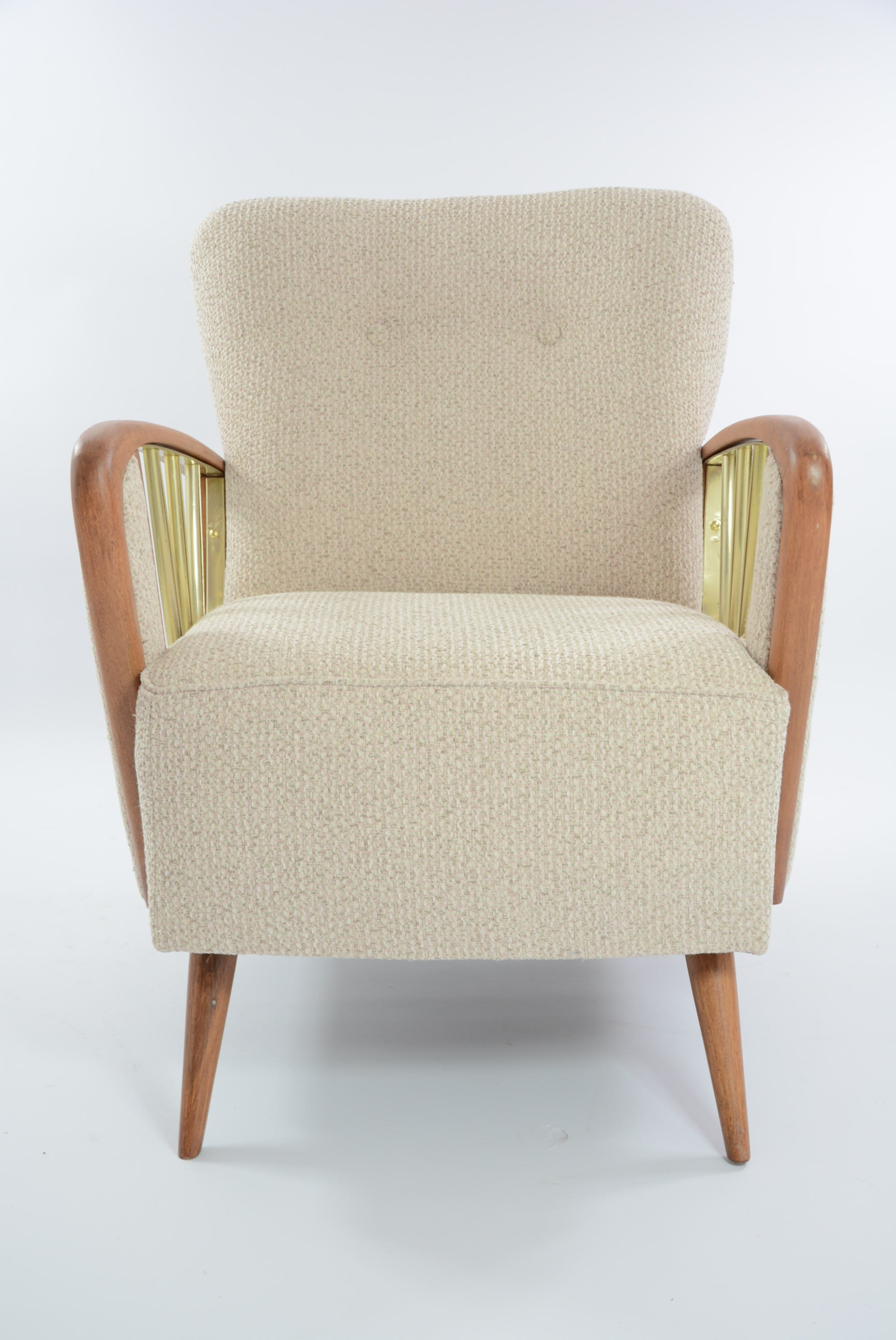 Magnifique fauteuil d'origine allemande, années 60 à l'assise avec des ressorts. Ossature en bois et laiton. Beau travail artisanal.