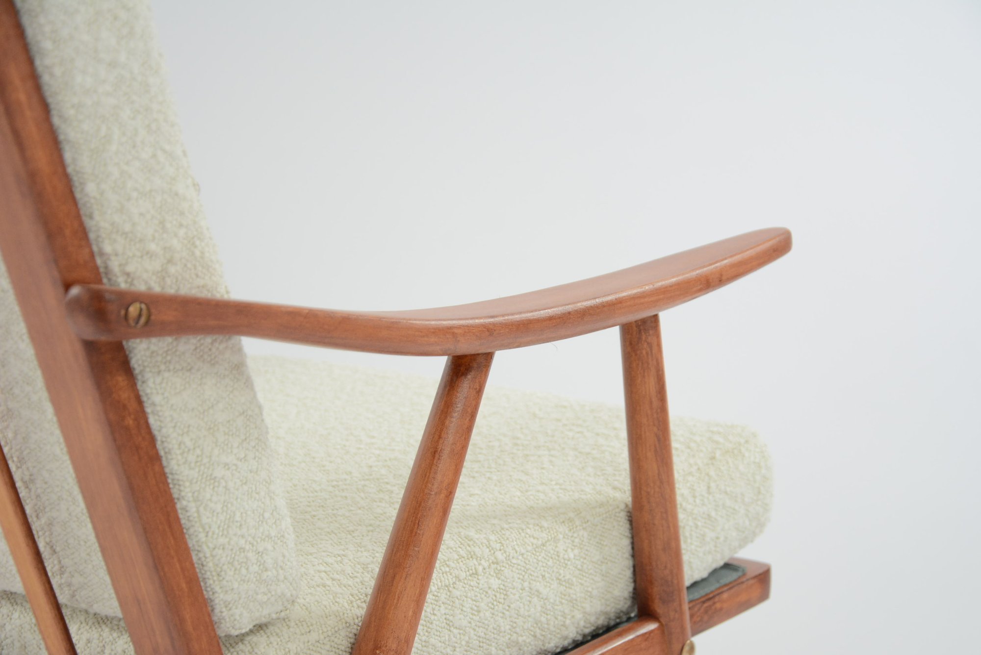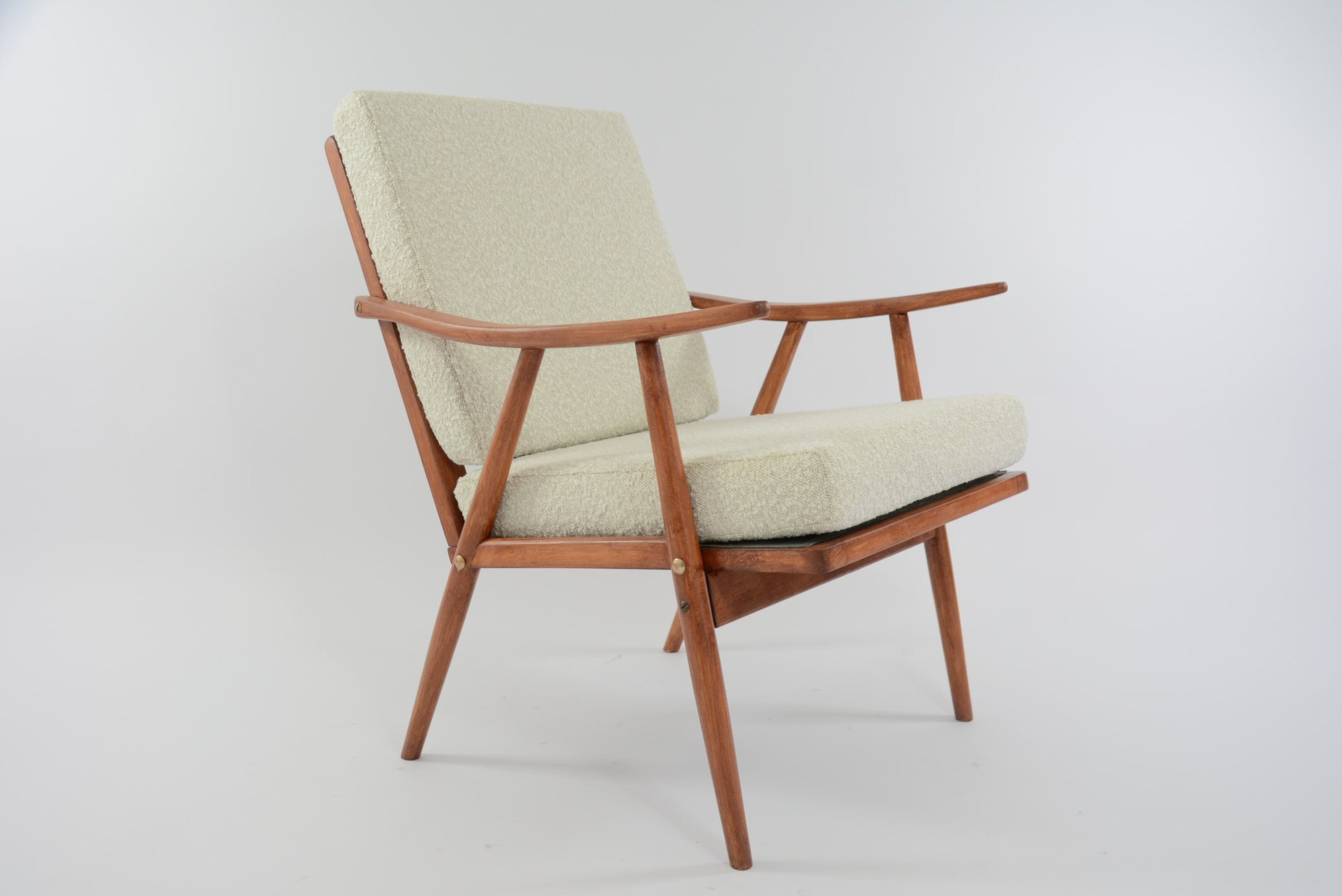 Entièrement restauré en tissu bouclette antitache crème, structure en bois poncée et vernie - teck brun ciré satin.