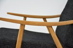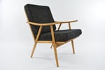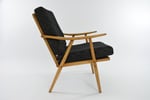 Entièrement restauré en tissu chiné noir et beige, structure en bois poncé et revernie en chêne moyen.