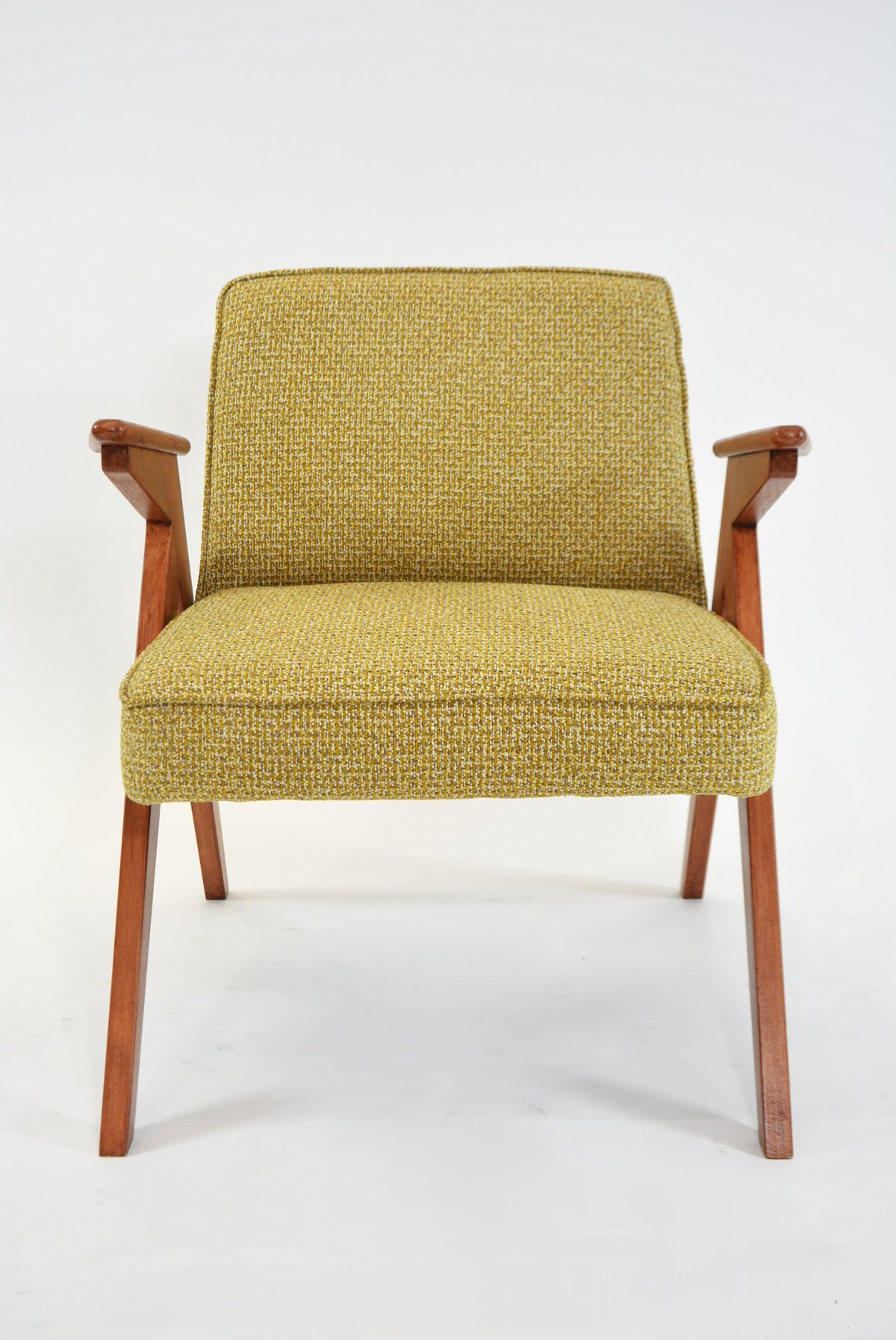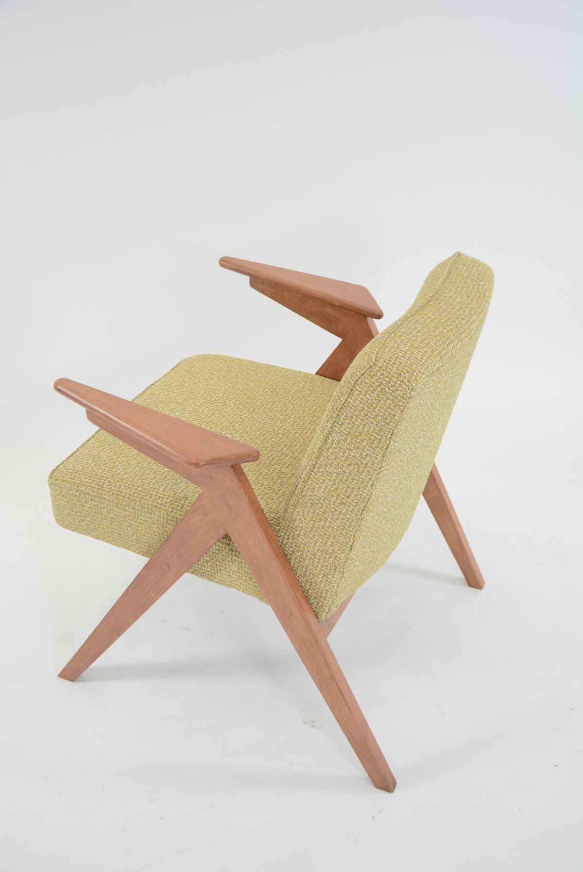 Restauration complète: bois, garniture, tissu chiné gros jaune antitache.