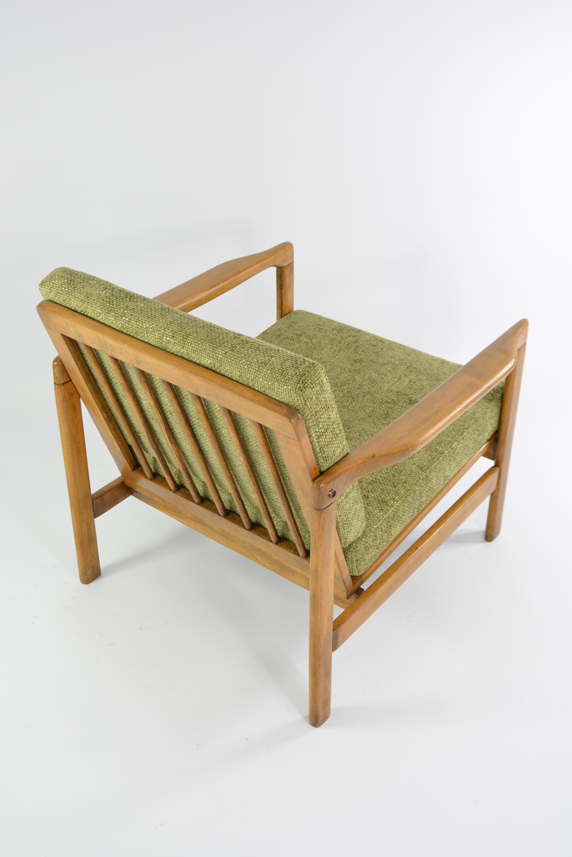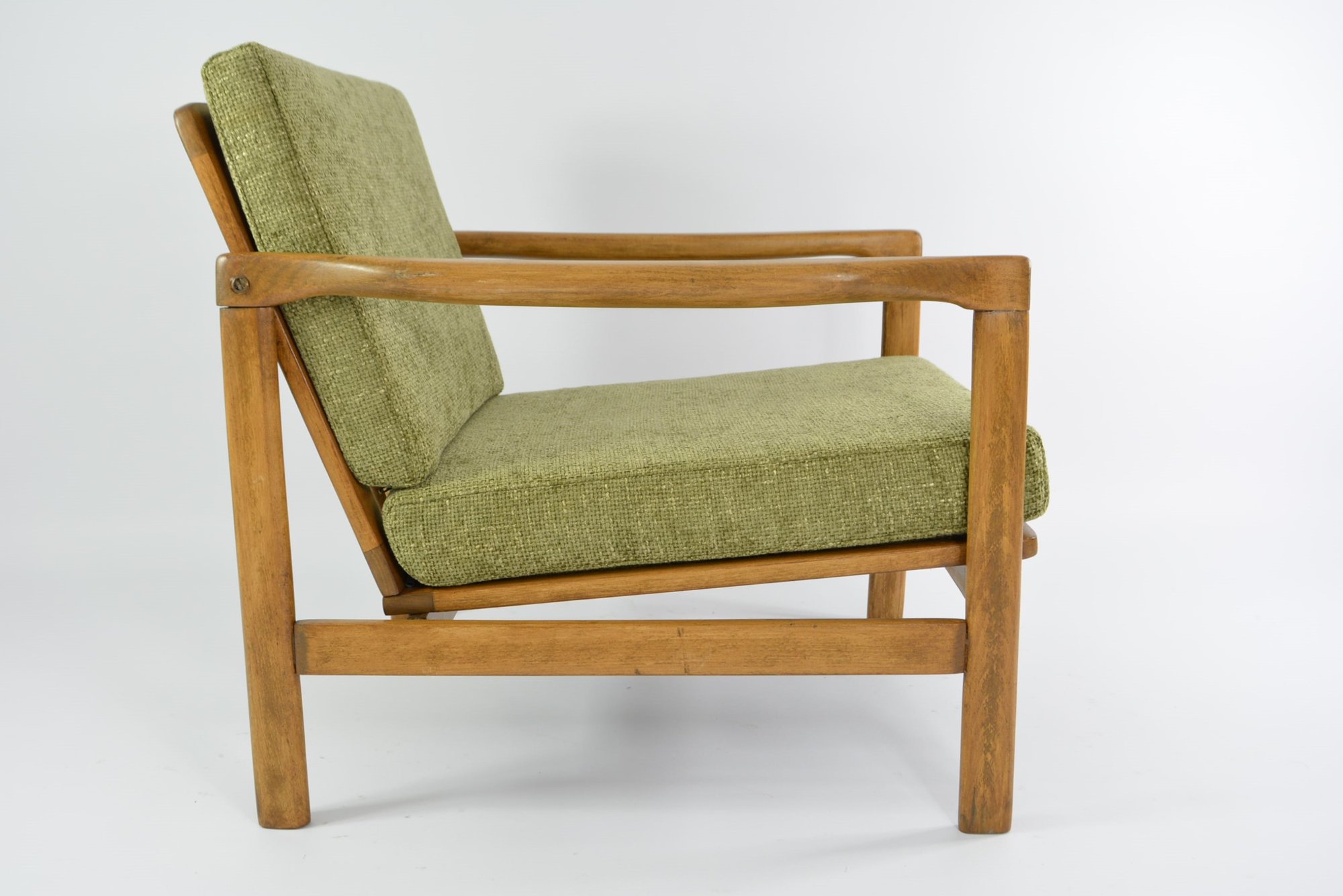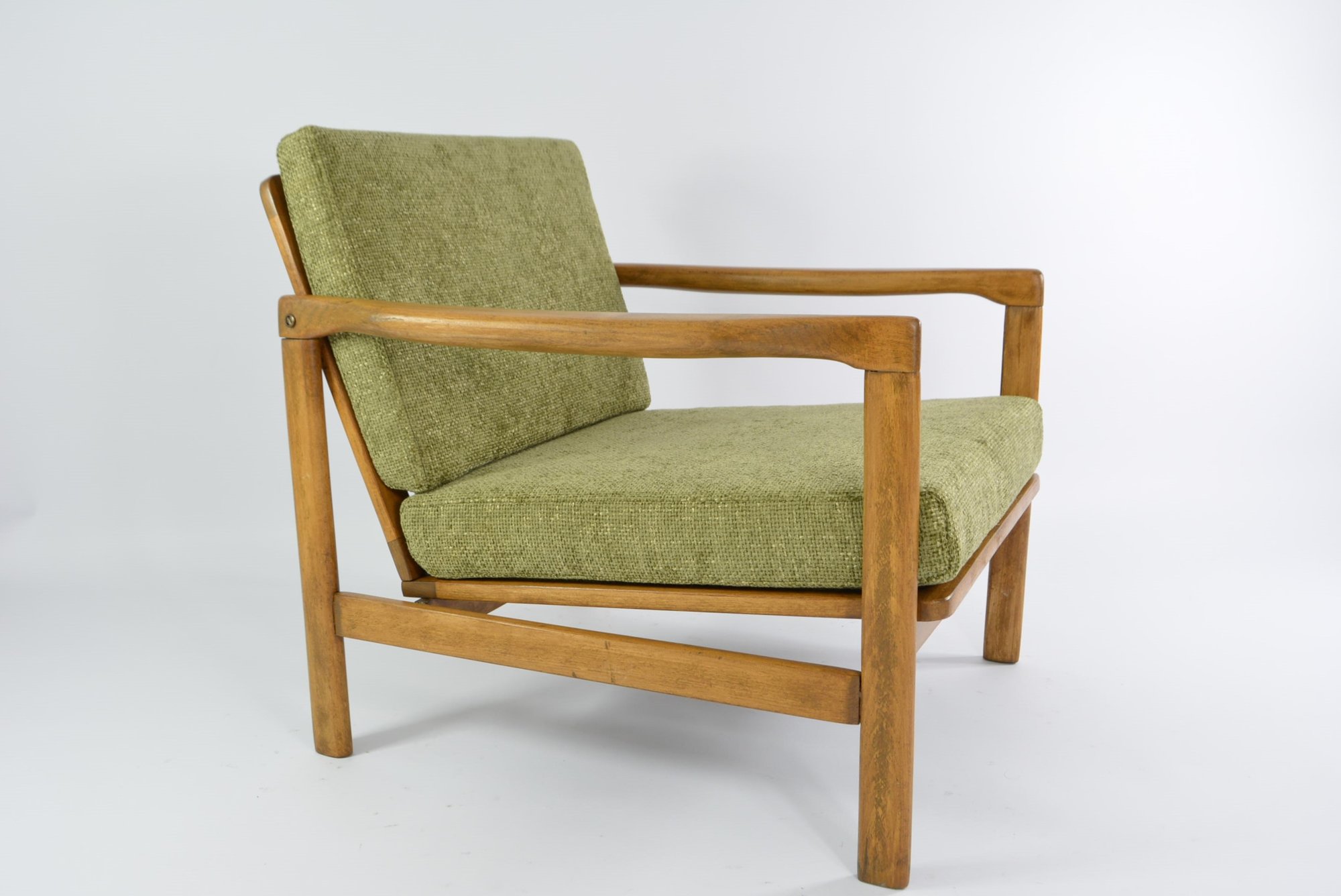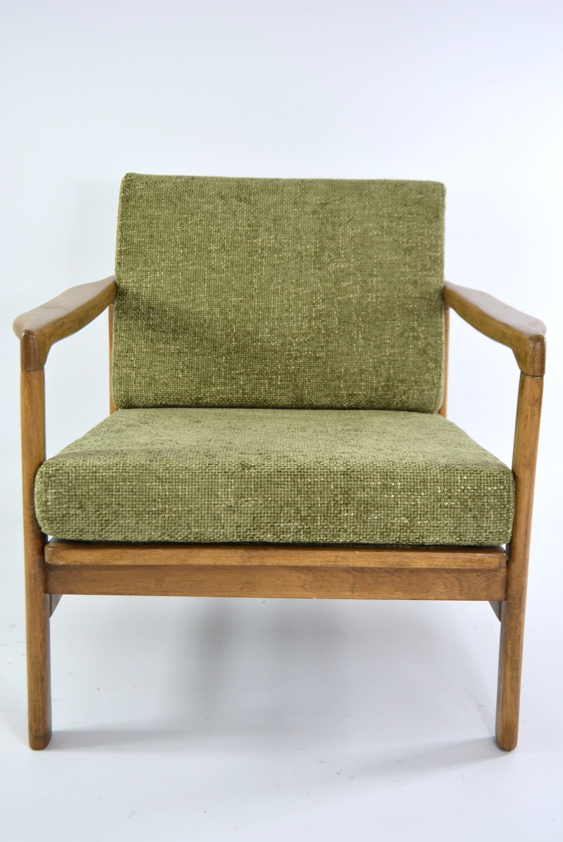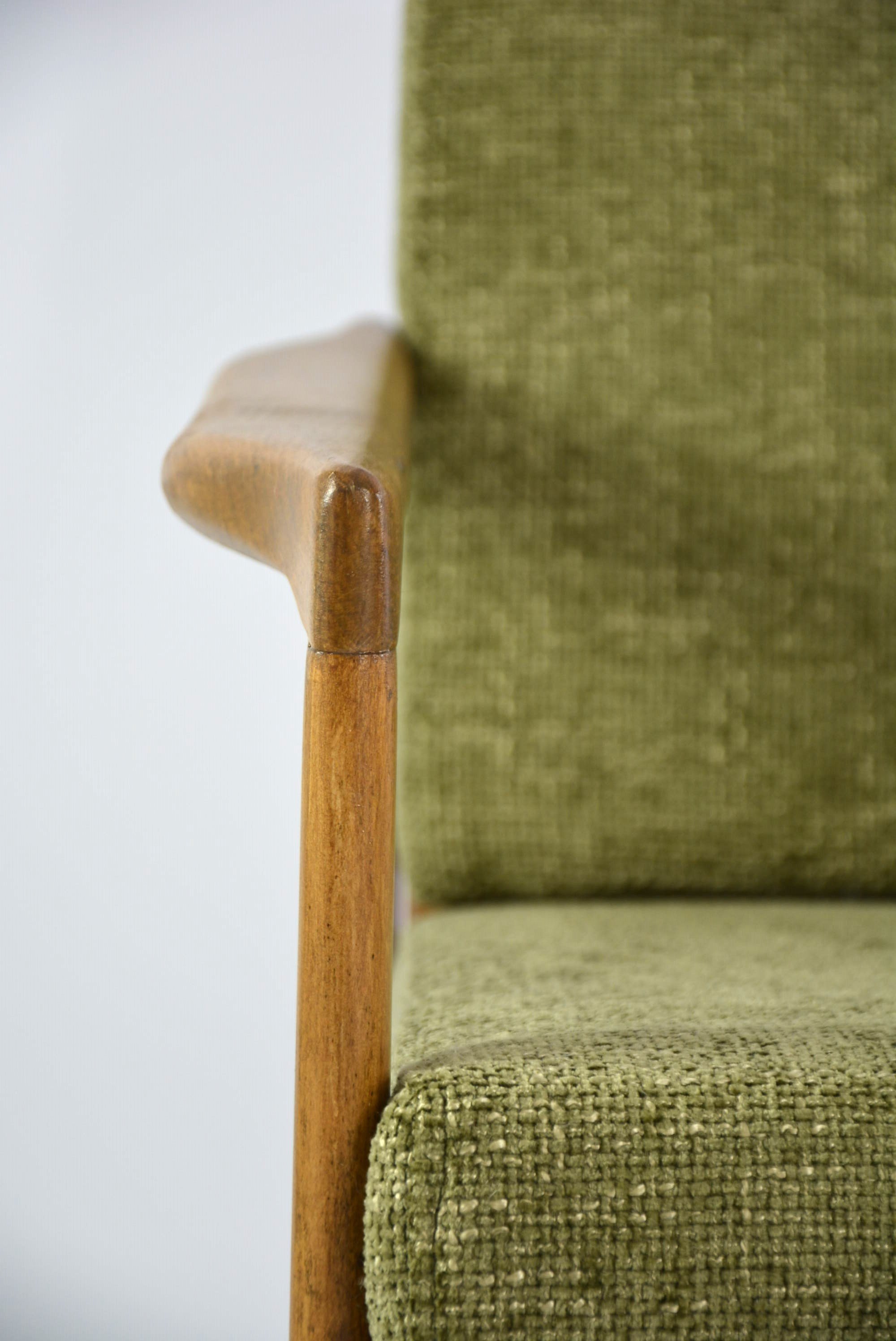 Entièrement restauré: changement intégral des coussins, des ceintures et du bois - couleur chêne. Tissu antitache chiné olive.