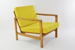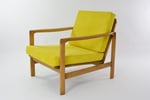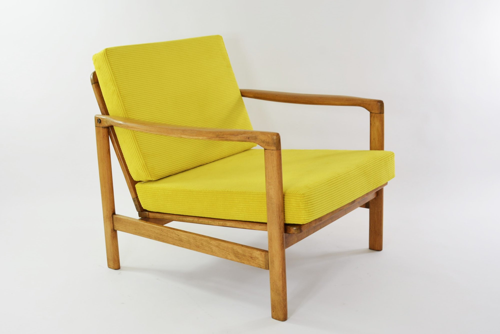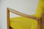 Entièrement restauré: changement intégral des coussins, des ceintures et du bois - couleur chêne moyen. Tissu antitache velours côtelé jaune fluo!