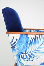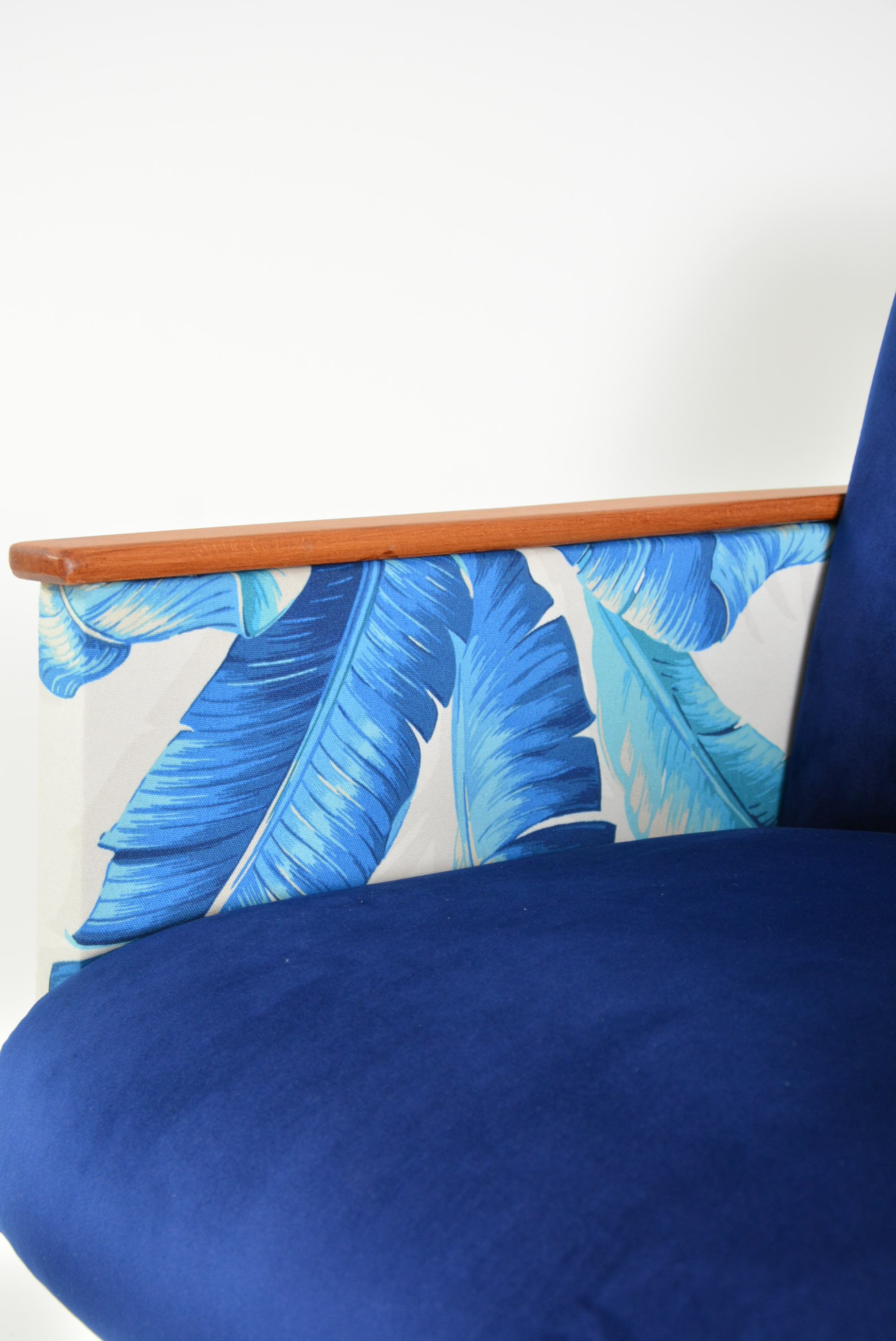 Construction robuste à l’accueil agréable avec le rembourrage en mousses légères et moelleuses. Entièrement restauré et recouvert de 2 types de tissu: velours antitache bleu roi sur l'assise et le tissu à motif feuilles sur les accoudoirs.