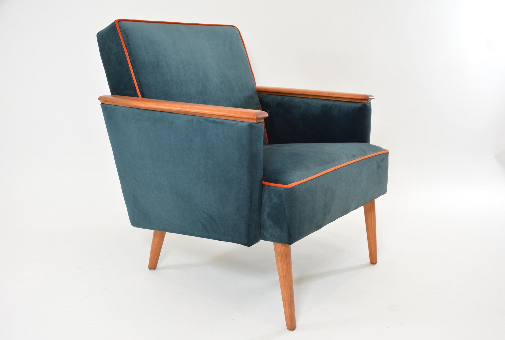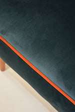Construction robuste à l’accueil agréable avec le rembourrage en mousses légères. Entièrement restauré et recouvert d'un tissu pétrole avec le passe poil orange.