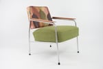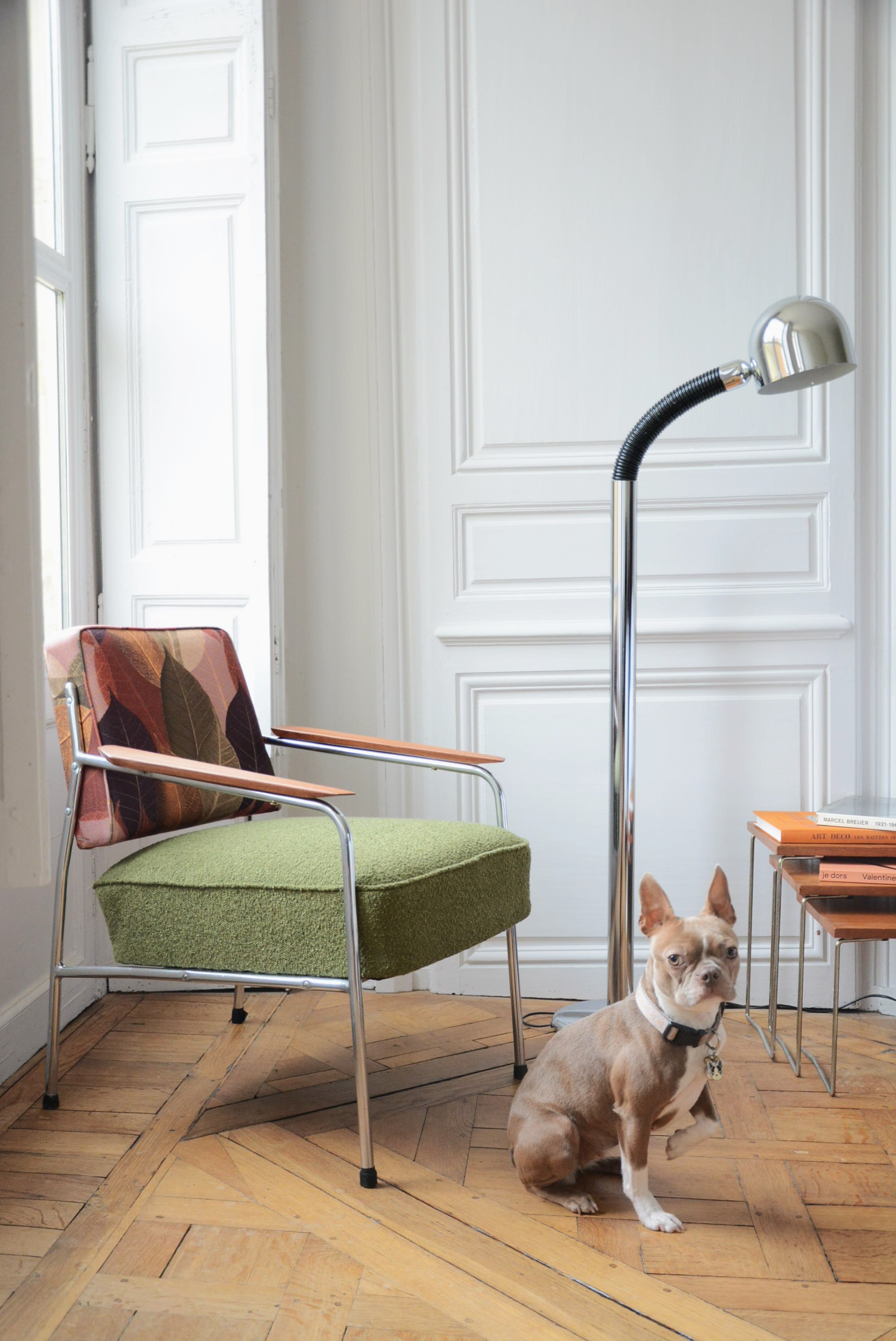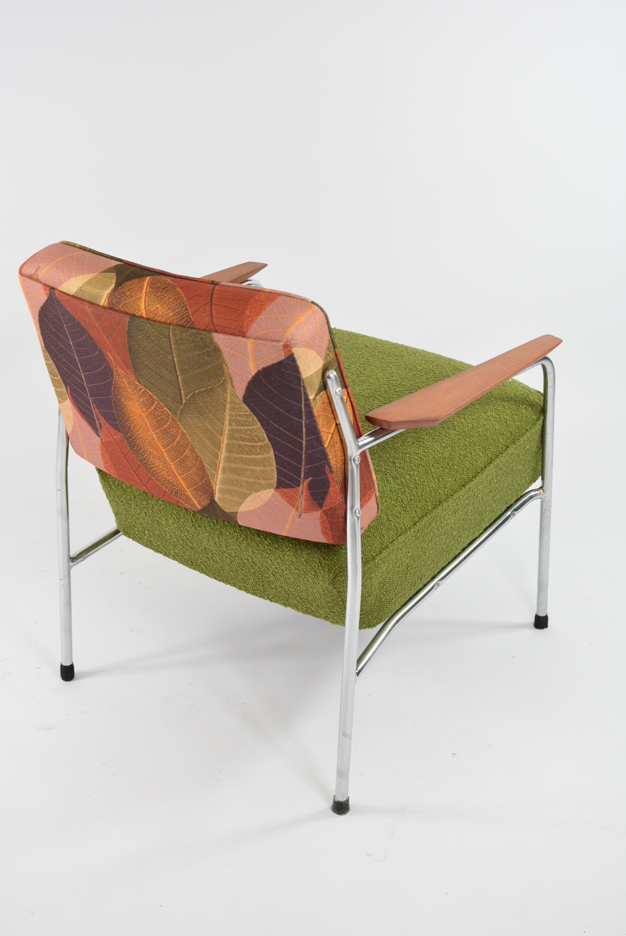 Fauteuils entièrement restaurés: garniture, ceintures, mix tissus avec la bouclette antitache verte sur l'assise et le tissu à motif feuilles d'automne sur le dossier. Parties chromé en très bon état.