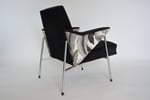 Fauteuil entièrement restauré: garniture, ceintures, tissus mix avec le velours noir semi mat antitache et le tissu à motifs feuilles tropicales, antitache également.. Parties chromées en bon état ont été nettoyées.