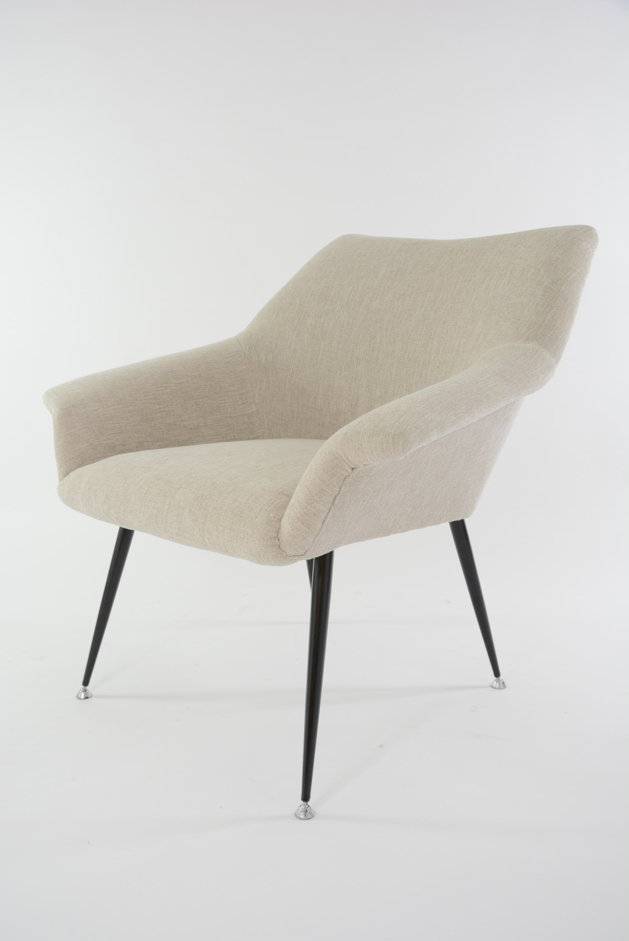 Fauteuil entièrement restauré: garniture, ceintures, tissu chiné beige et crème, lavable.