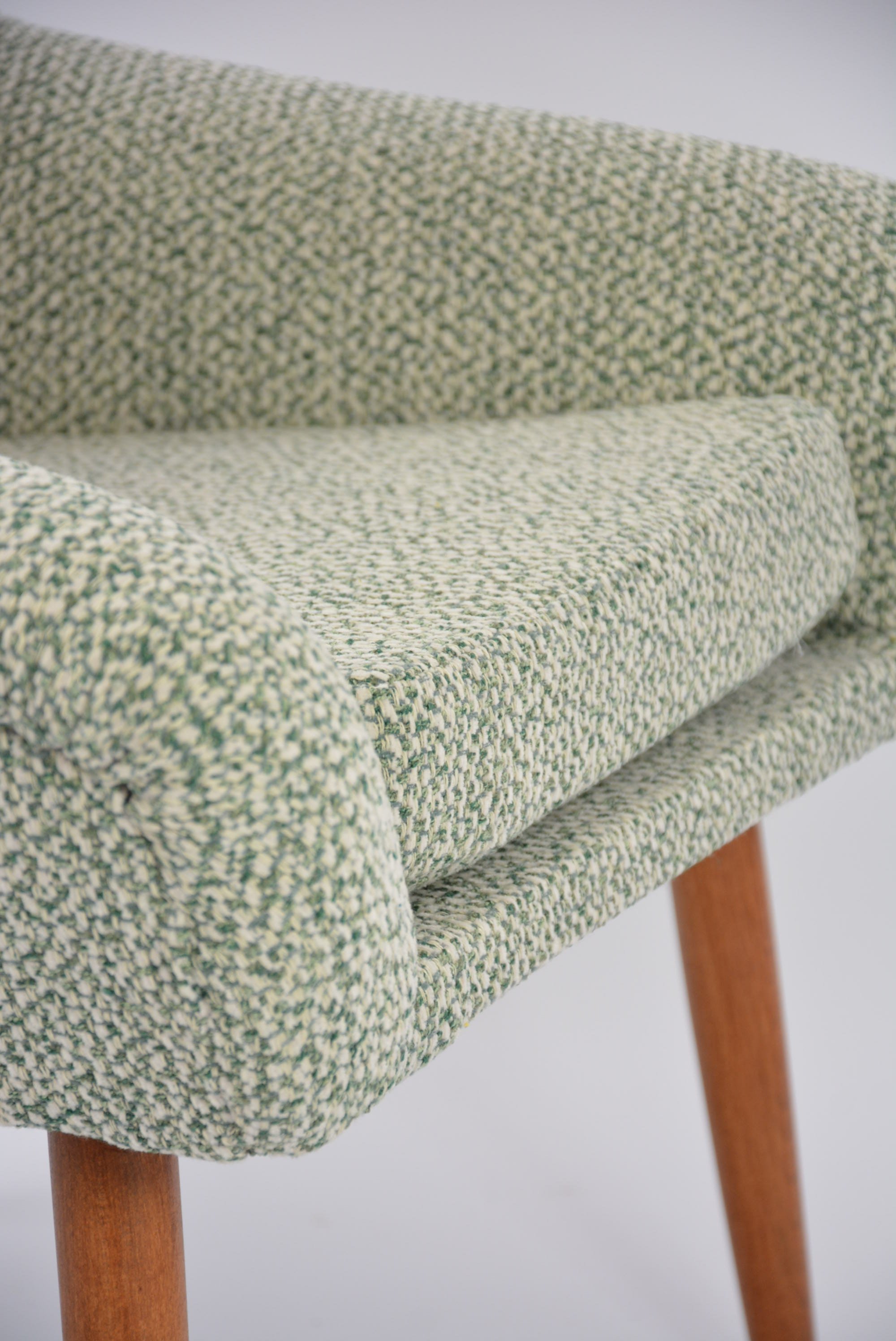 Fauteuil entièrement restauré: garniture, ceintures, tissu chiné vert/beige/blanc antitache. Coussin de l'assise amovible et lavable (zippes).
