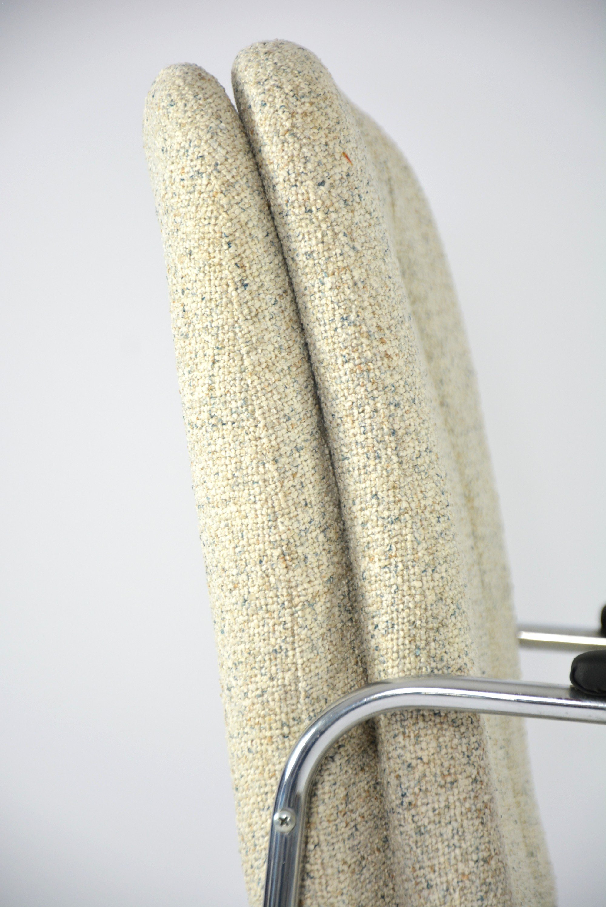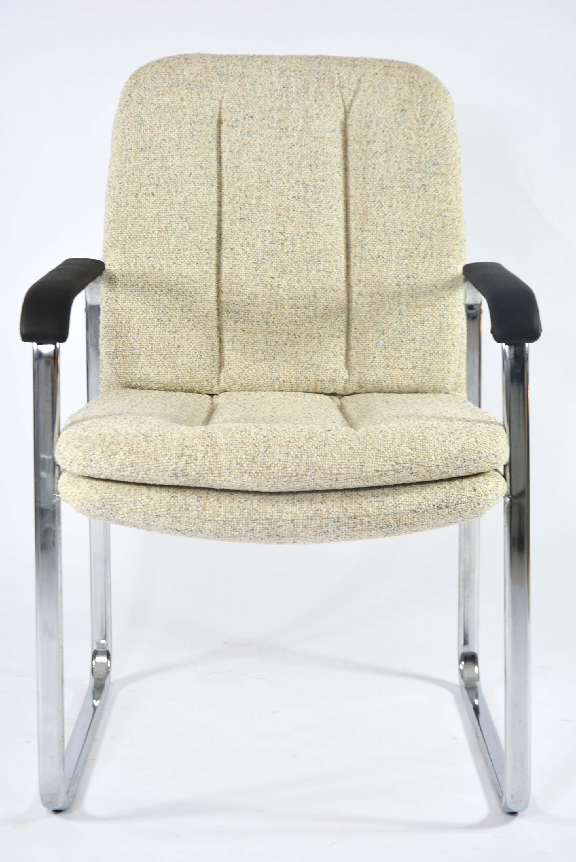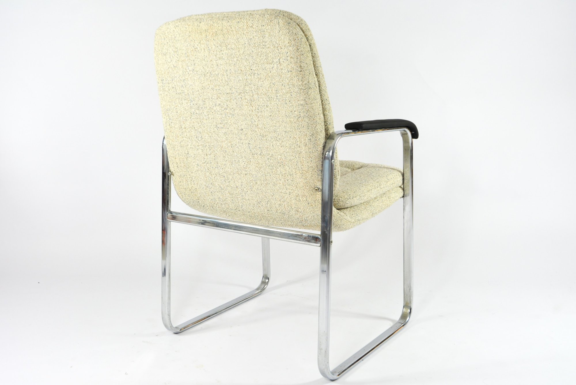 Très rarement dans nos collections. Deux très confortables fauteuils (RESTE UN FAUTEUIL!!!) de bureau, mais pas seulement, à la structure chromé et les accoudoirs en skaï noir mat!