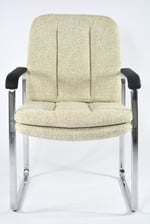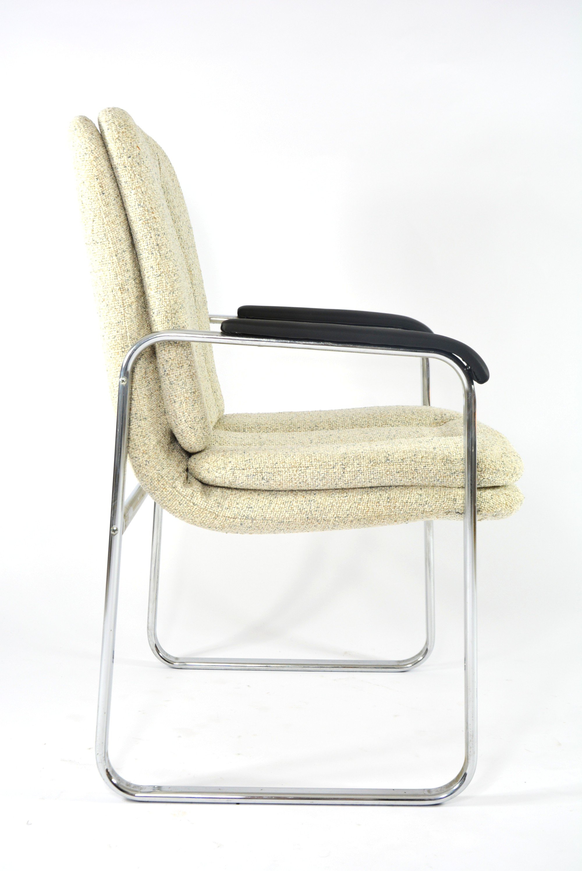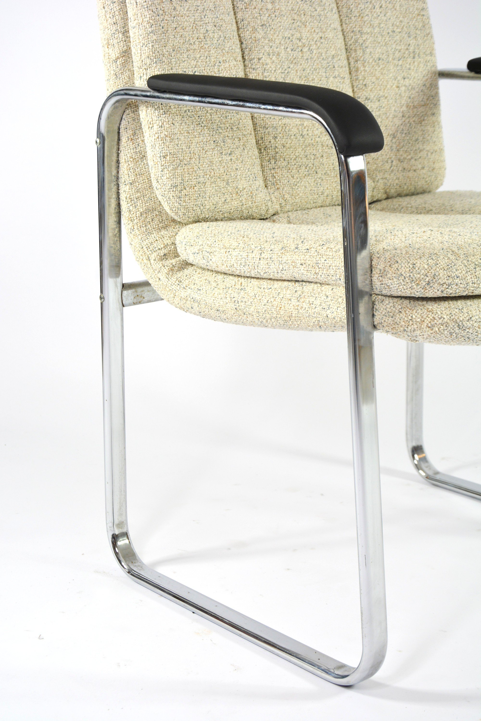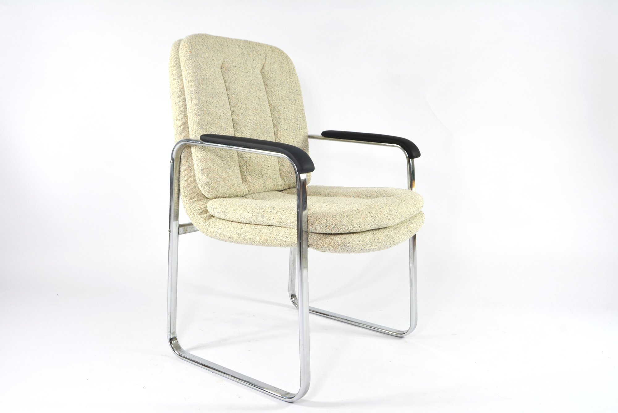 Très rarement dans nos collections. Deux très confortables fauteuils (RESTE UN FAUTEUIL!!!) de bureau, mais pas seulement, à la structure chromé et les accoudoirs en skaï noir mat!