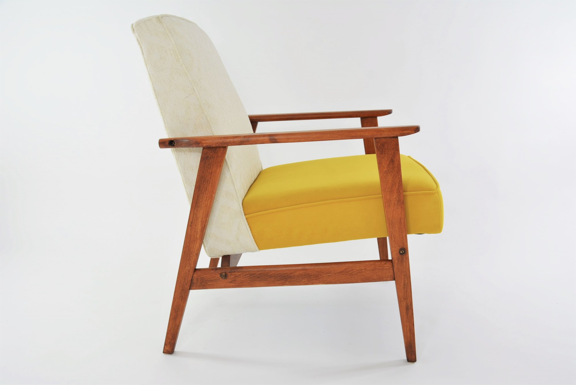 Entièrement restauré. Tissu velours mat jaune antitache sur l'assise et le tissu chiné à motif géomatique sur le dossier.