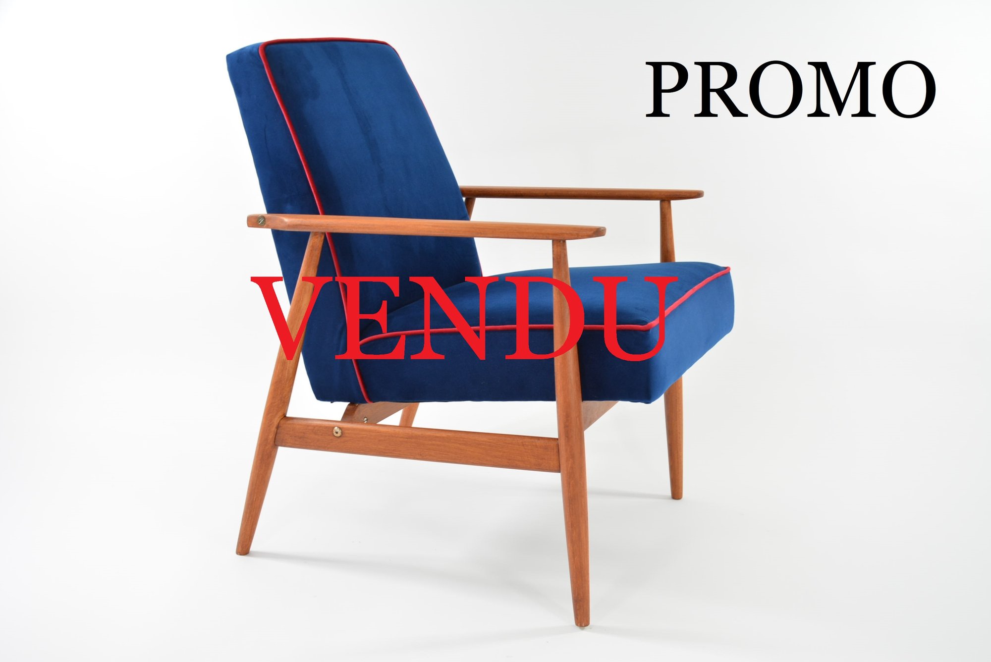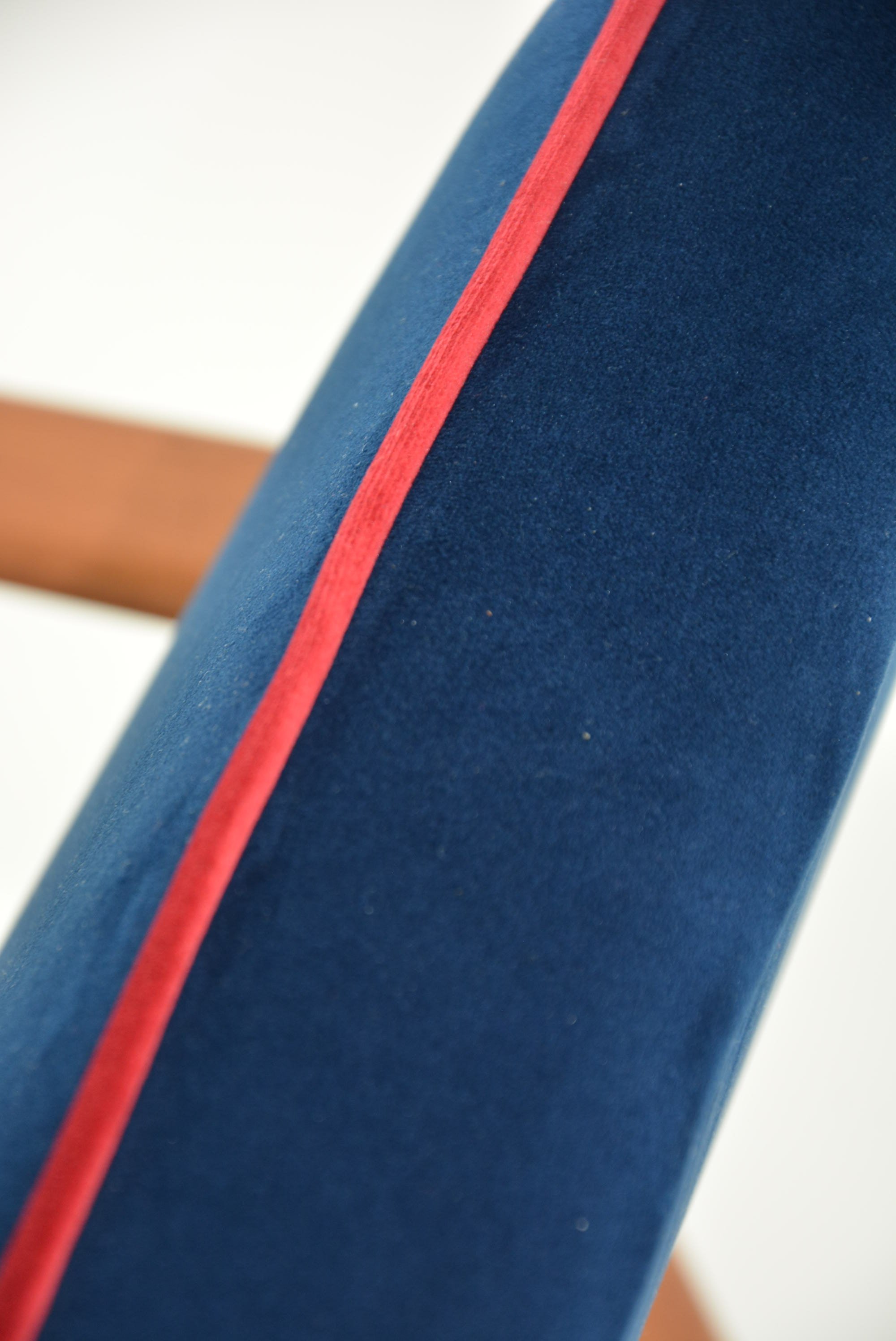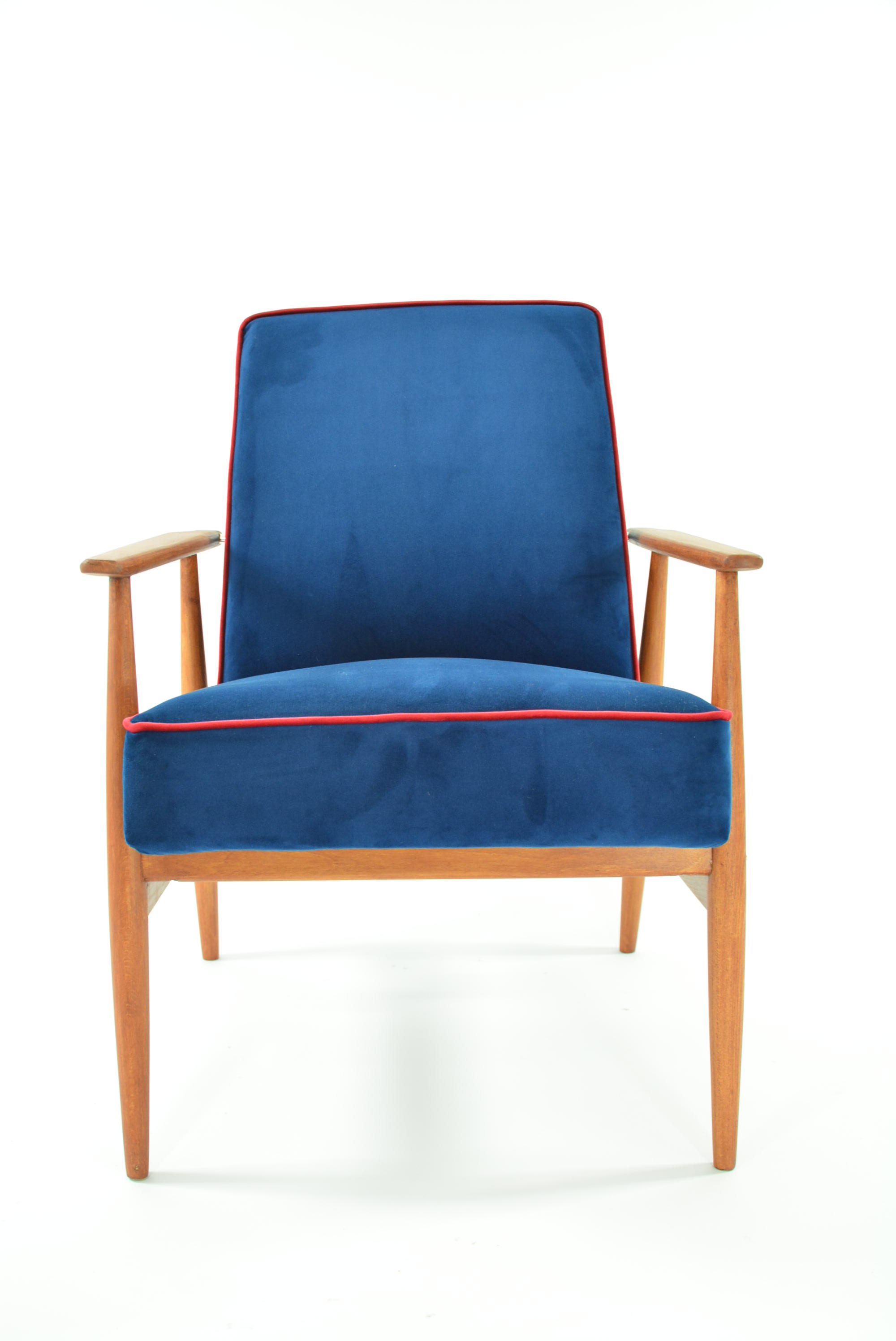 Entièrement restauré. Tissu velours bleu roi avec le passe poil rouge. Beau vernis teck brun/ aspect ciré satin/ avec la structure de bois poncée et revernie.