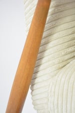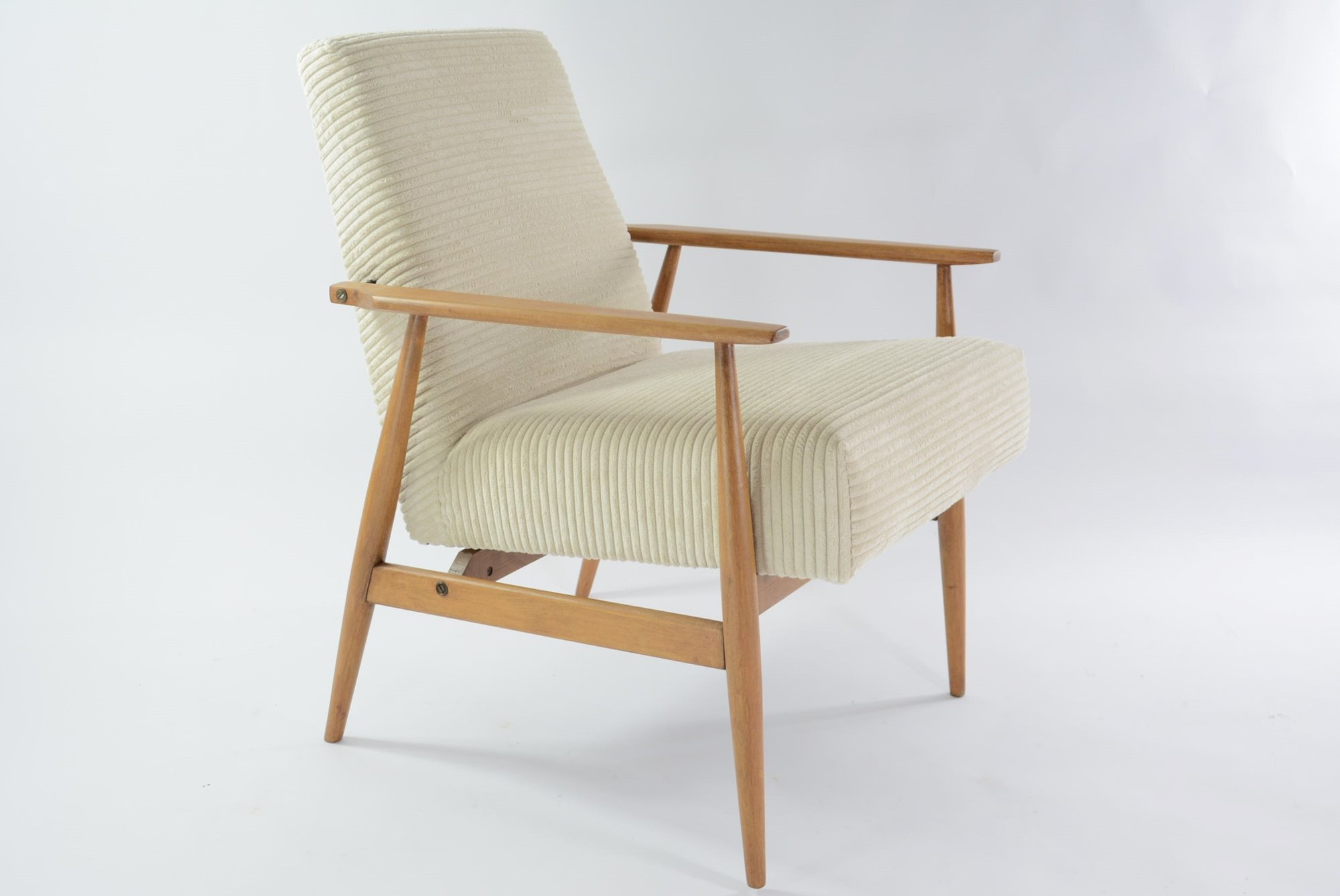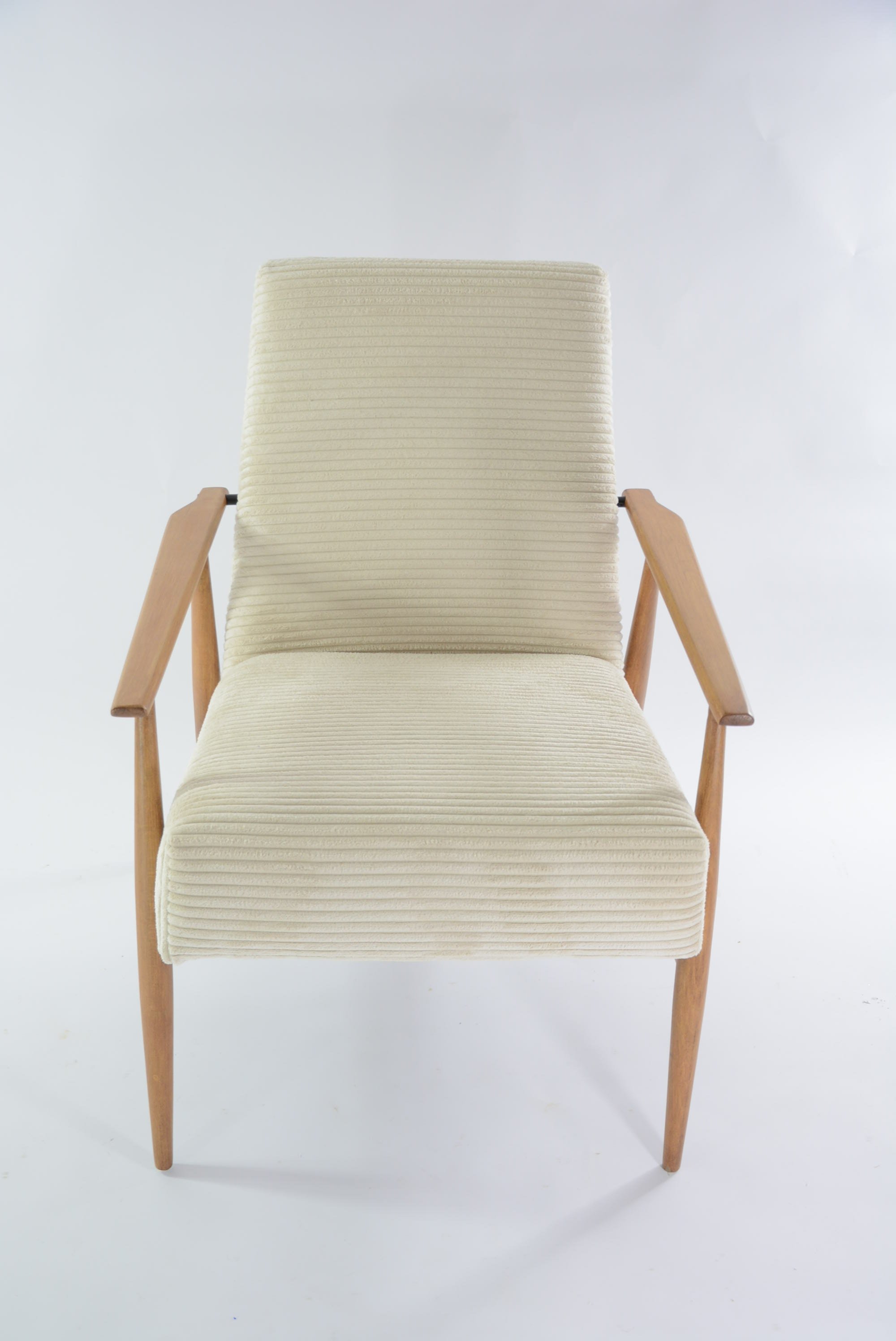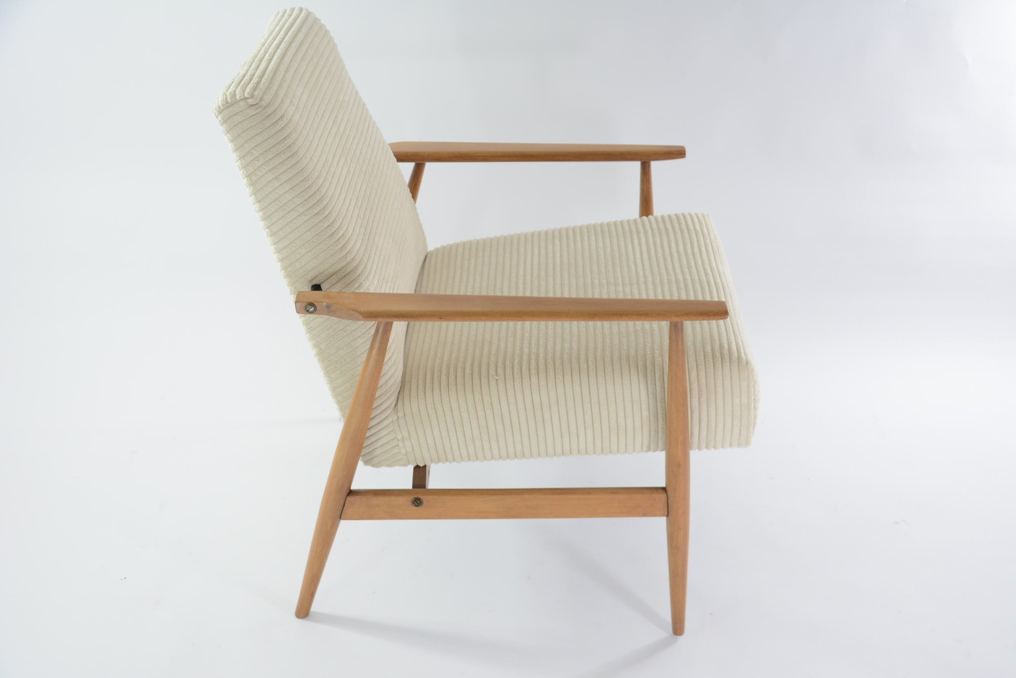 Entièrement restauré. Tissu velours côtelé crème, antitache. Beau vernis teck/ aspect ciré satin/ avec la structure de bois poncée et revernie.