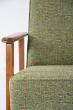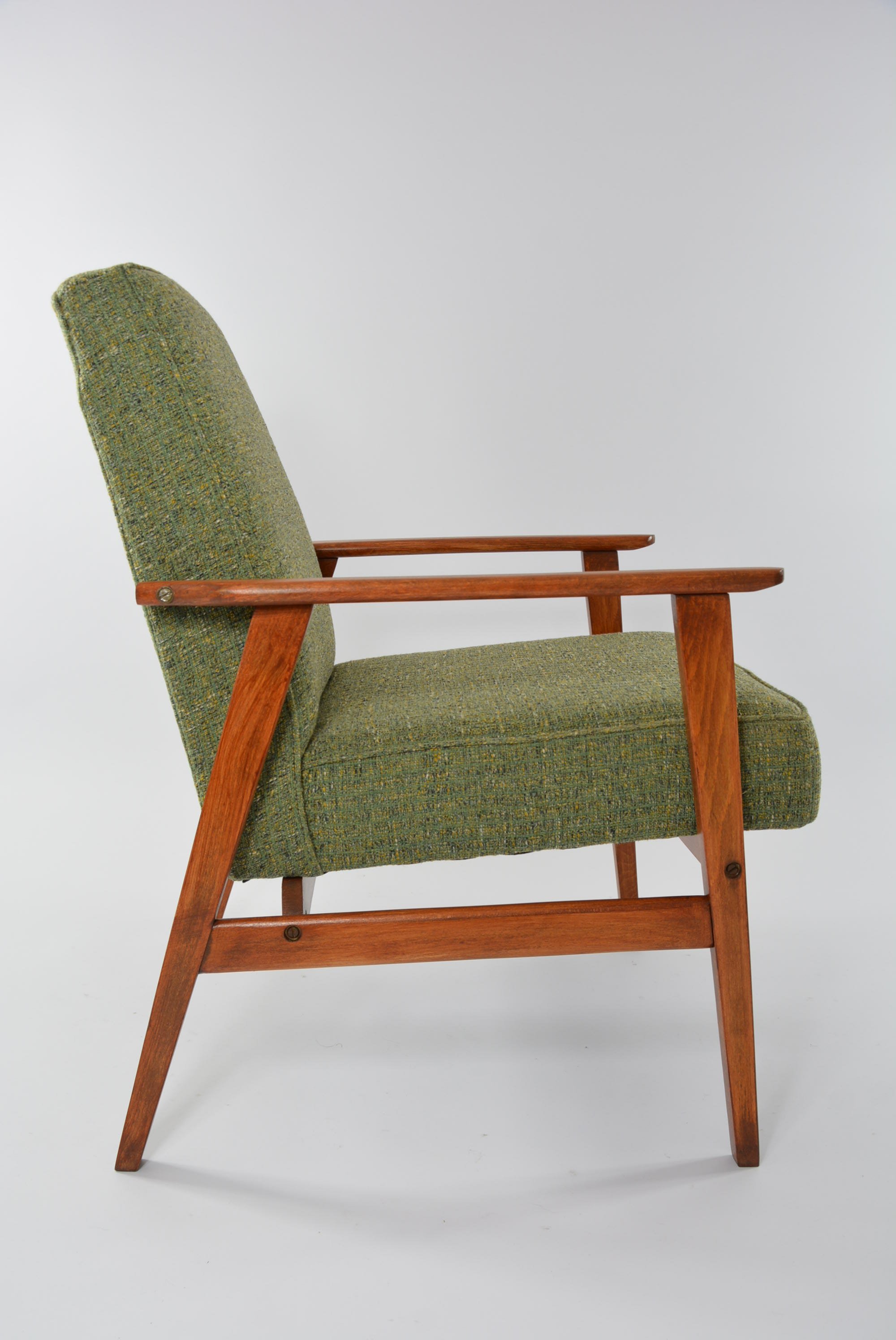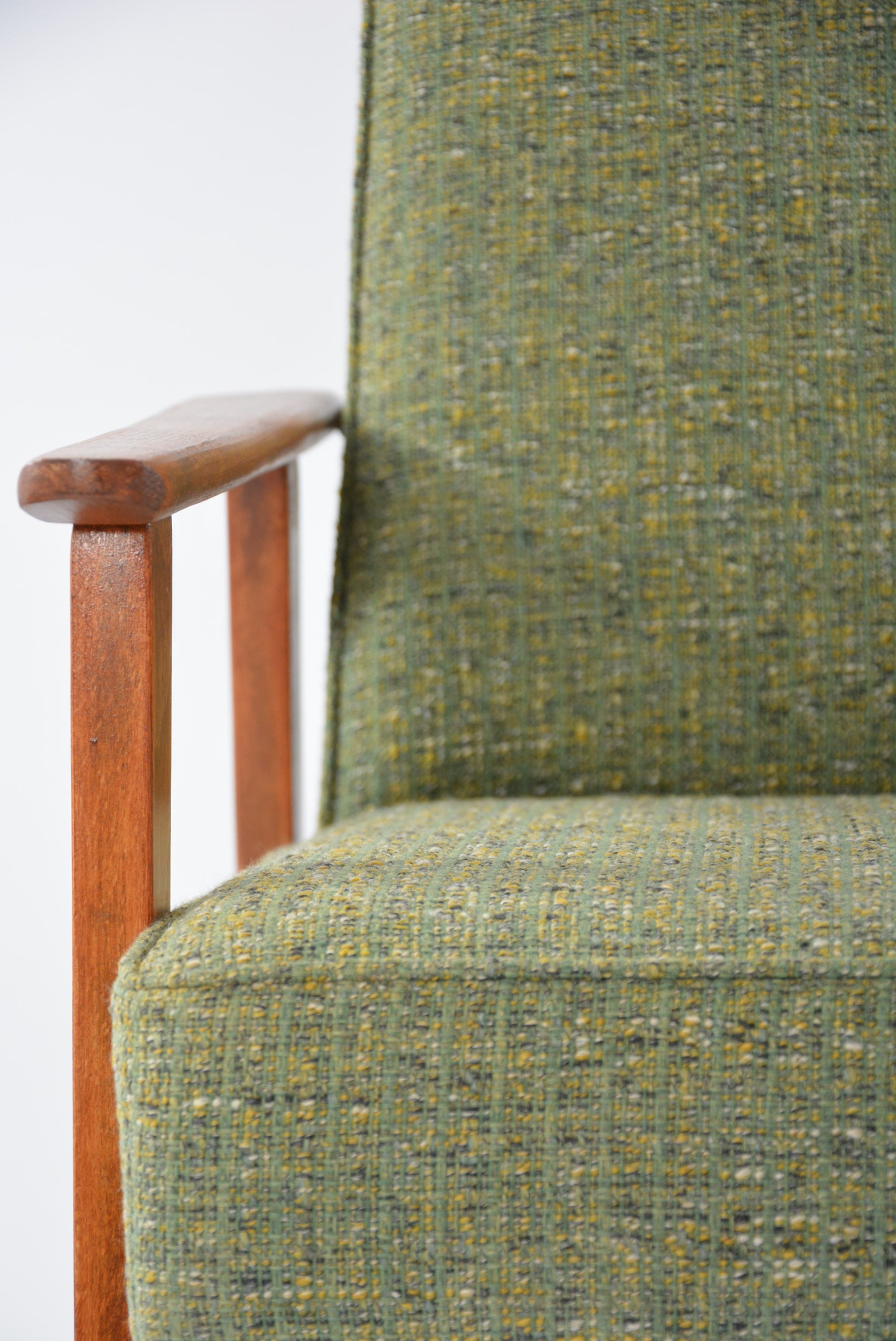 Entièrement restauré. Tissu vert chiné avec la touche de l'ivoire et jaune. Le passe poil autour de l'assise. Beau vernis teck brun/ aspect ciré satin/ avec la structure de bois poncée et revernie.