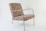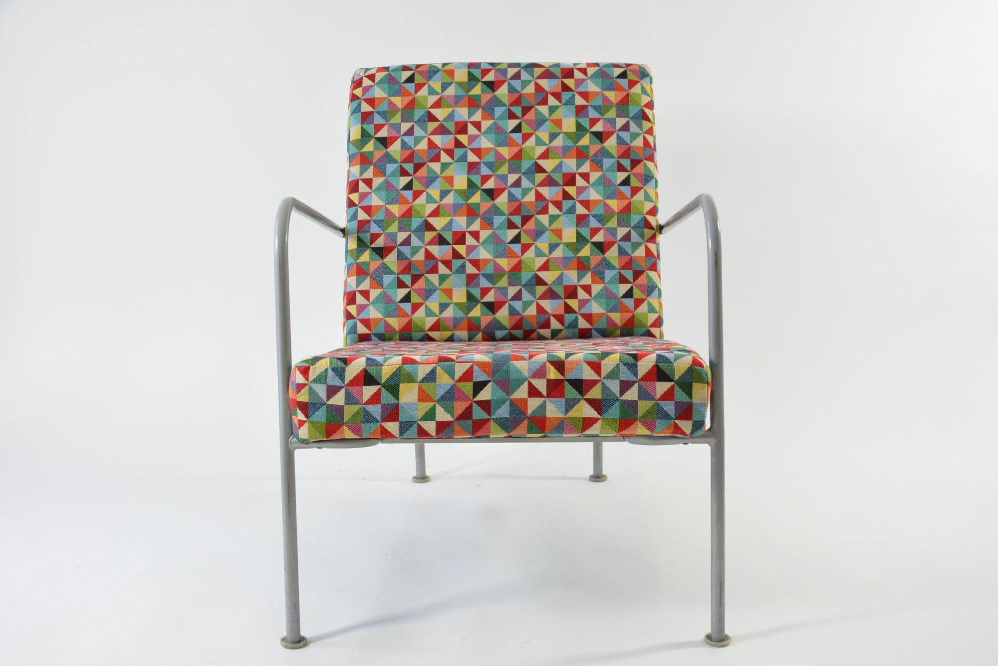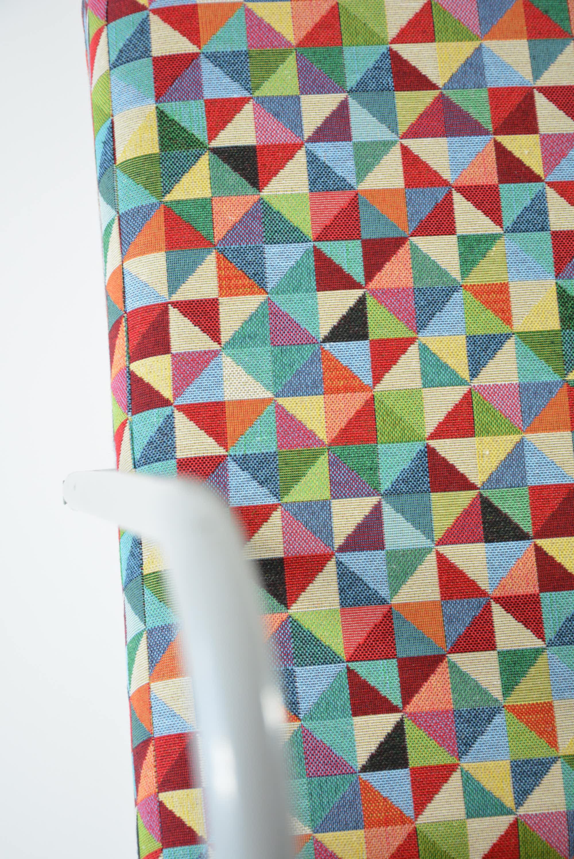 Voici le fauteuil PS de la première édition des années 90 que nous avons entièrement restauré en tissu coloré à motifs géométriques.