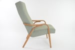Fauteuil entièrement rénové en gardant ses finitions d'origine: garniture, bois (teck roux). Tissu chiné vert et bleu.