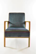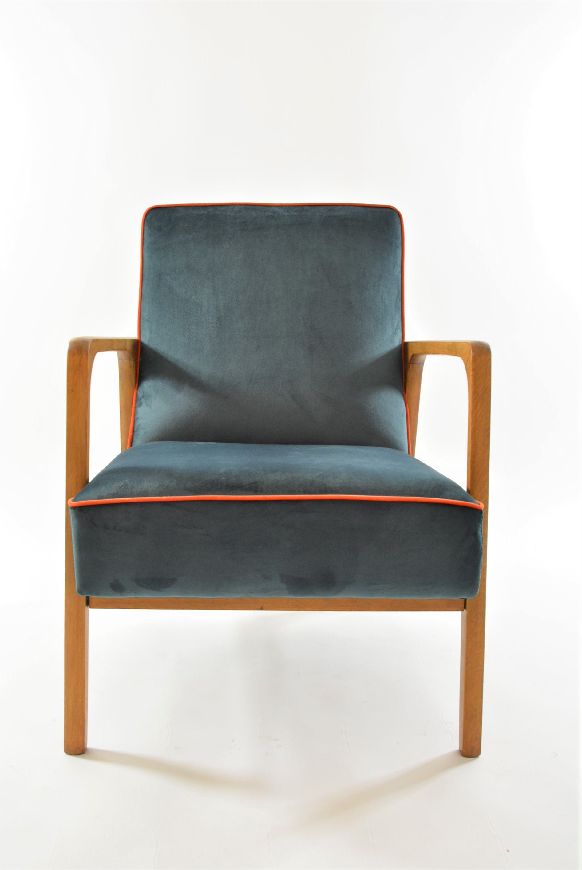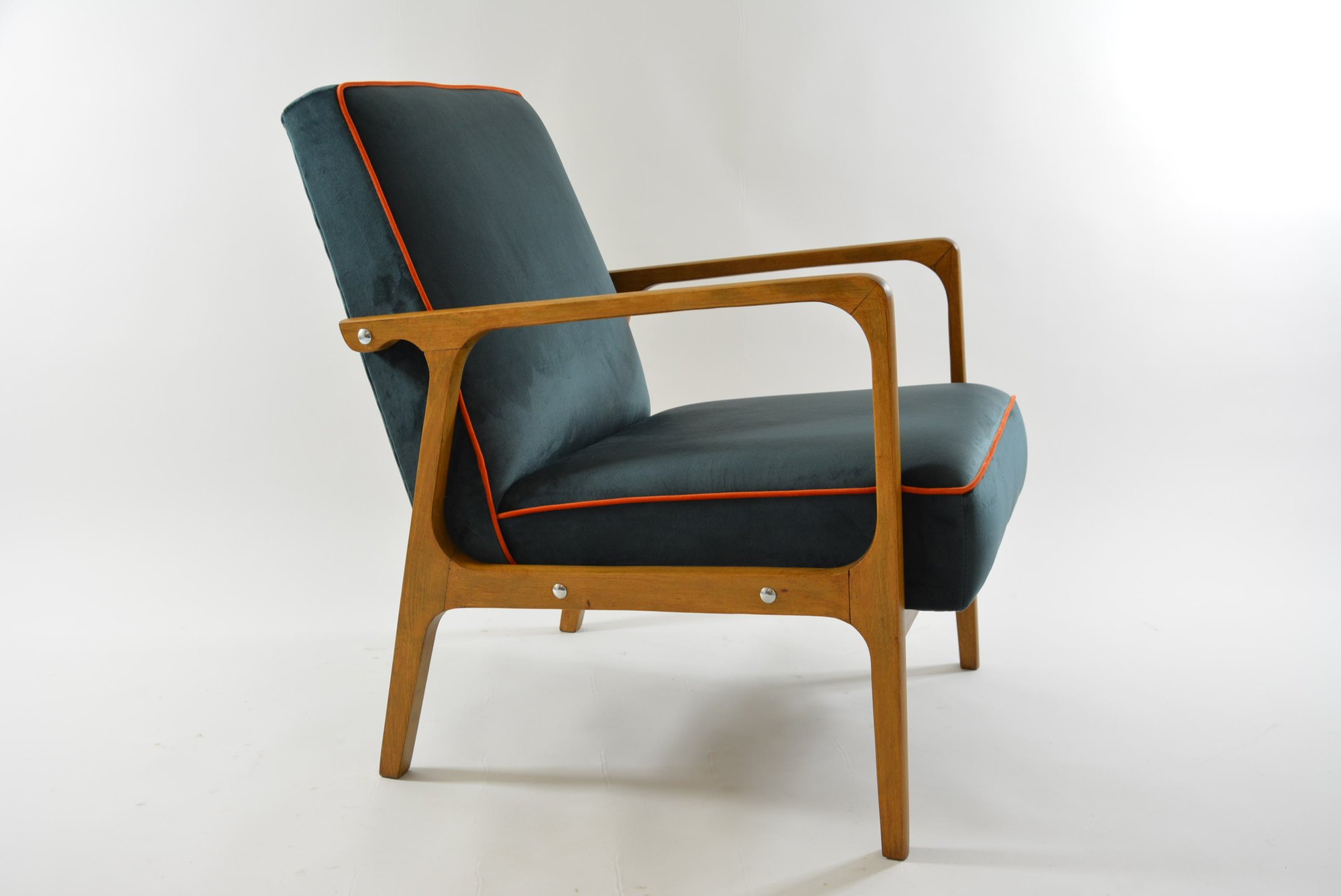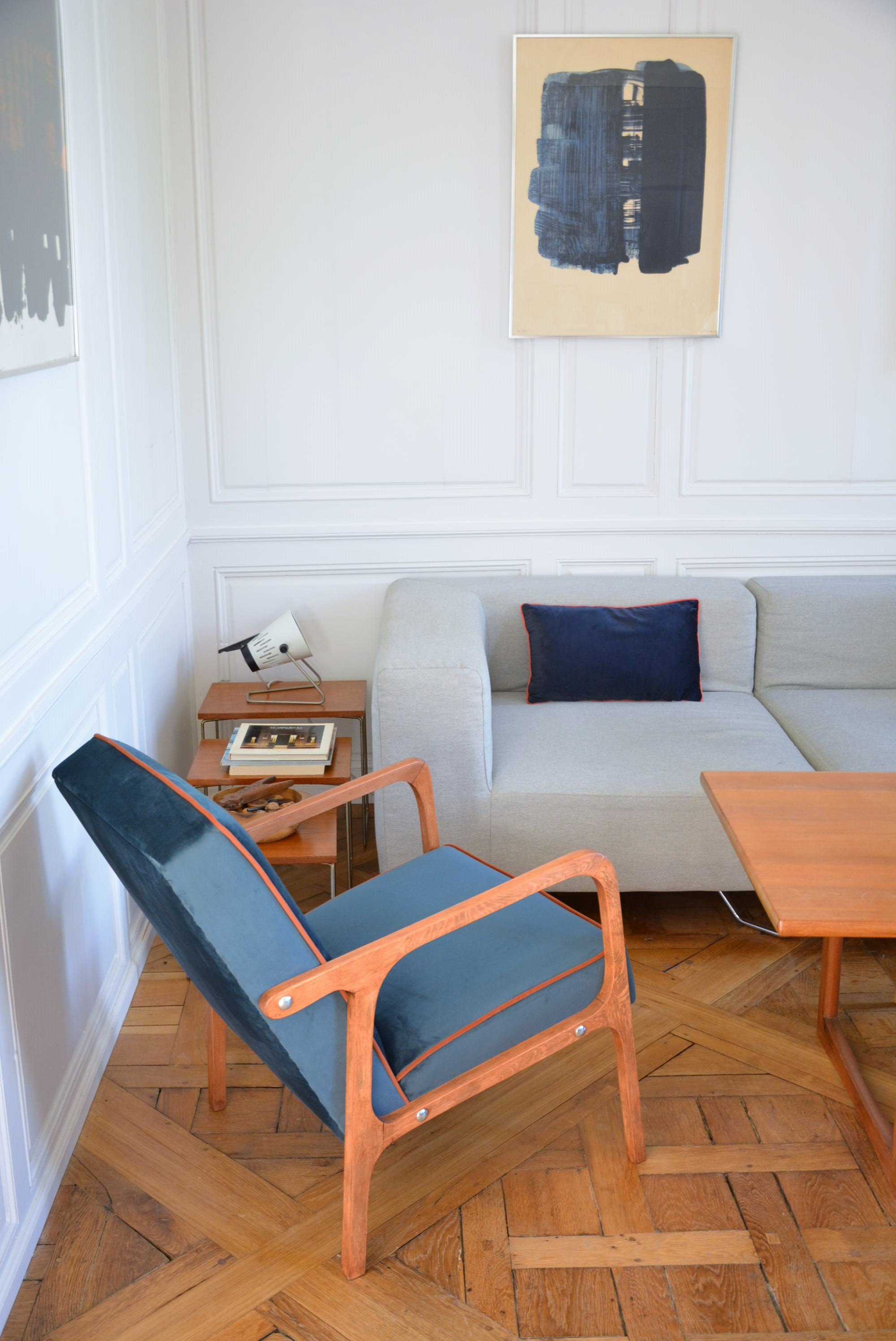 Restauration intégrale des partis bois et de l'assise recouverte d'un magnifique tissu velours antitache bleu nuit avec le passe poil terracotta (plus foncé que sur les photos) de l'assise.
