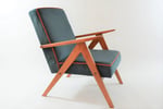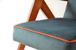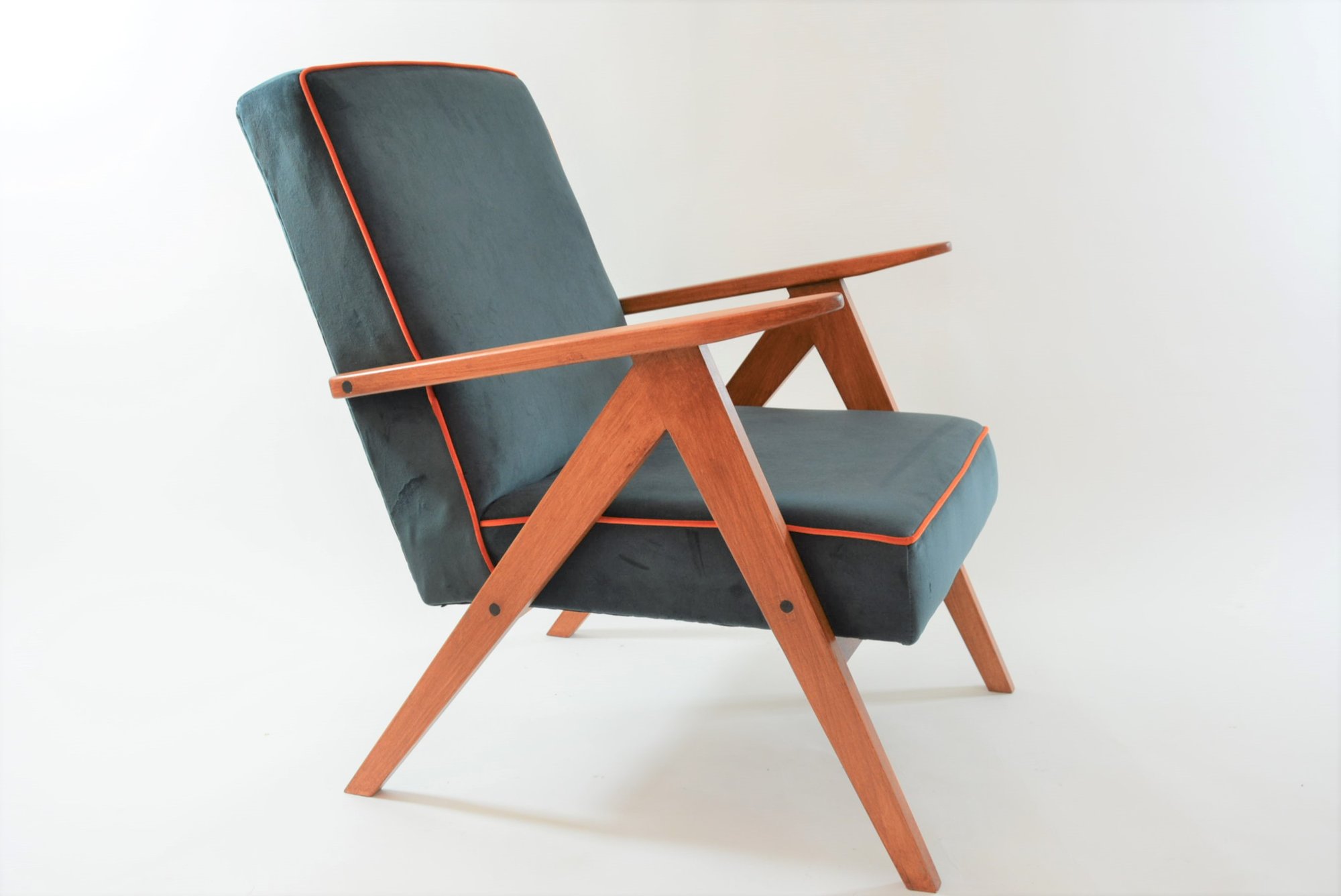 Rénovation intégrale originale : tissu velours bleu pétrole avec le passe poil orange autour de l'assise. Bois couleur teck naturel.