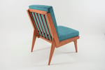 Lignes simples avec les détails typiques des années 70 comme le dossier à lattes et le piètement compas.