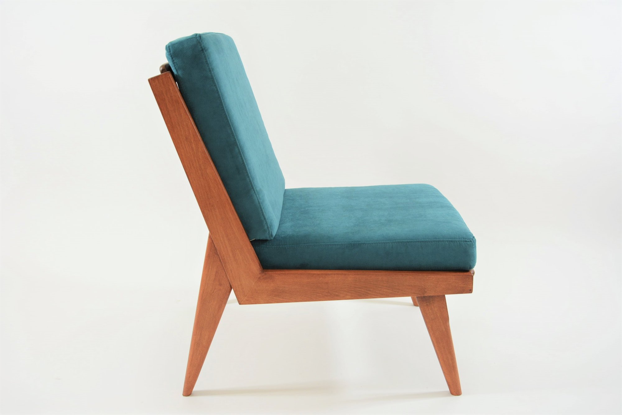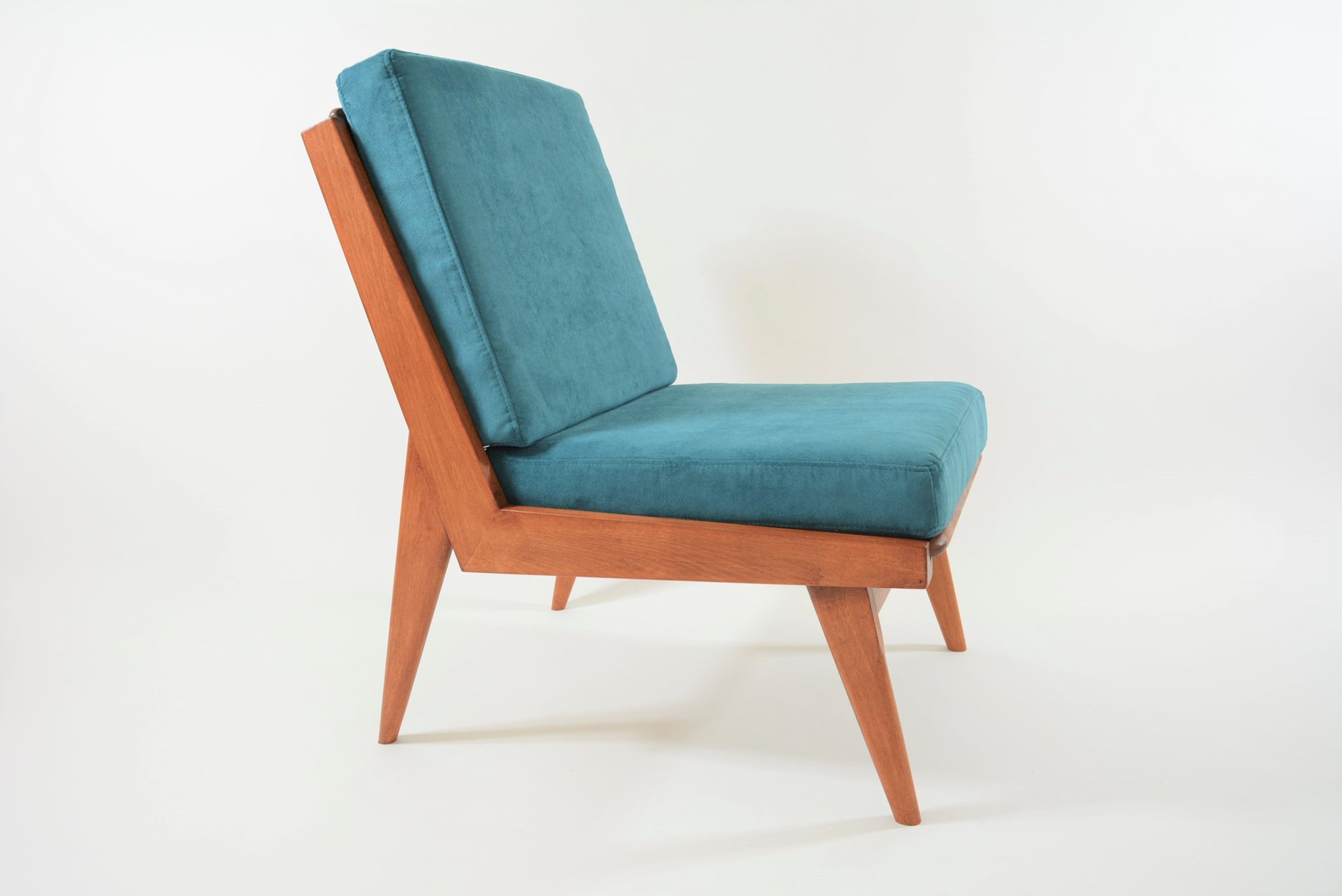 Rénovation intégrale incluant la création des coussins -mousses confortables et tissu bleu pétrole clair très doux, antitache. Coussins déhoussables.
