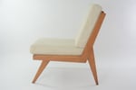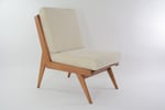 Lignes simples avec les détails typiques pour l'époque comme le dossier à lattes et le piètement compas.