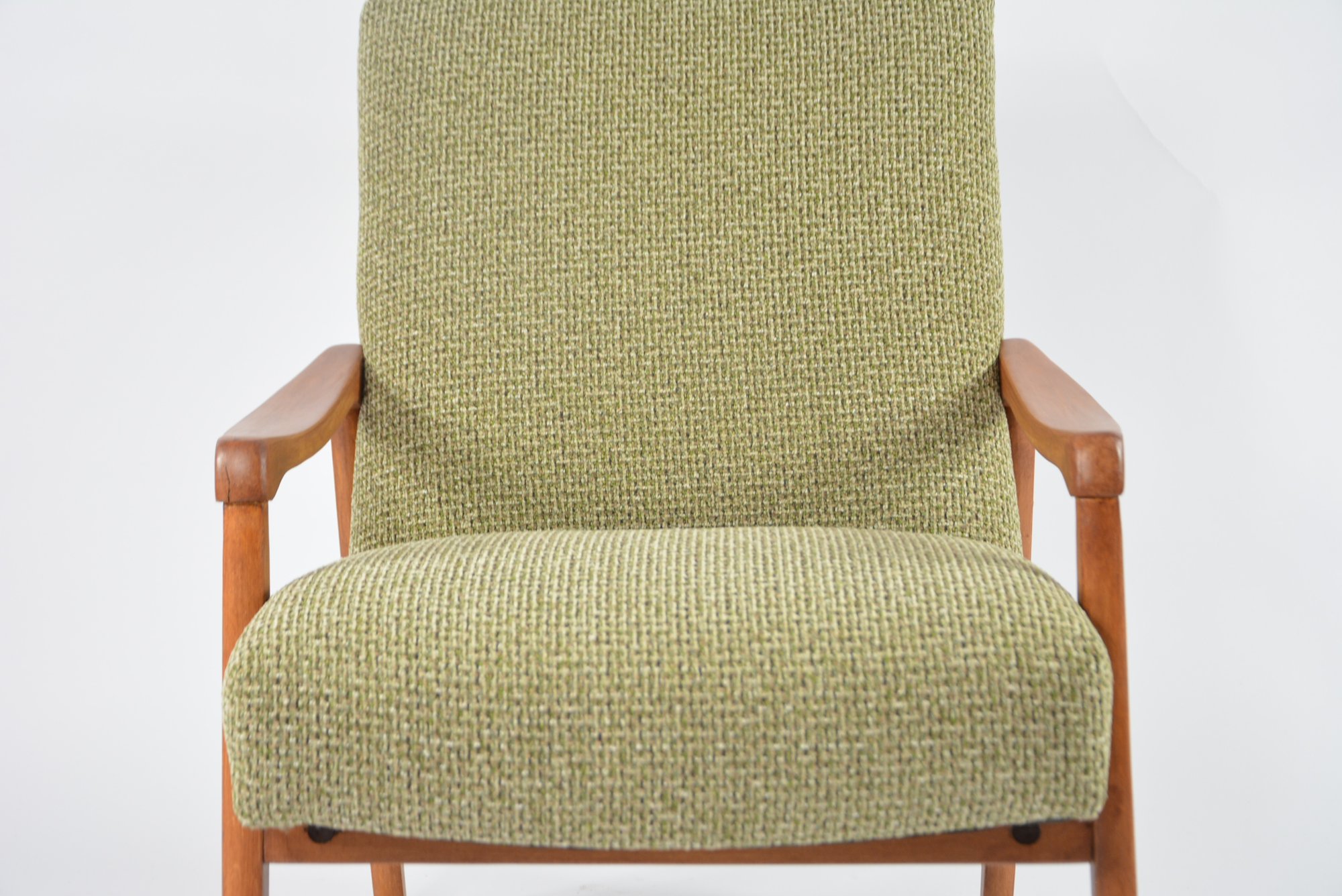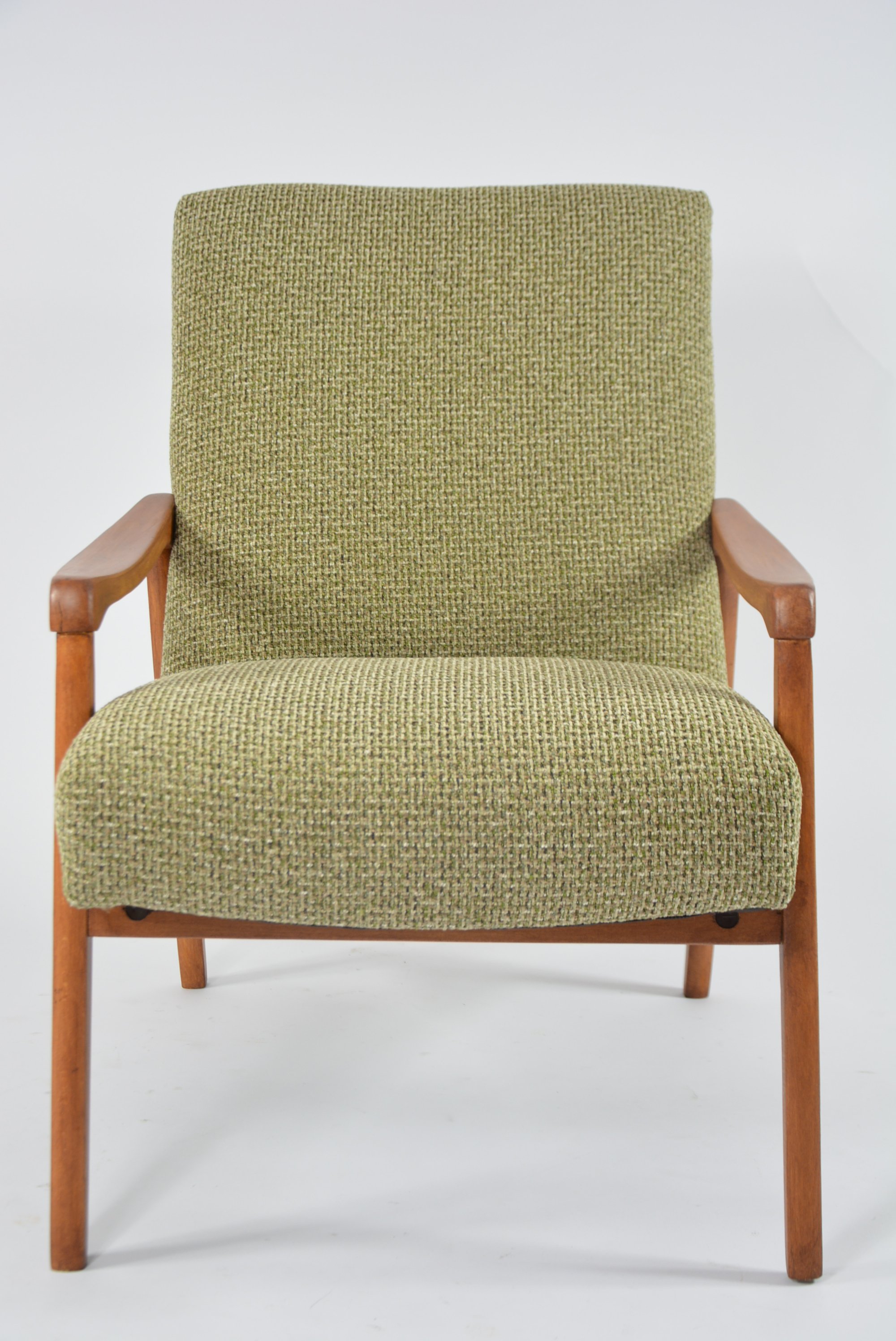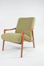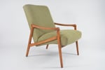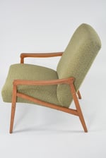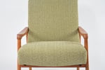 Fauteuil entièrement rénové en gardant les finitions à l’origine: garniture, bois (teck roux). Tissu chiné vert/beige/moutarde.