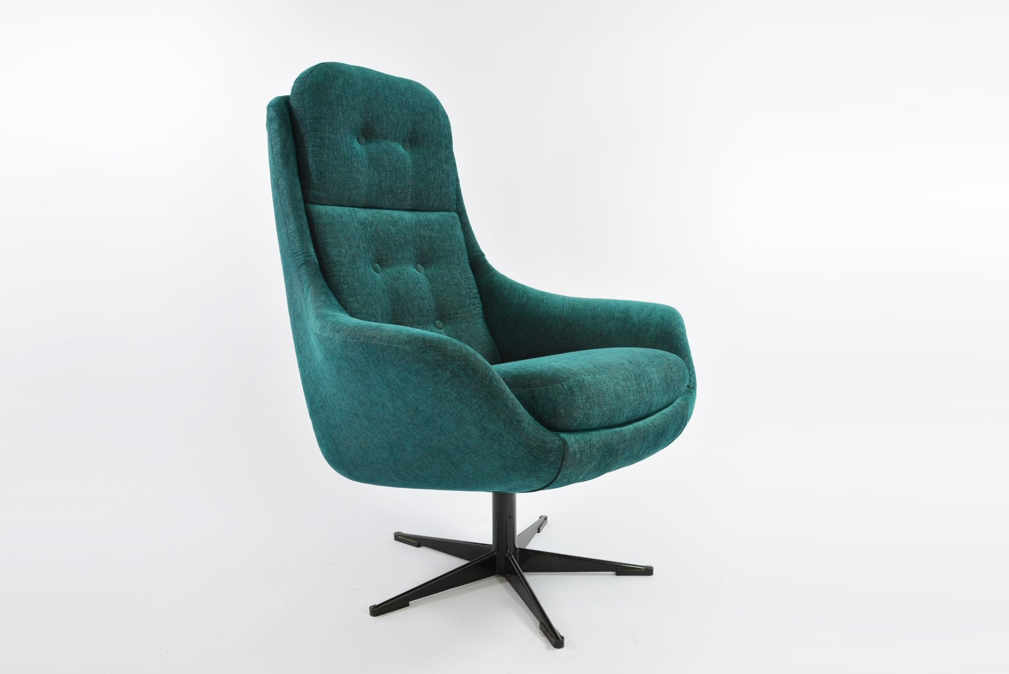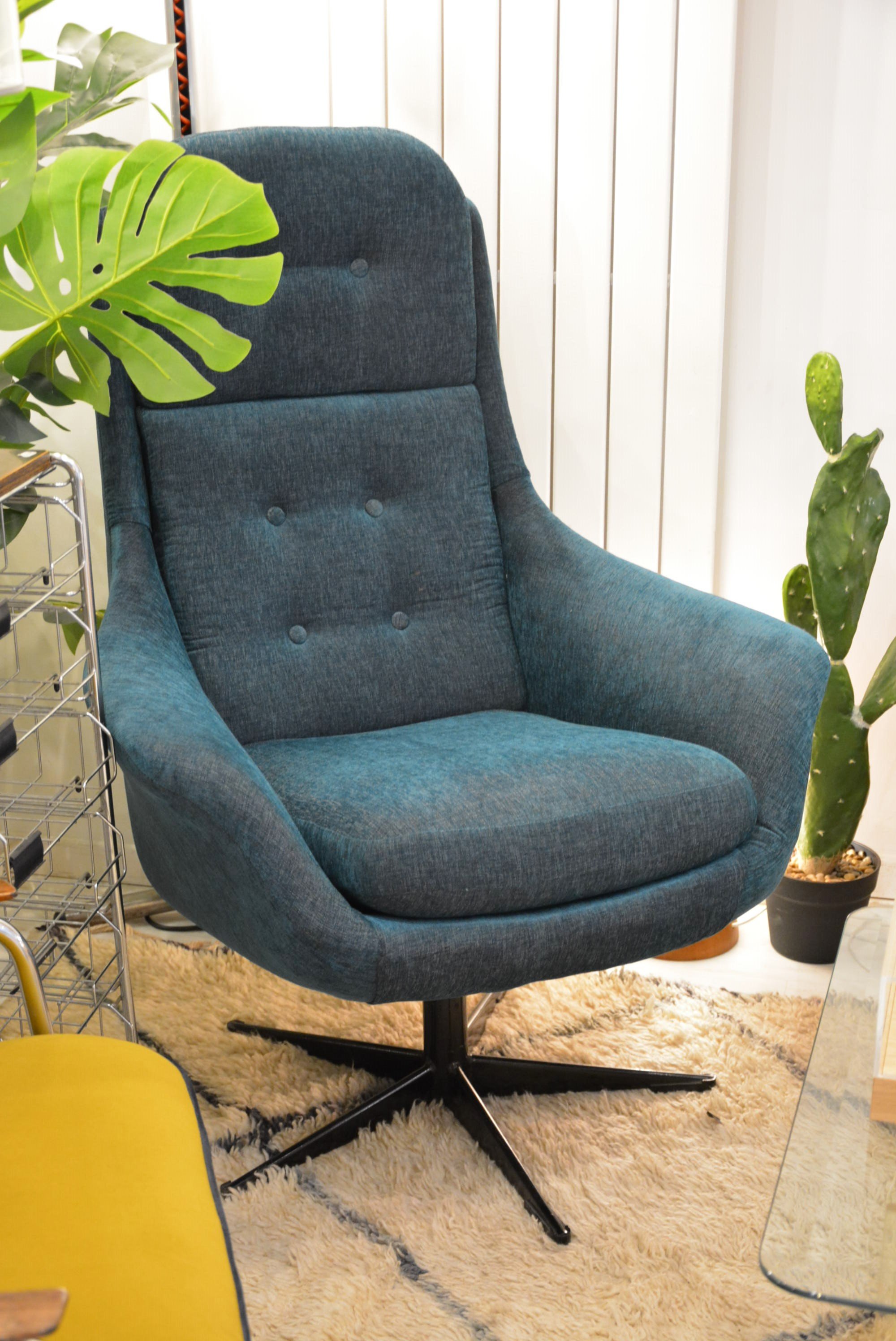 Fauteuil pivotant des années 70 au dossier haut et silhouette fine.