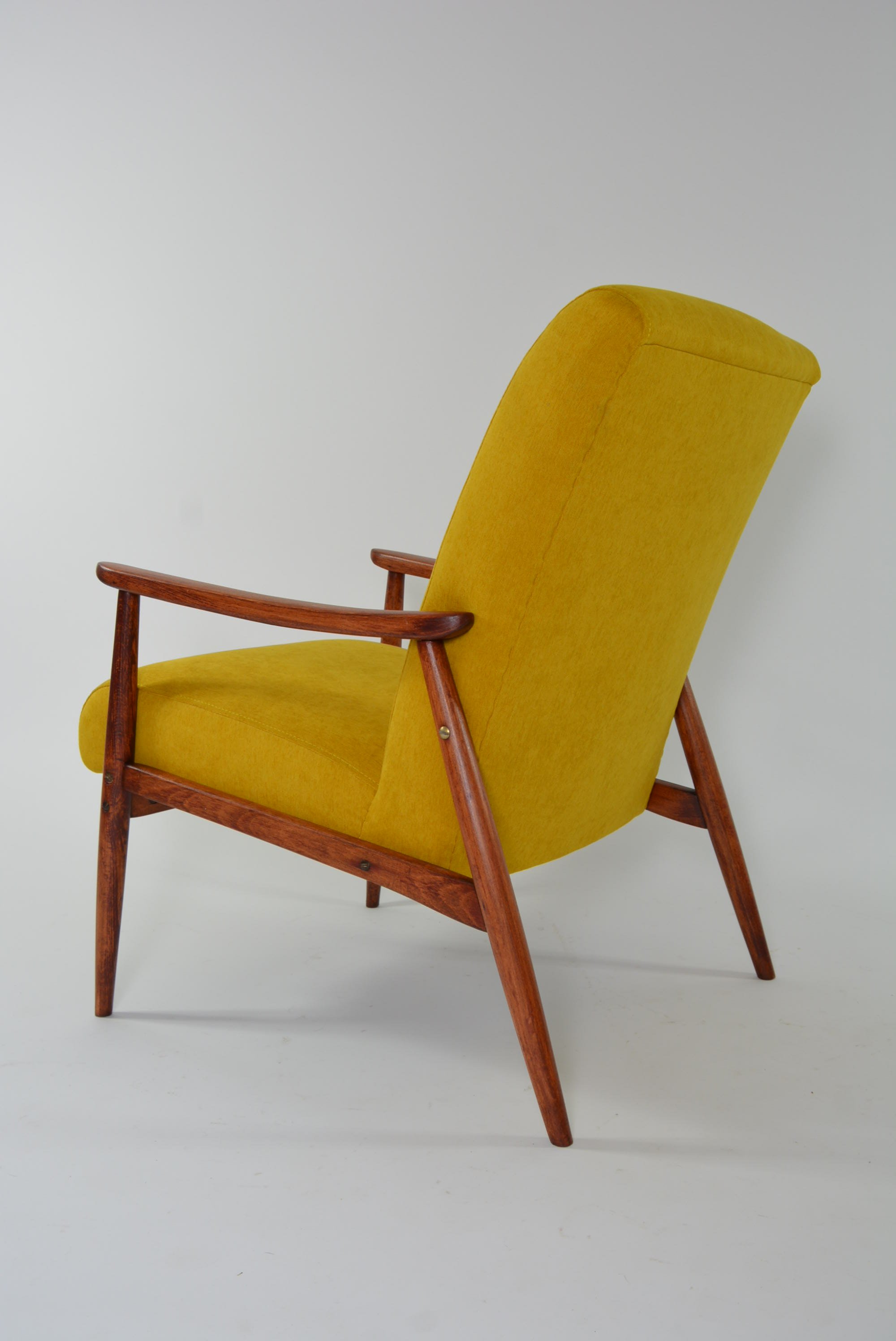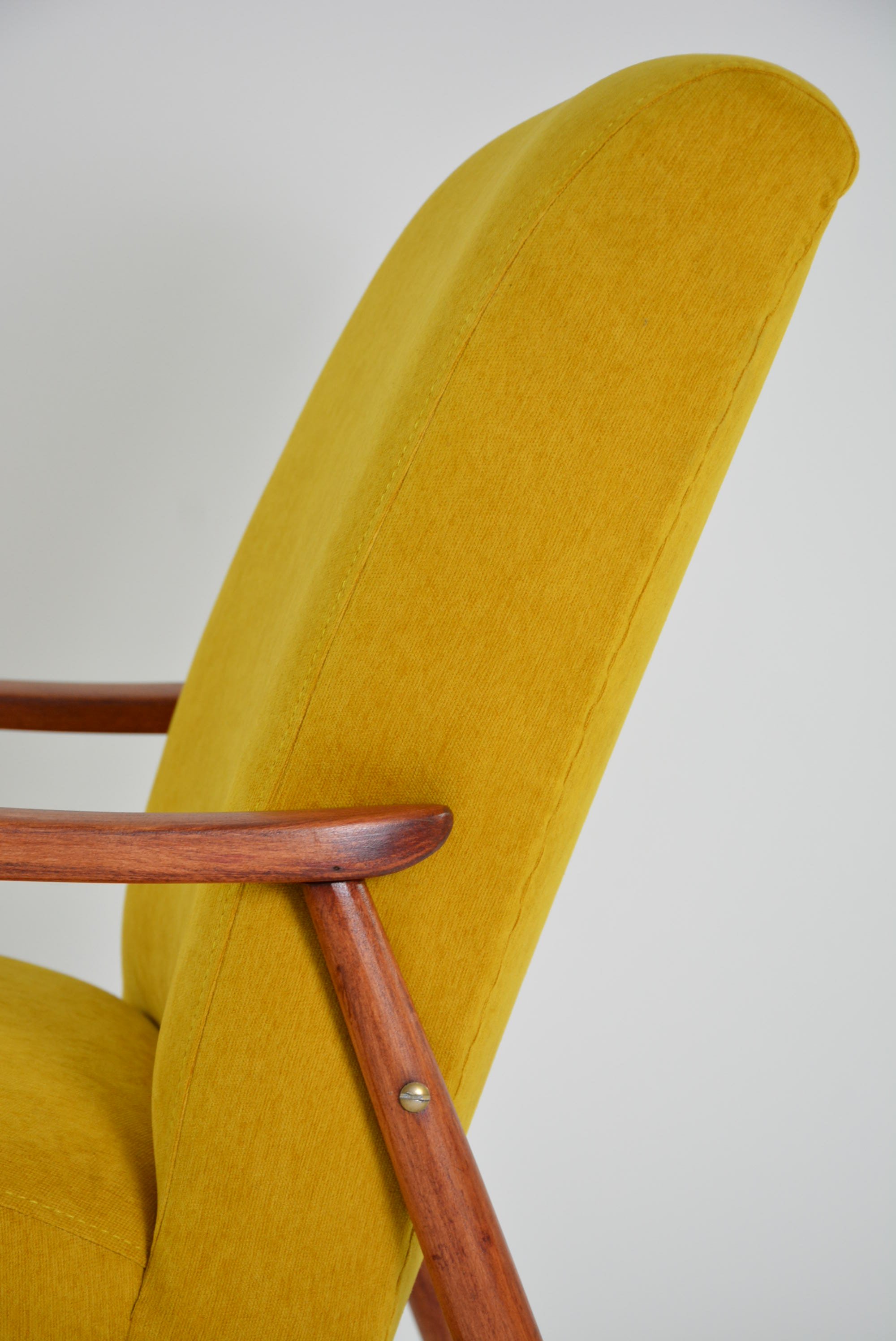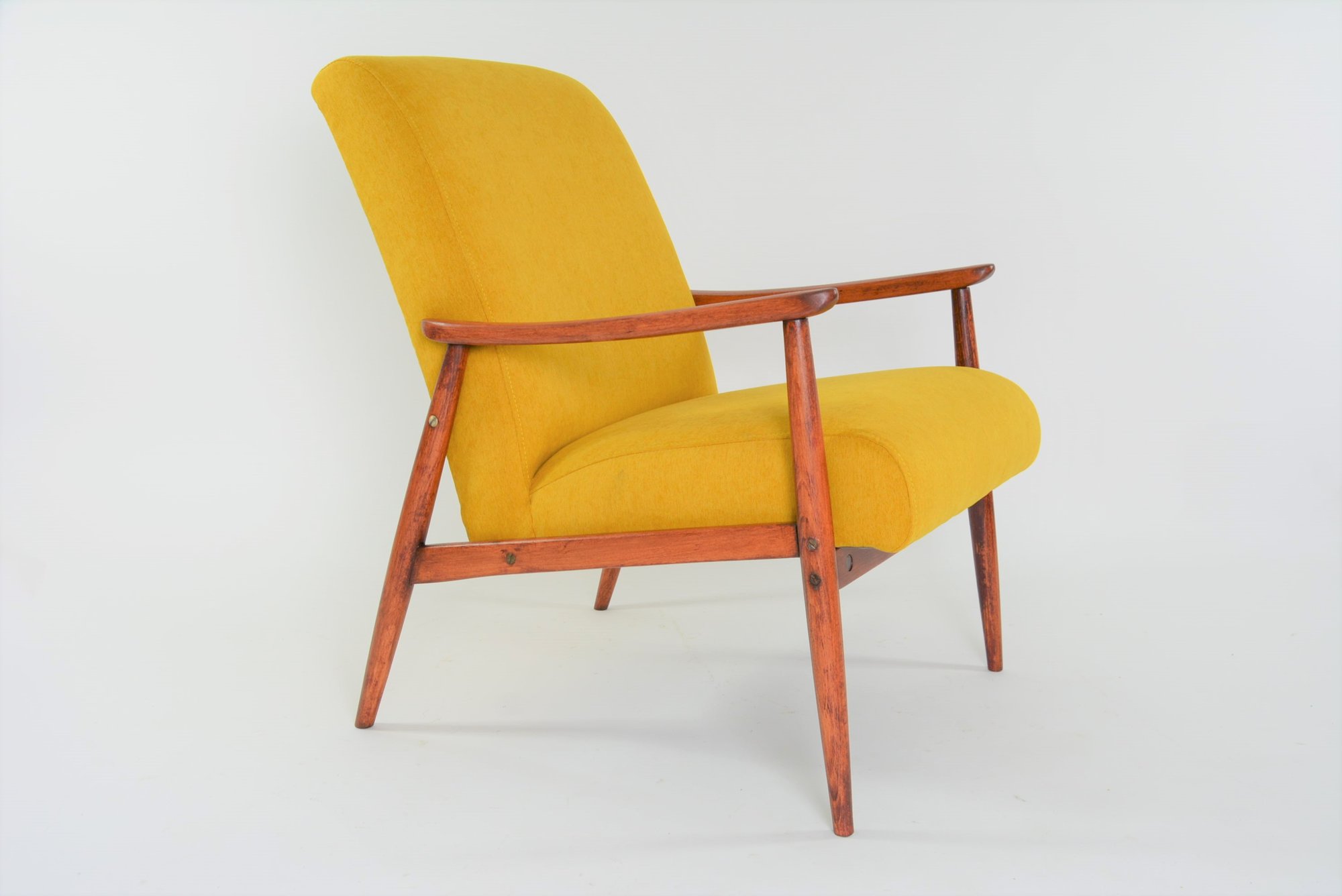 Rénovation intégrale: bois, garniture, tissu jaune lumineux antitache. Structure poncée et revernie en teck brun.