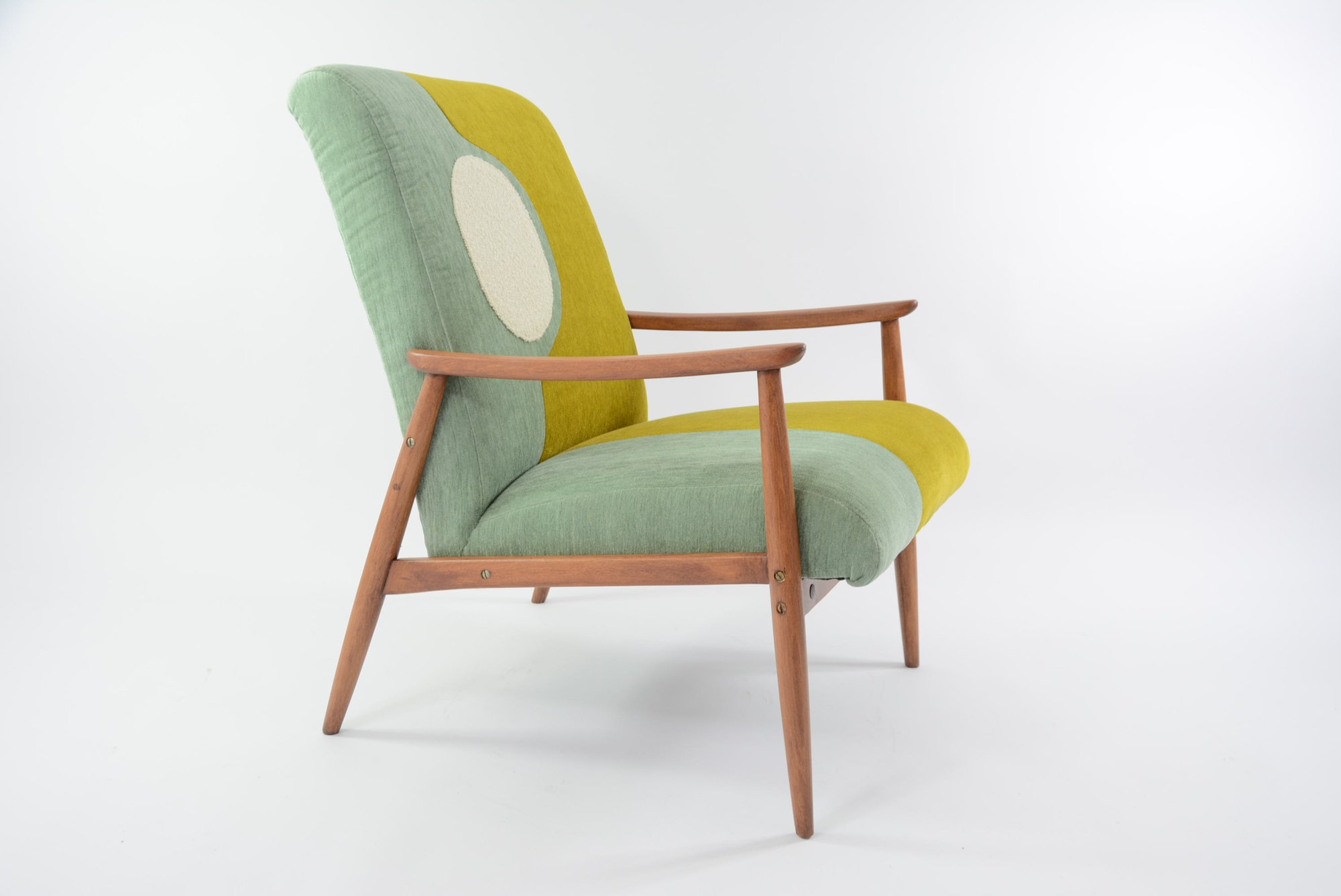 Entièrement restauré en 3 tissus : jaune or et vert anis antitache. La bouclette crème / ivoire lavable.