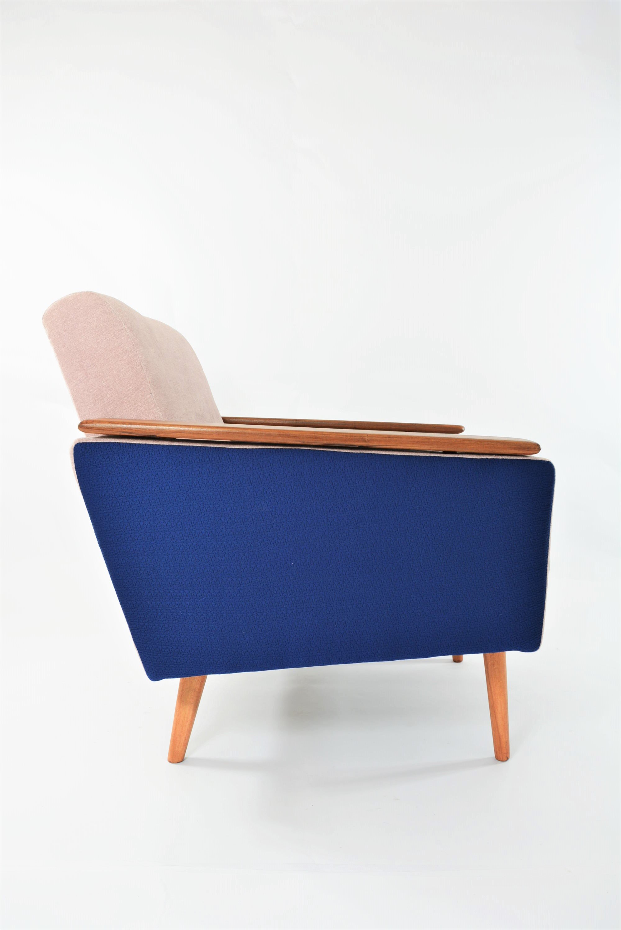 Construction robuste à l’accueil agréable avec le rembourrage en mousses légères et moelleuses. Entièrement restauré et recouvert des tissus antitaches (sauf le bleu). Piétement en compas et les accoudoirs restaurés.
