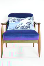 Réfection totale de la structure bois (ponçage, vernis neuf) et de l'assise (garniture, sangles neufs). Tissu bleu nuit antitache, derrière tapissé avec le tissu à motif VAGUE DE KANAGAWA.