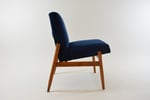 Petits fauteuils des années 60 sans accoudoirs. Construction épurée et fonctionnelle. Modèle idéal pour un petit espace. Entièrement restauré en tissu velours bleu nuit avec le derrière du dossier tapissé en demi rond avec le tissu velours gris et les cutures.