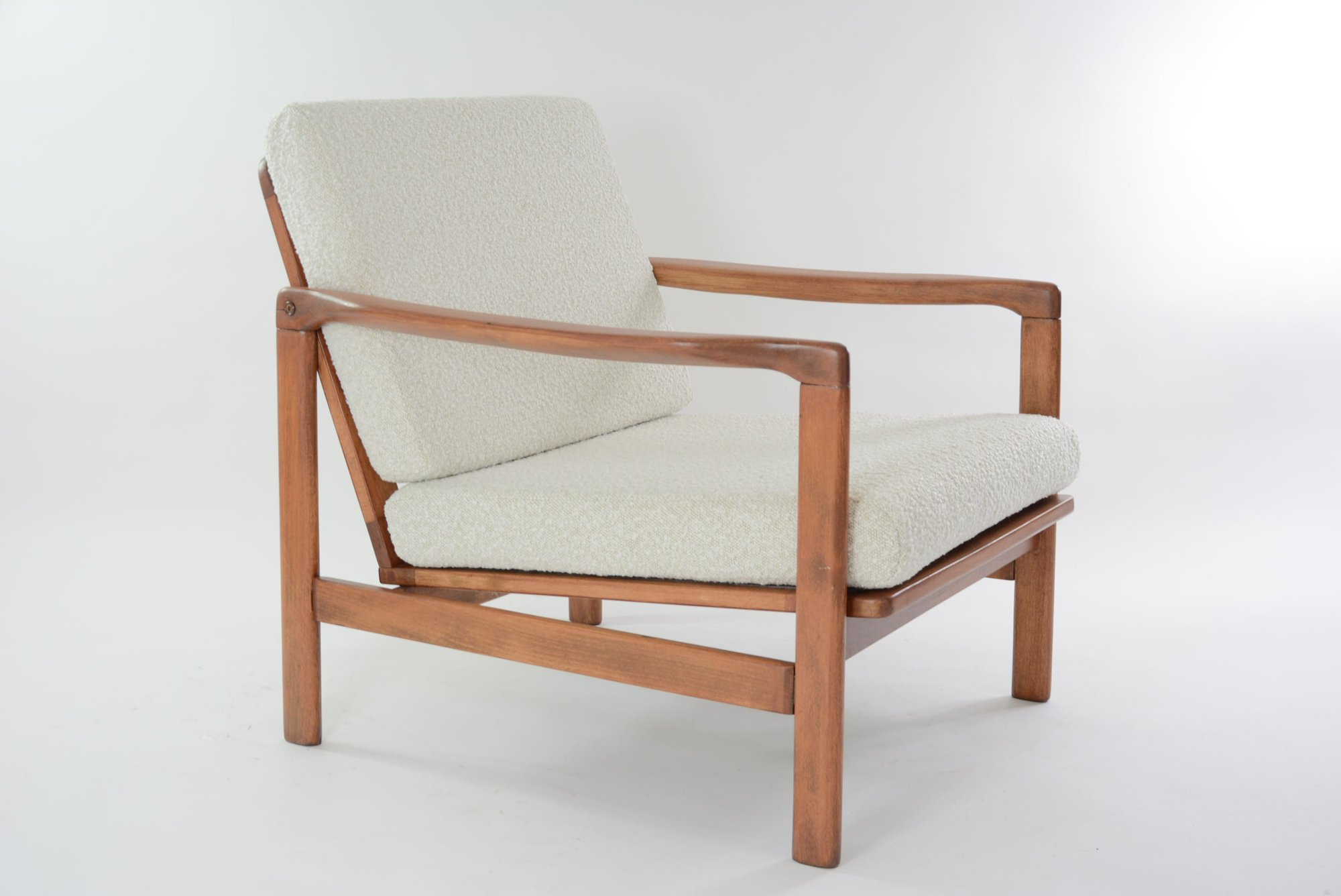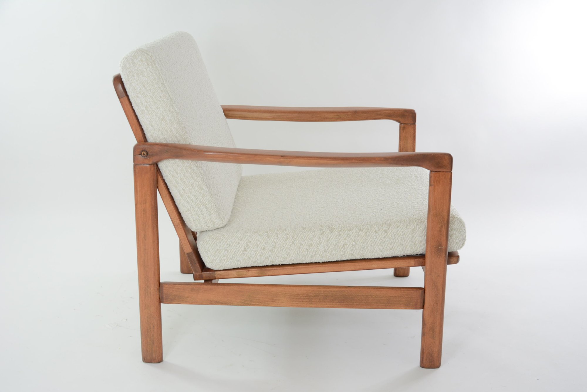 Entièrement restauré: changement intégral des coussins, des ceintures et du bois - couleur teck. Tissu bouclette synthétique blanche sur le fond beige (visible en boutique), lavable.