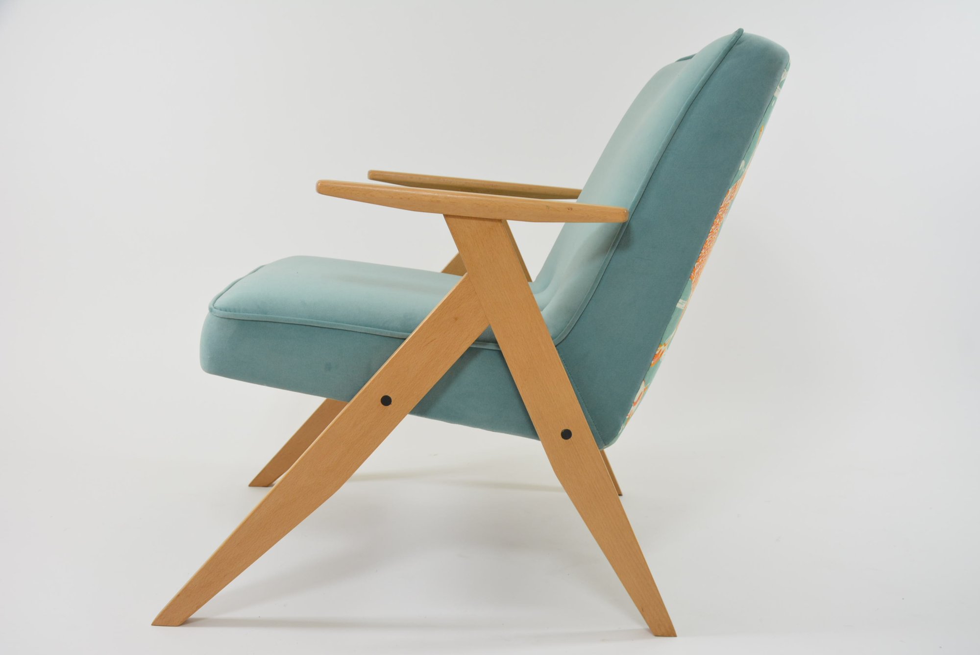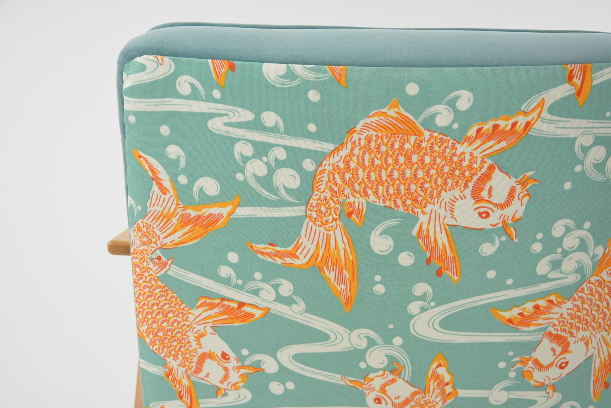 Restauration complète: bois, garniture, tissu type velours mat mint antitache. Derrière tapissé en tissu exclusif à motif "Carpes japonaises".