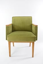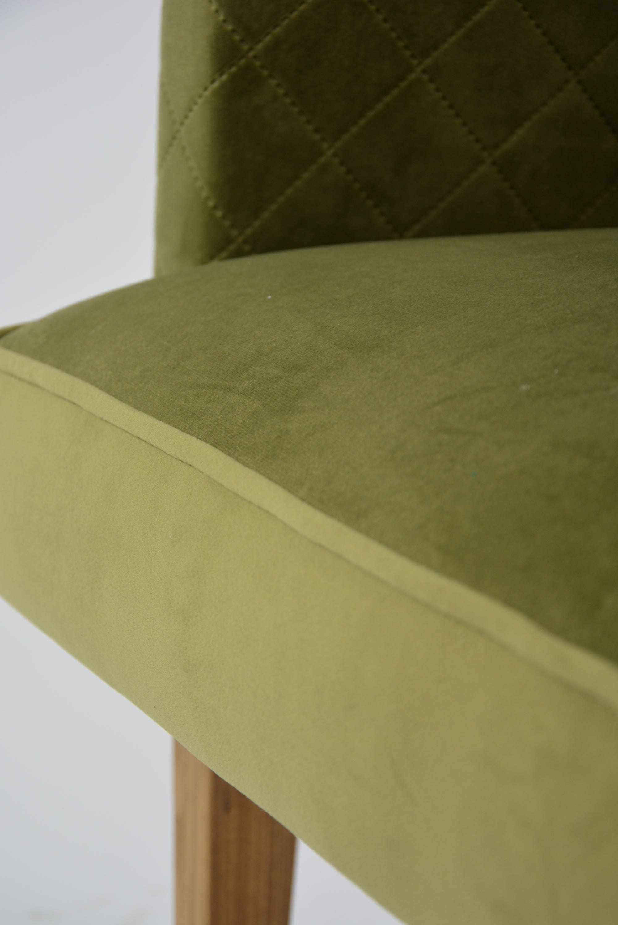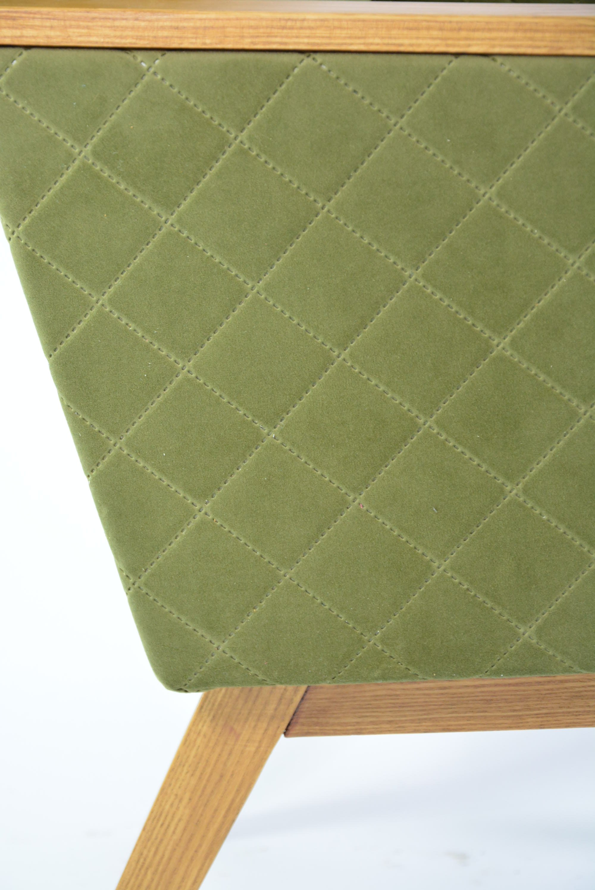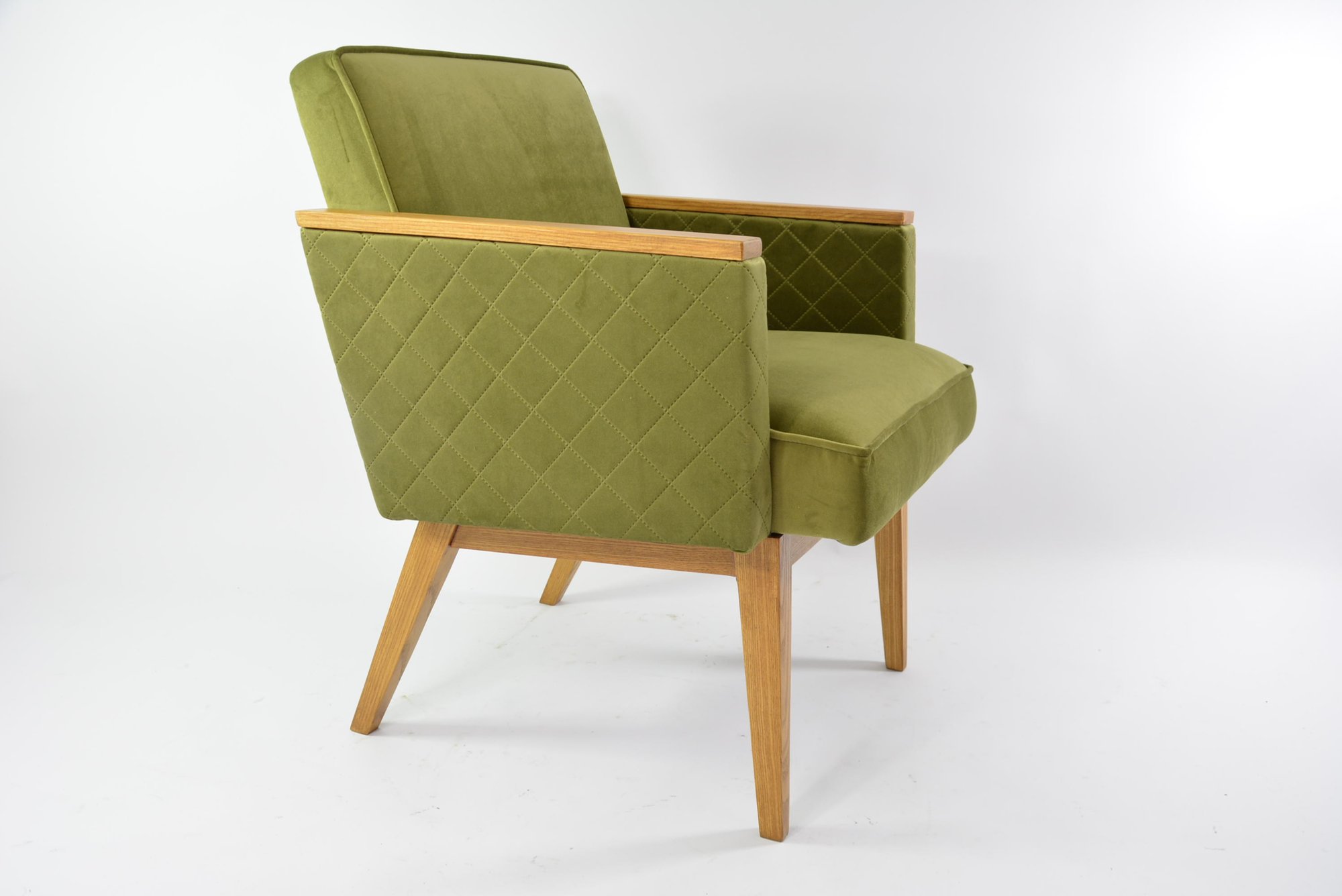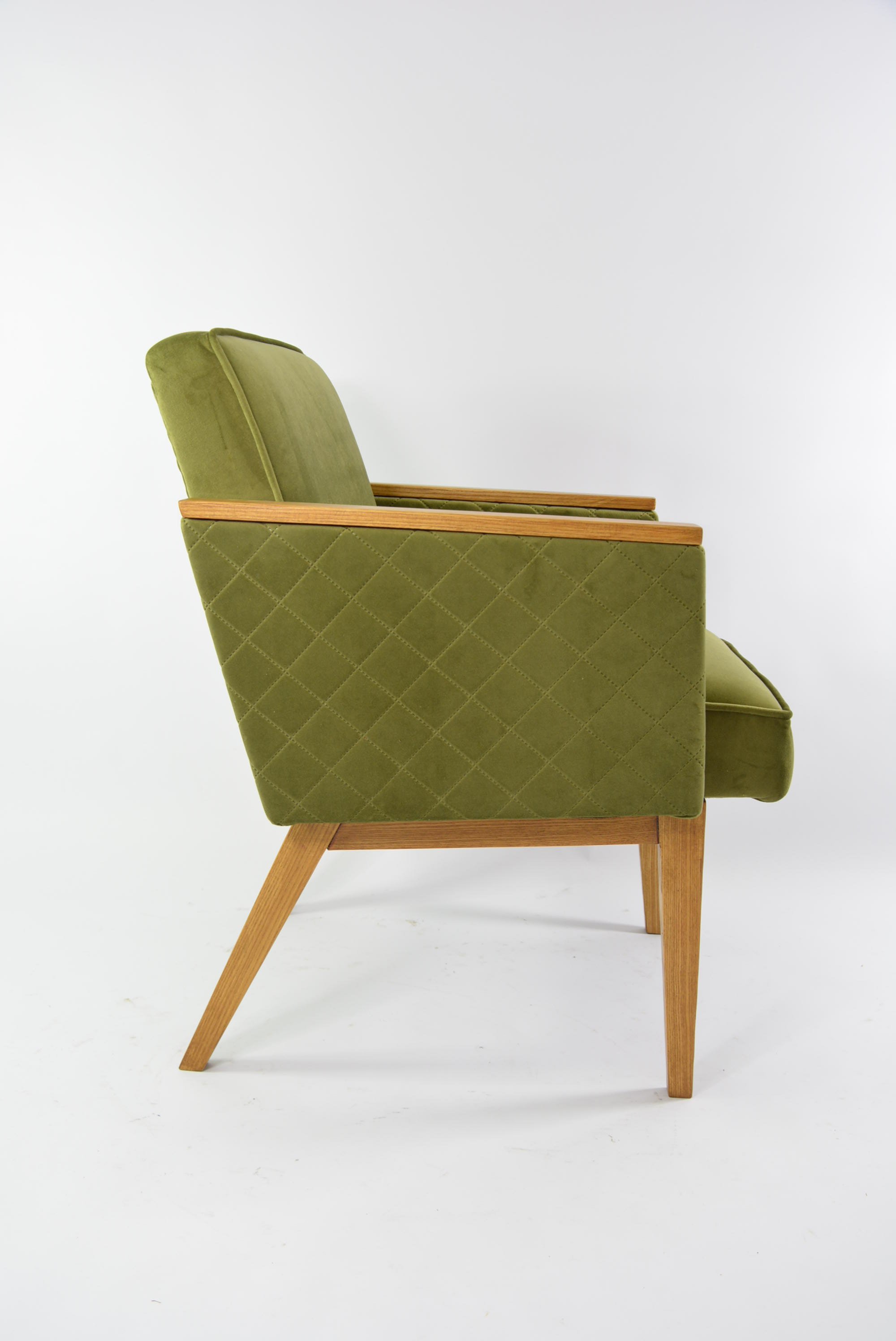 Construction robuste à l’accueil agréable avec le rembourrage en mousses semi-fermes. Entièrement restauré et recouvert d'un tissu velours vert olive antitache. Les accoudoirs recouvert du même tissu matelassé.