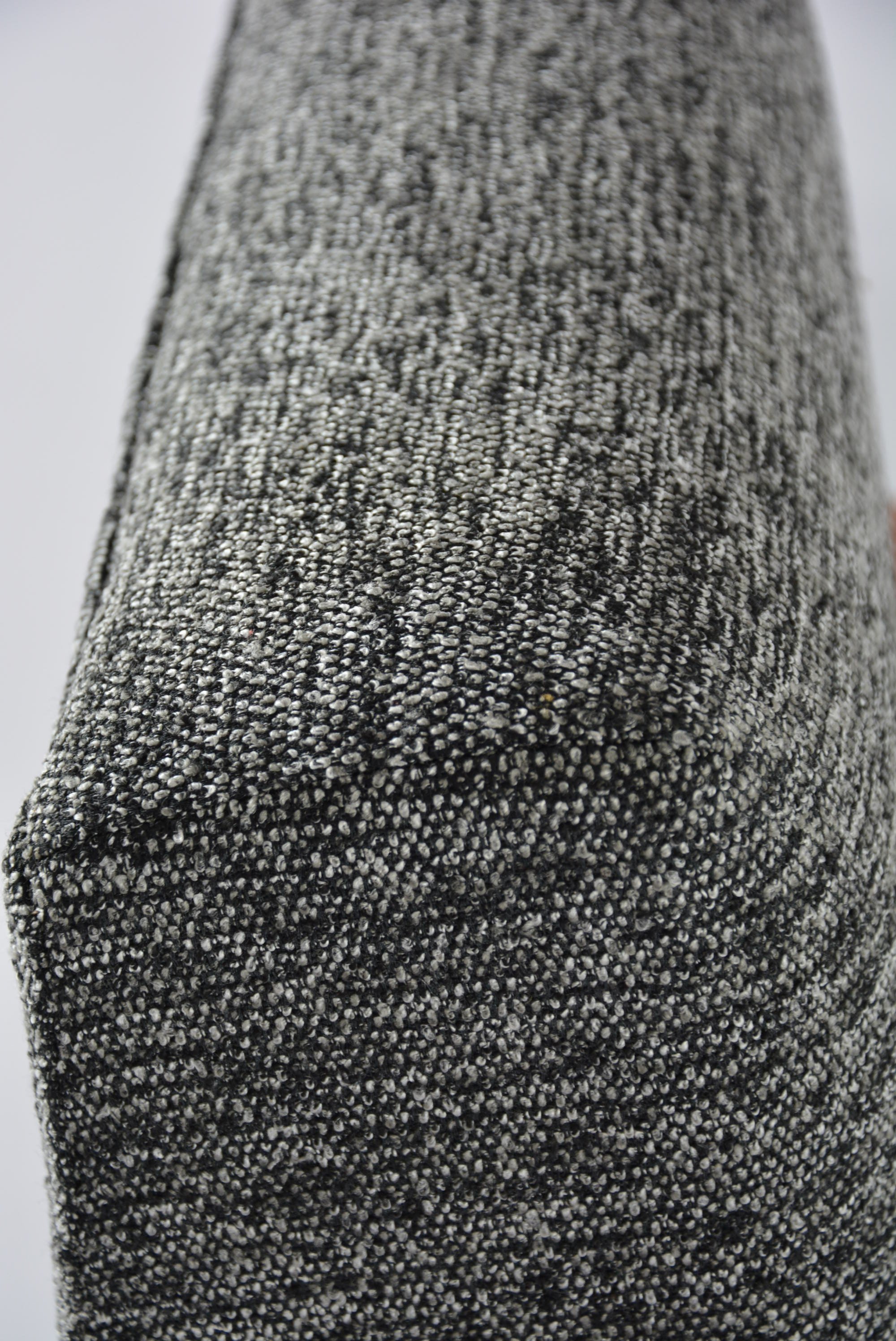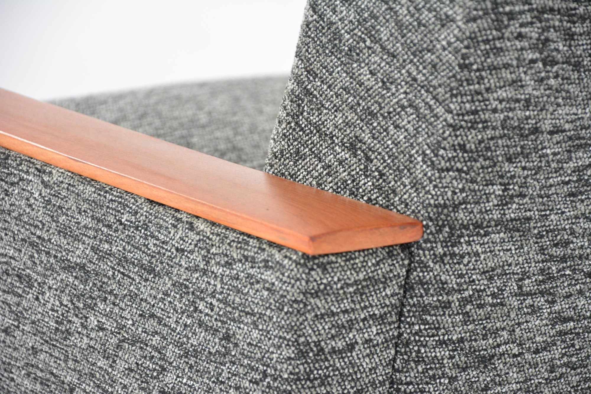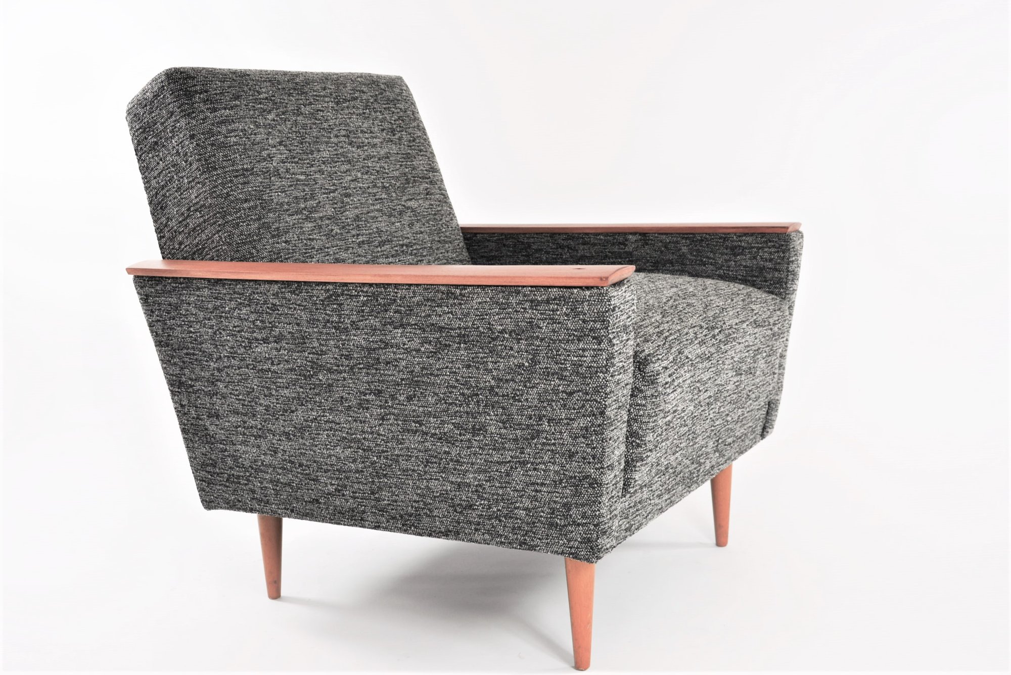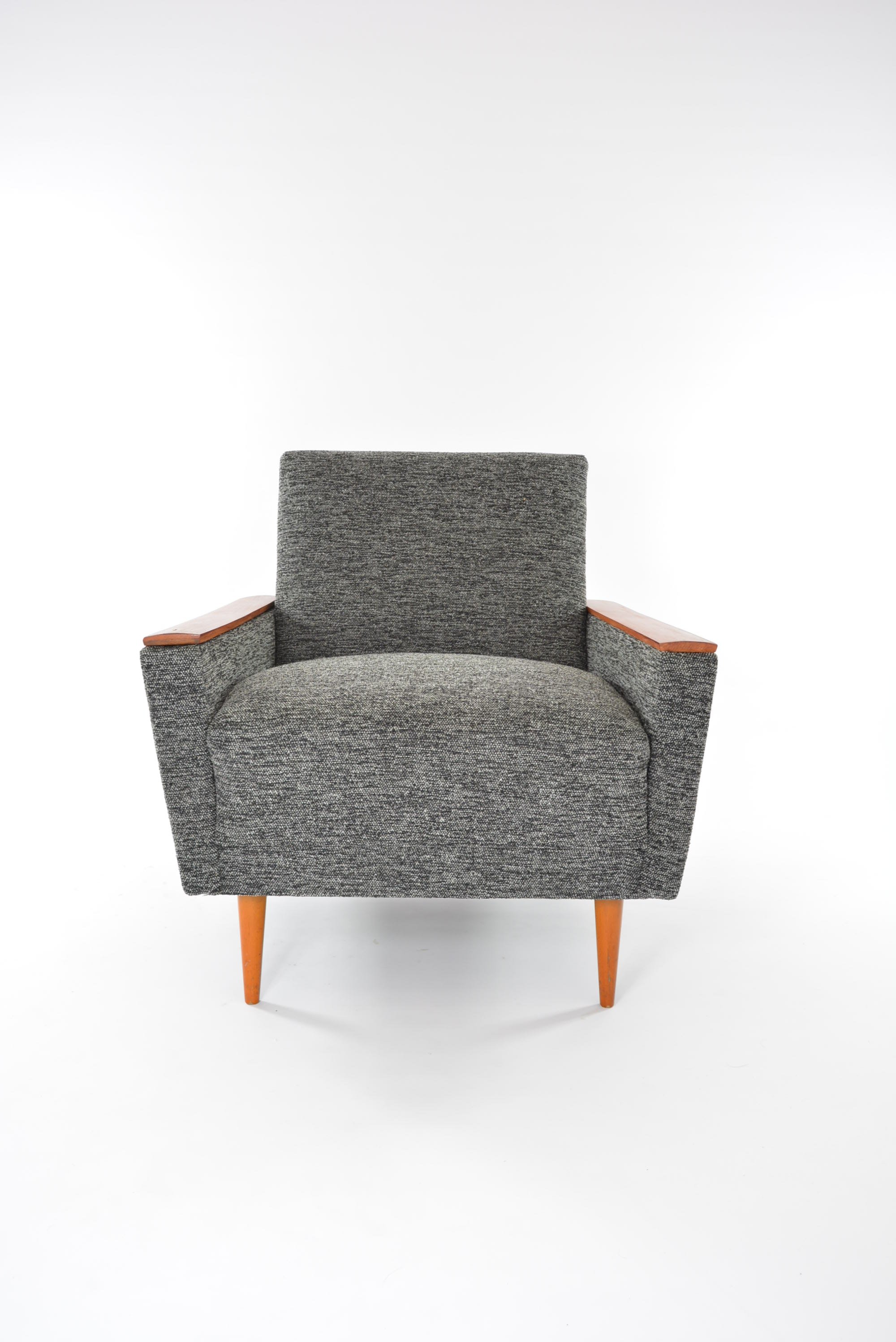 Construction robuste à l’accueil agréable avec le rembourrage en mousses légères et moelleuses. Entièrement restauré et recouvert d'un tissu bouclette synthétique noir et blanc, antitache. Piétement en compas et les accoudoirs restaurés.
