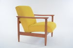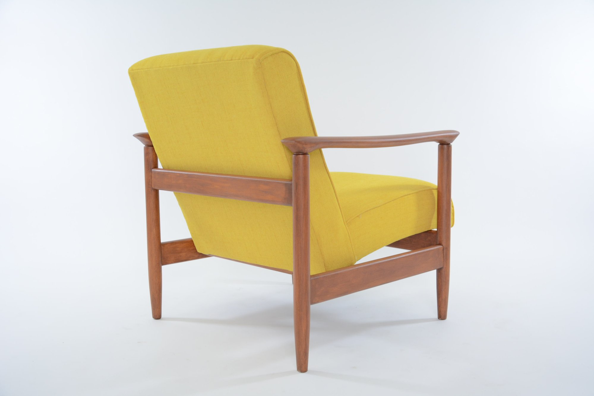 Restauré en tissu antitache jaune avec la structure entièrement poncée et revernie en couleur teck.