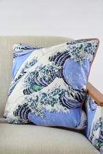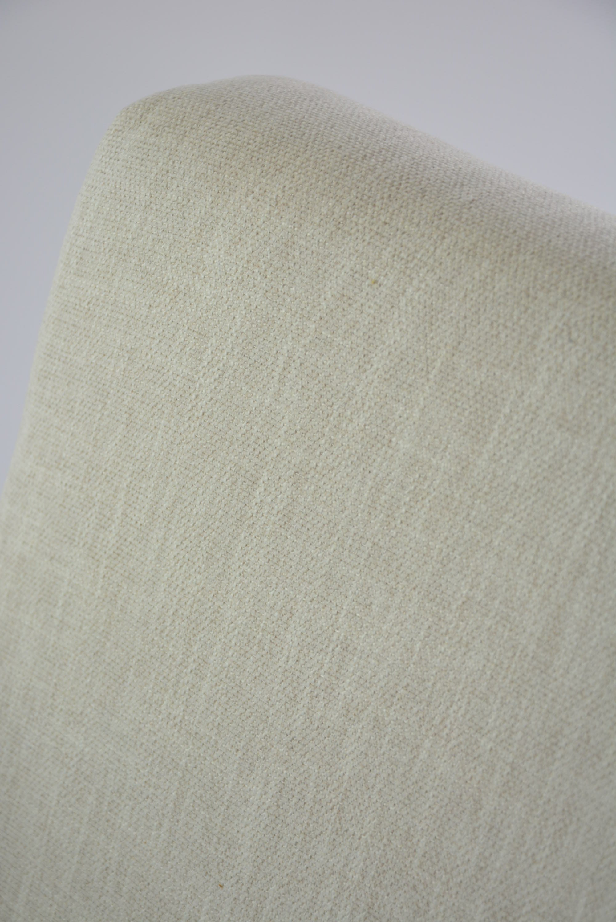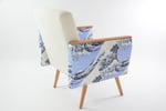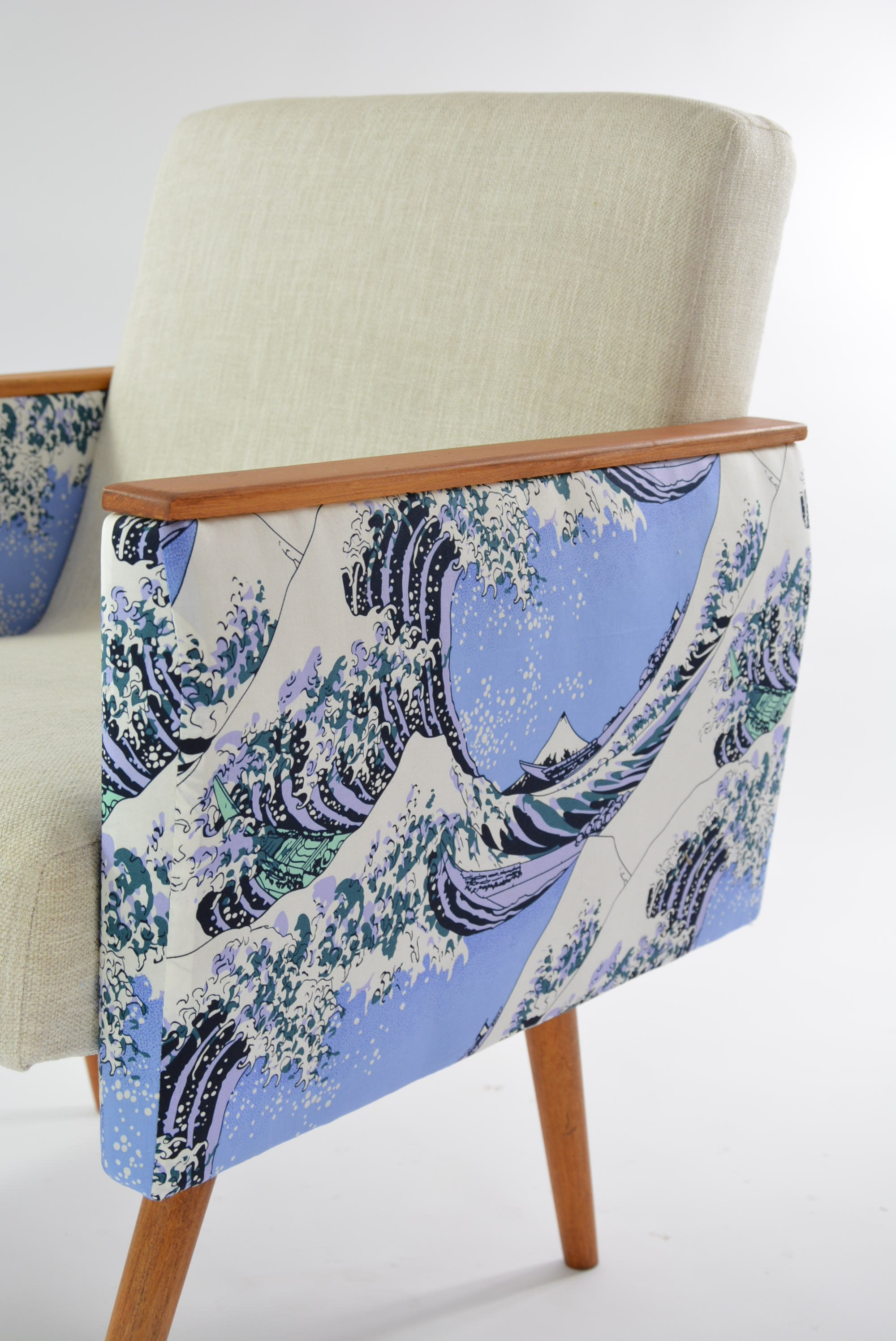 Réfection totale incluant: changement de garniture et de mousses. Ponçage des parties bois. Tissu antitache ivoire sur l'assise et les accoudoirs tapissés en tissu à motifs Vague de Kanagawa.