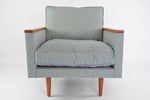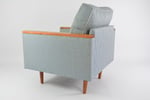 Construction robuste à l’accueil agréable avec le rembourrage en mousses légères. Entièrement restaurés et recouverts d'un tissu chiné à motif de pieds de poule bleu et blanc. Accoudoirs et les pieds entièrement restaurés ; vernis teck.