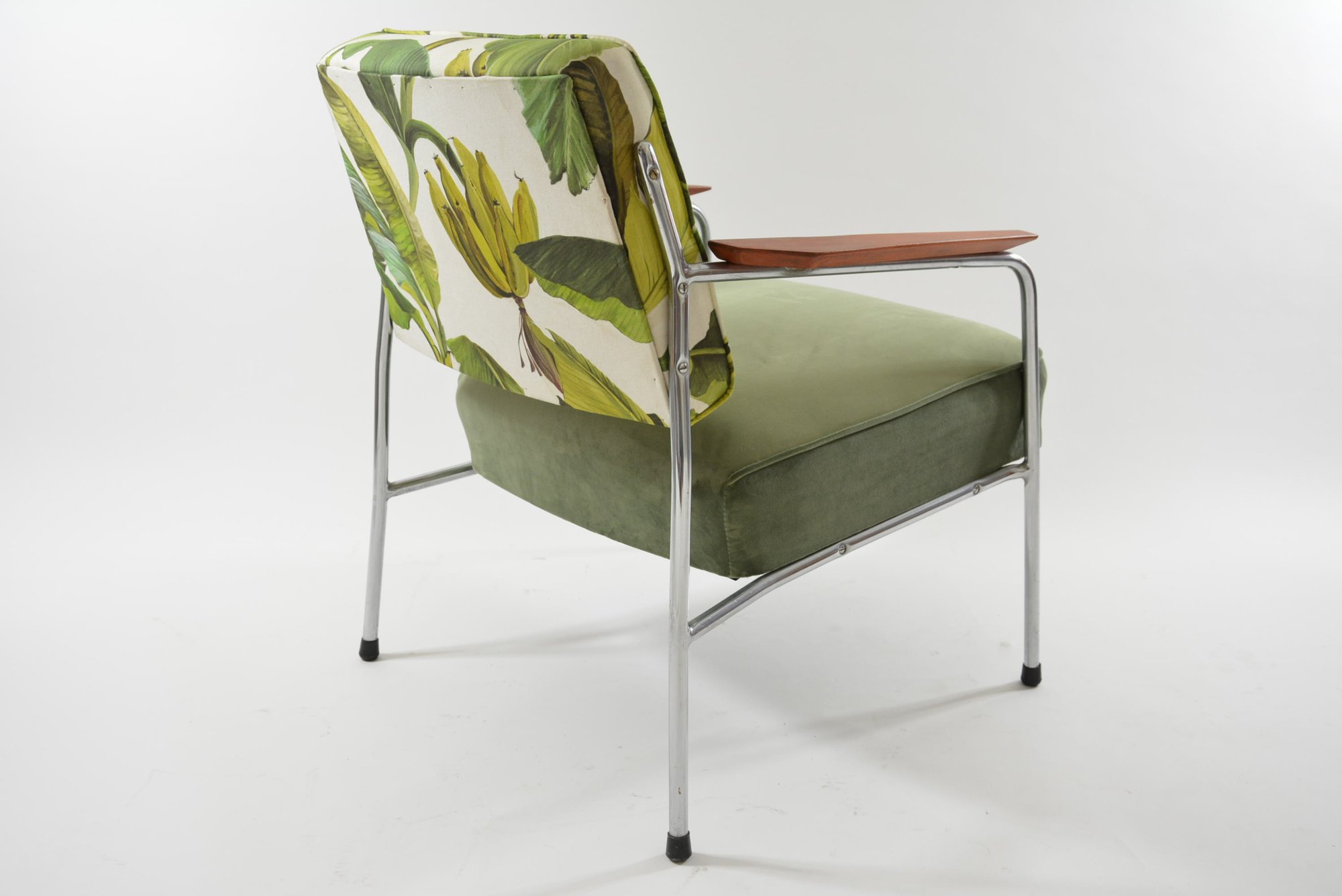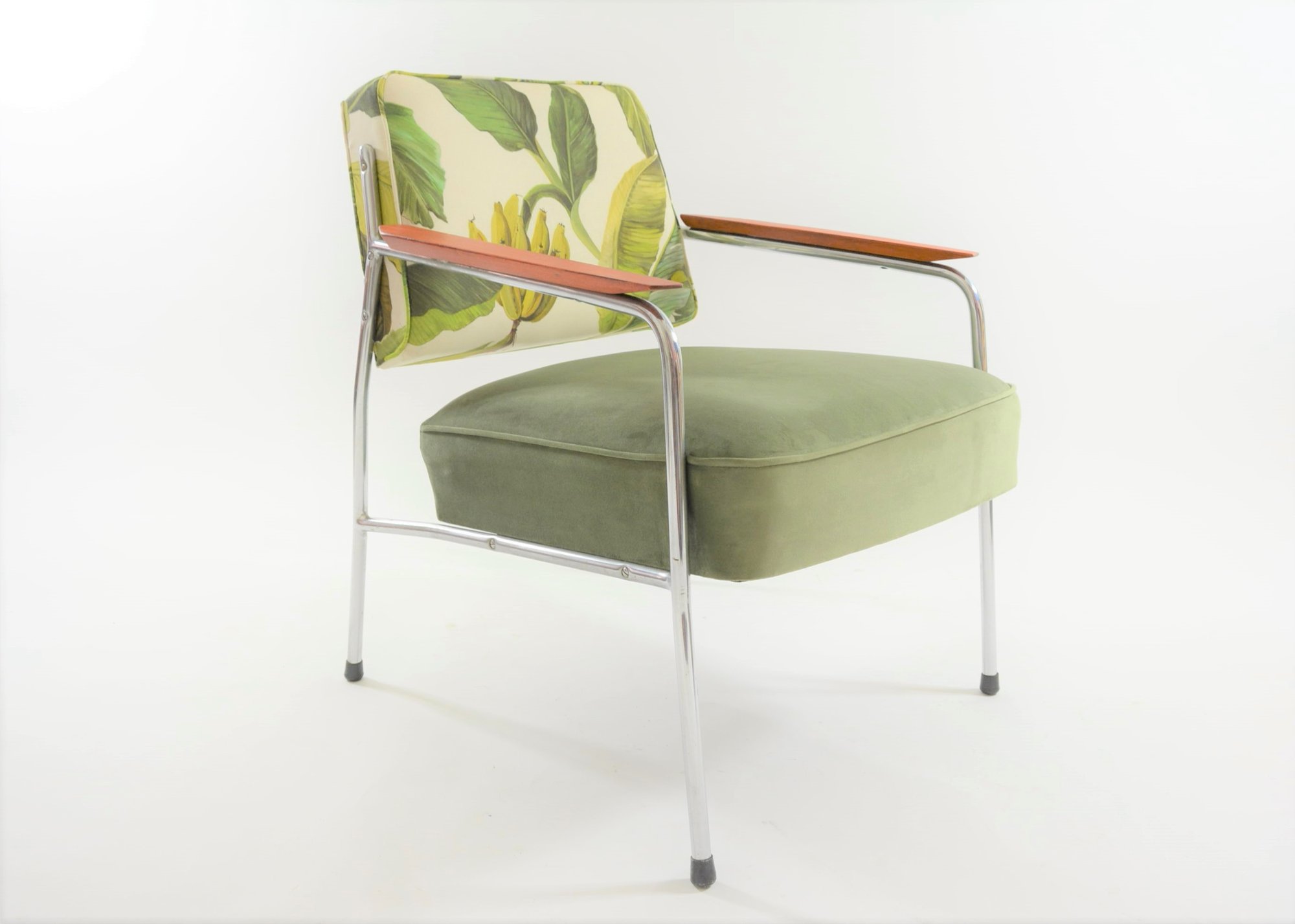 Fauteuils entièrement restaurés: garniture, ceintures, mix tissus avec le velours antitache vert olive sur l'assise et le tissu à motif bananier sur le dossier. Parties chromé en très bon état.