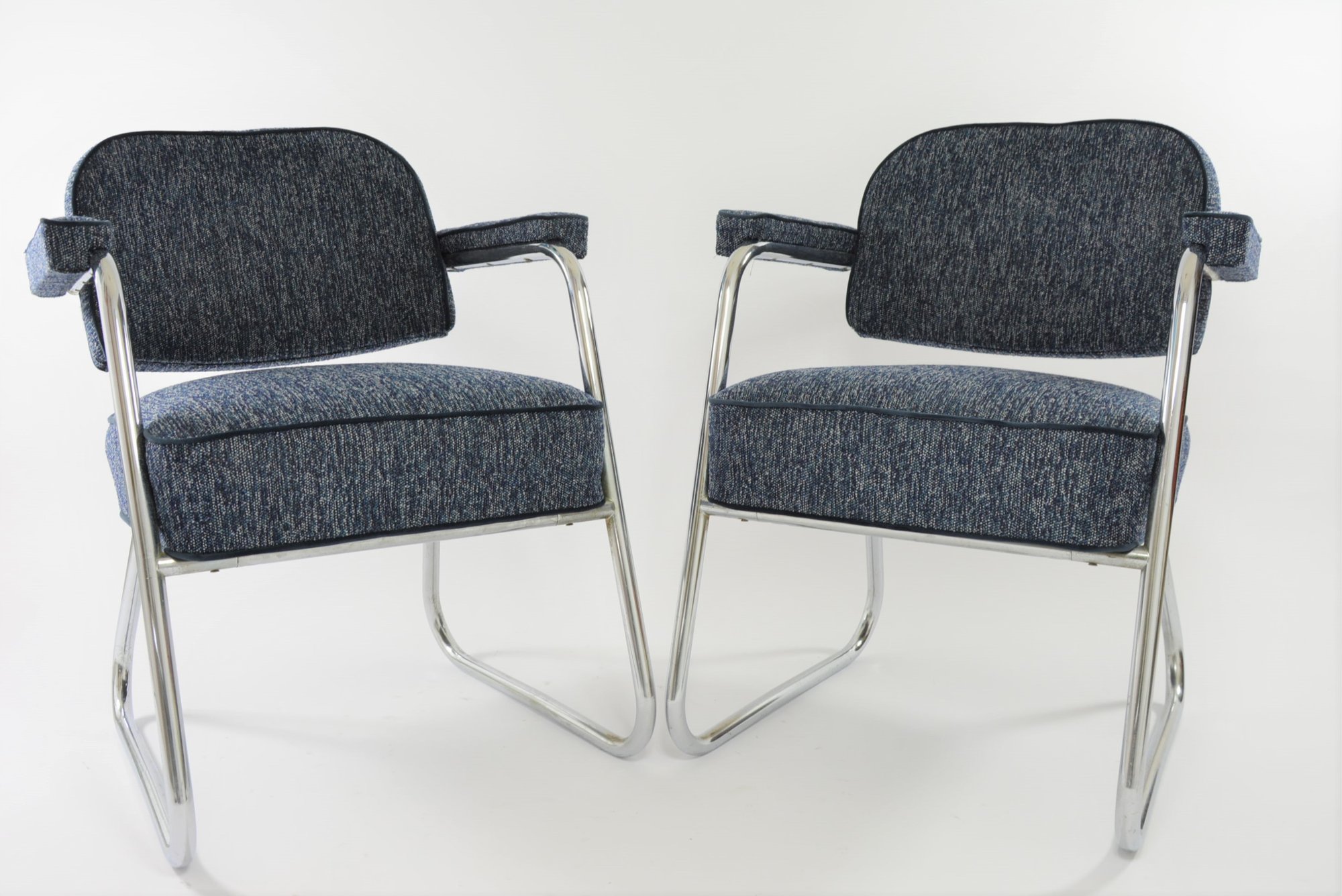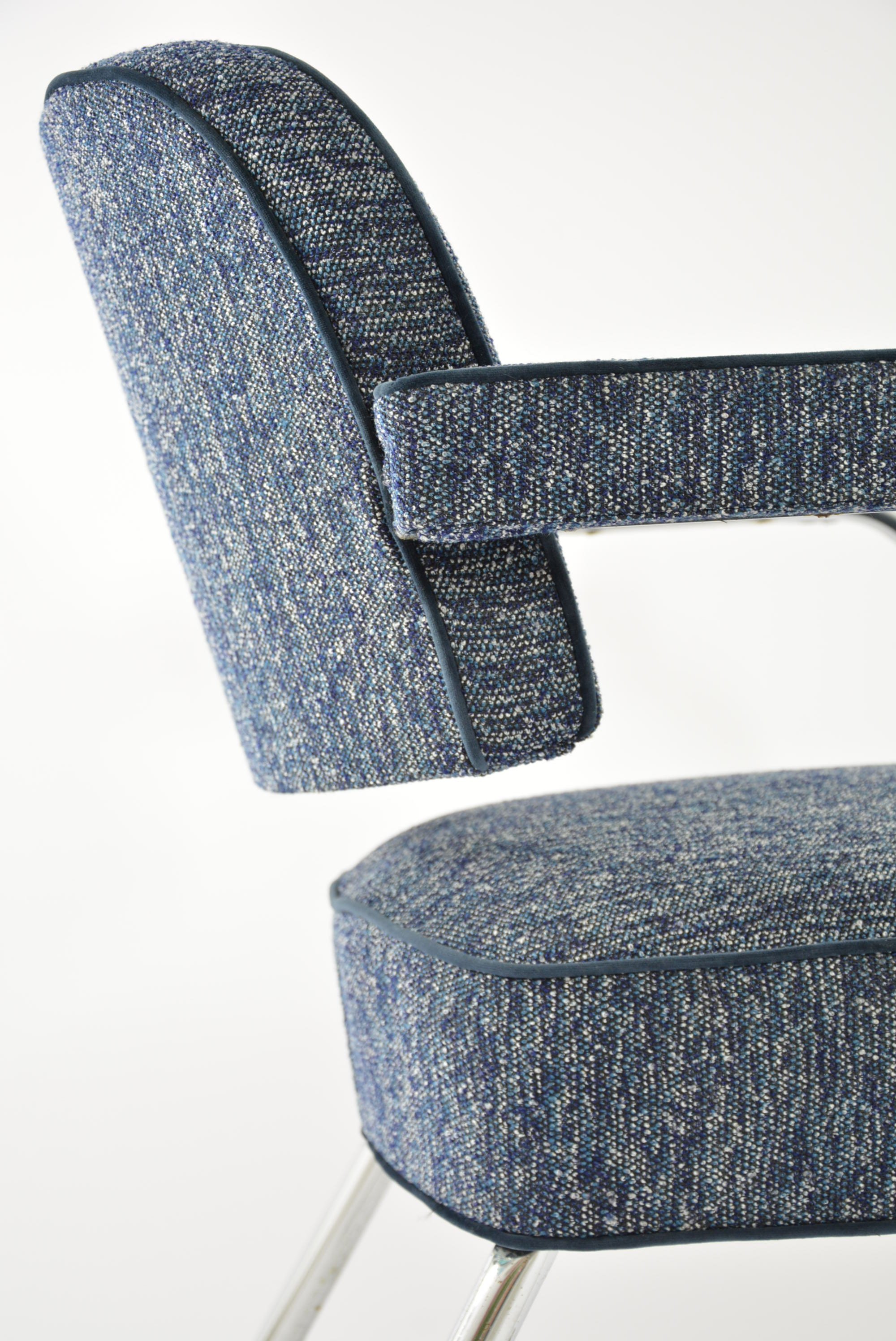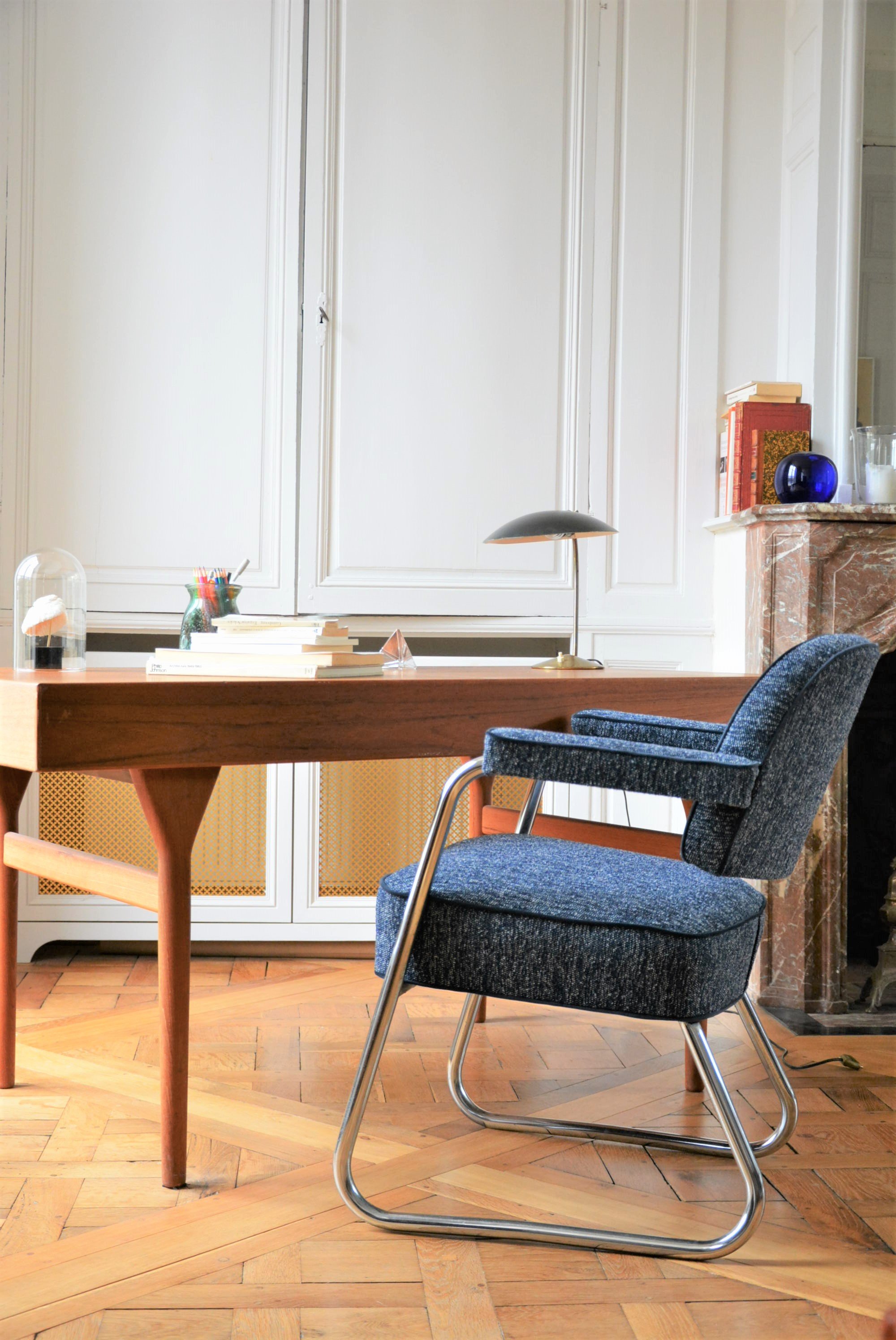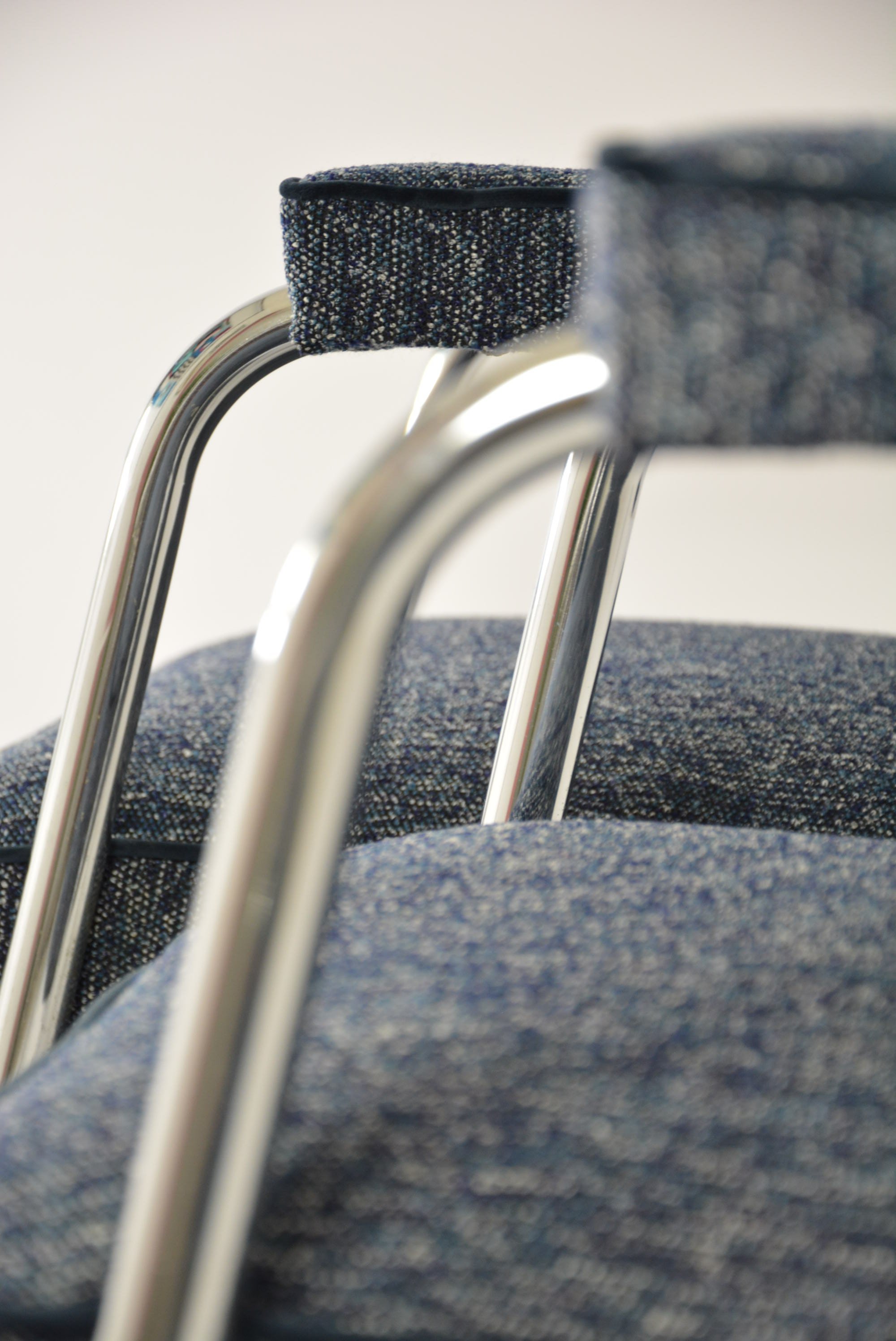 Très rarement dans nos collections. Deux fauteuils à dossier et assise séparés, monté sur la structure en métal chromé. Années 70.
