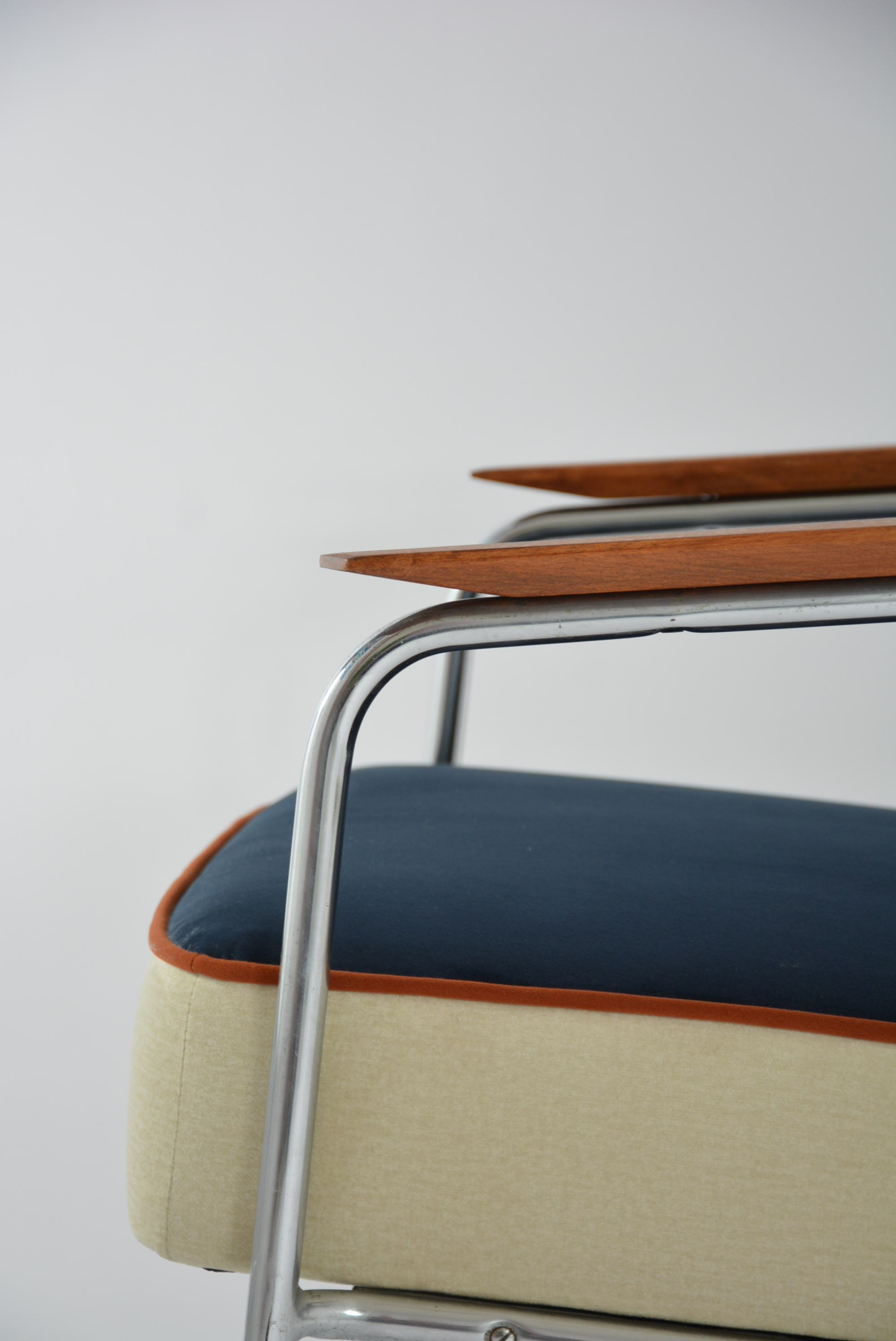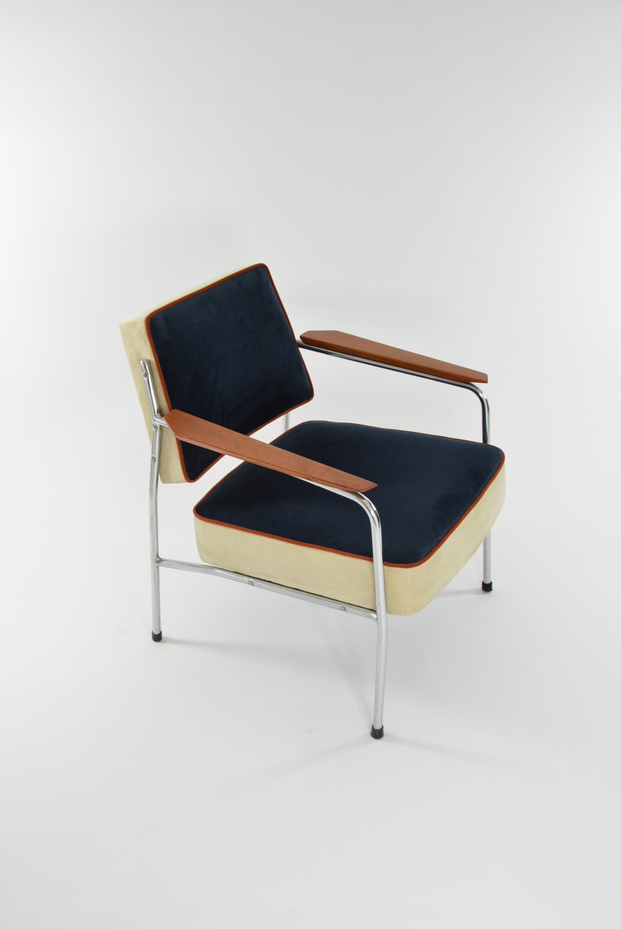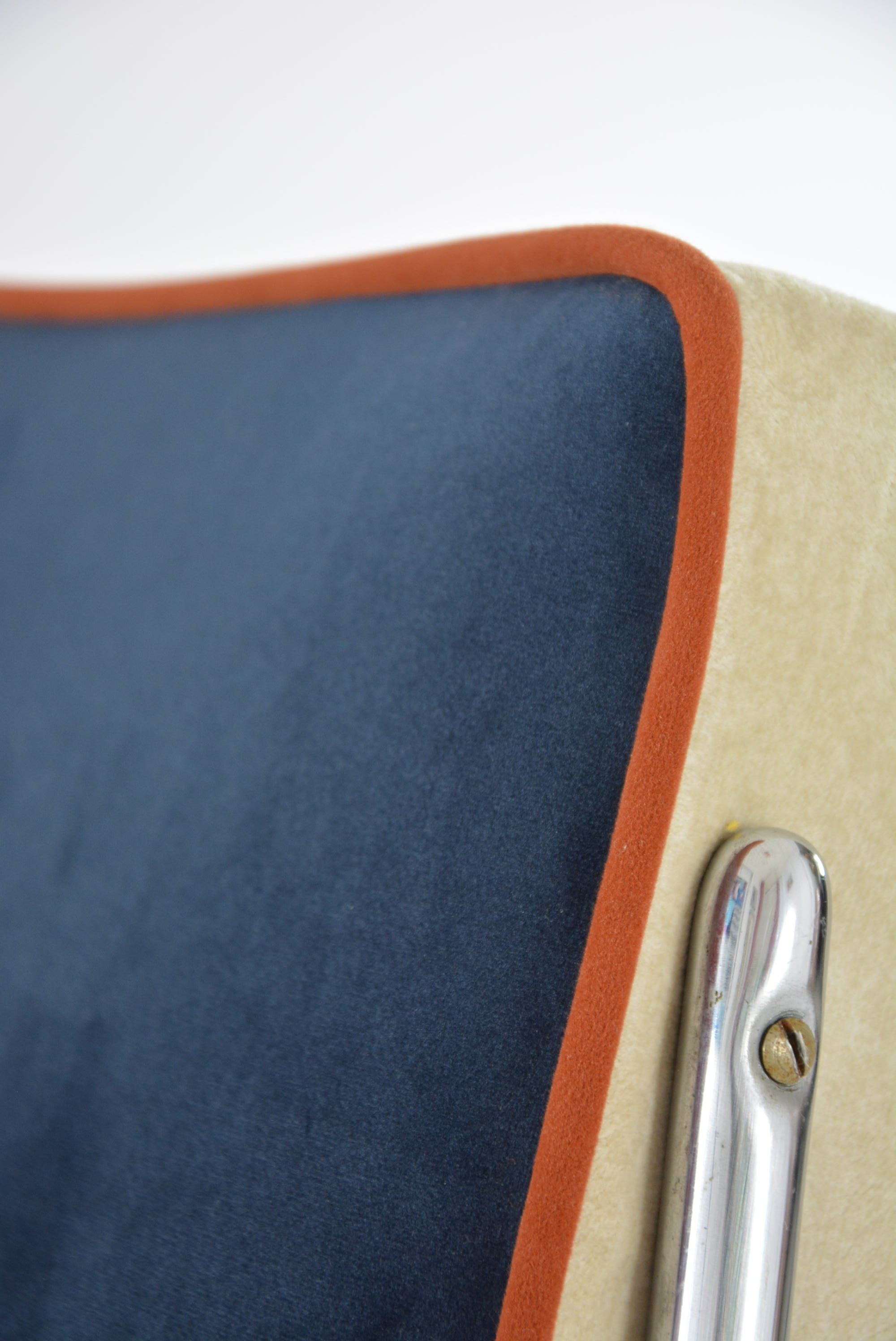Fauteuils entièrement restaurés: garniture, ceintures, mix tissus avec le velours mat antitache bleu nuit, ivoire avec le passe poil terracotta. Parties chromé en très bon état.