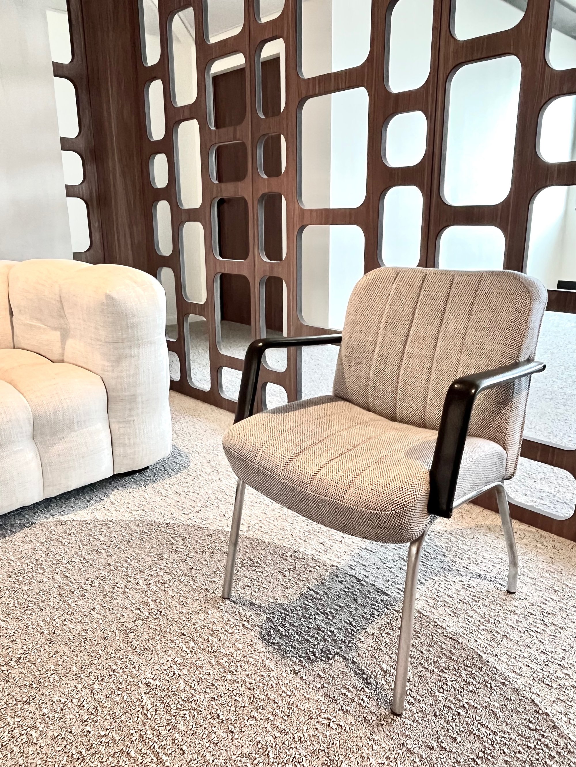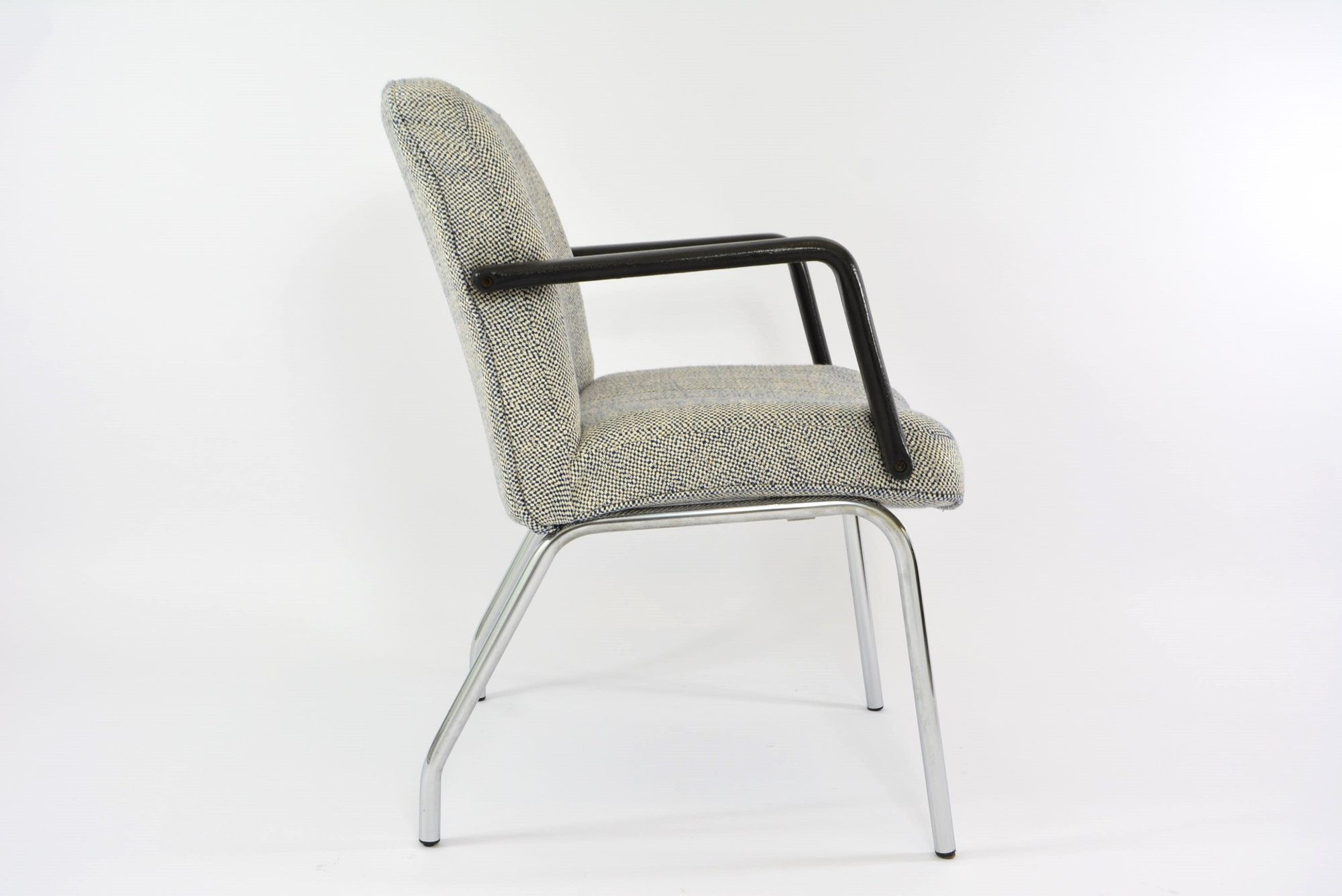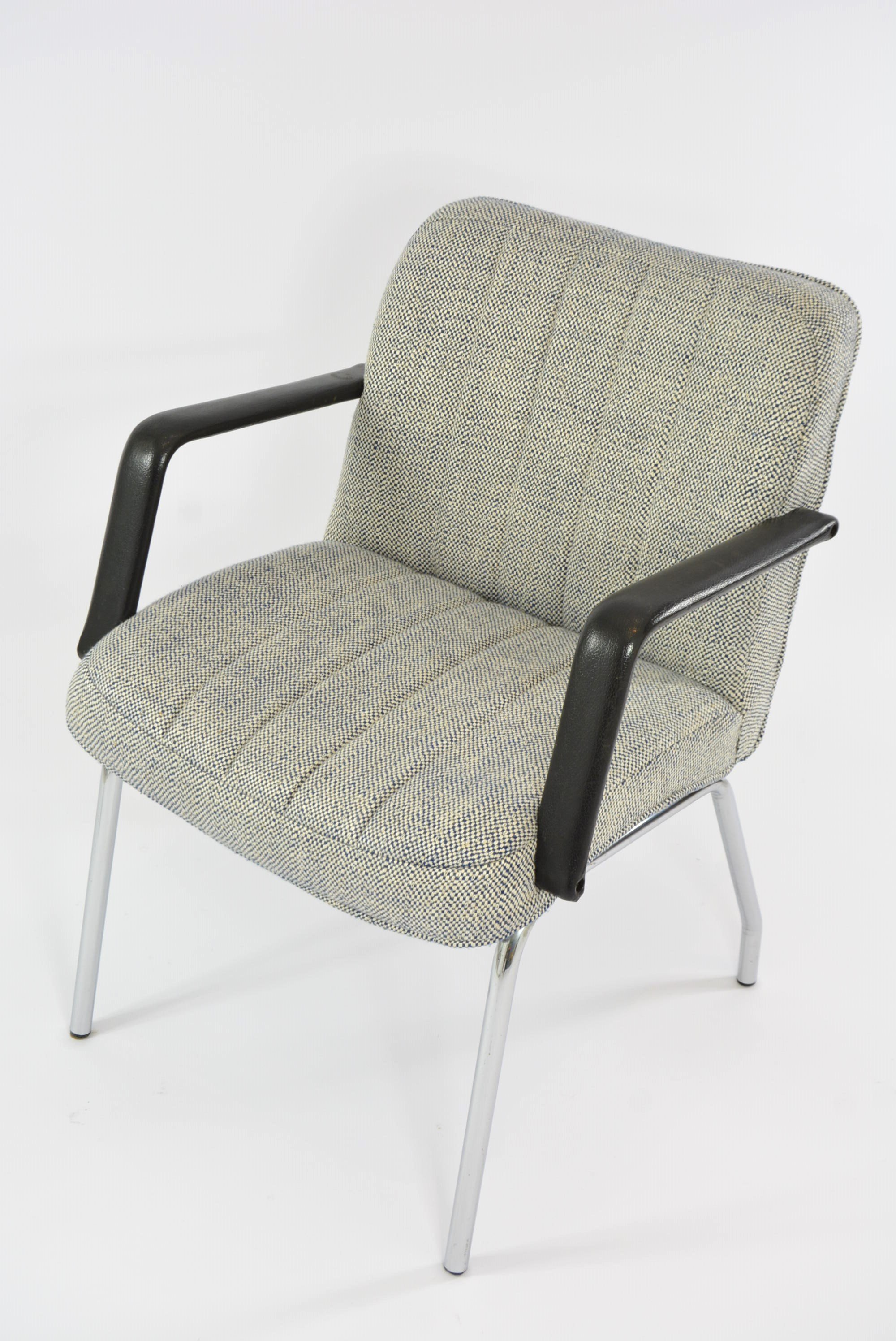 Très rarement dans nos collections. Deux très confortables fauteuils de bureau, mais pas seulement, à la structure chromé et les accoudoirs en résine imitation cuir!