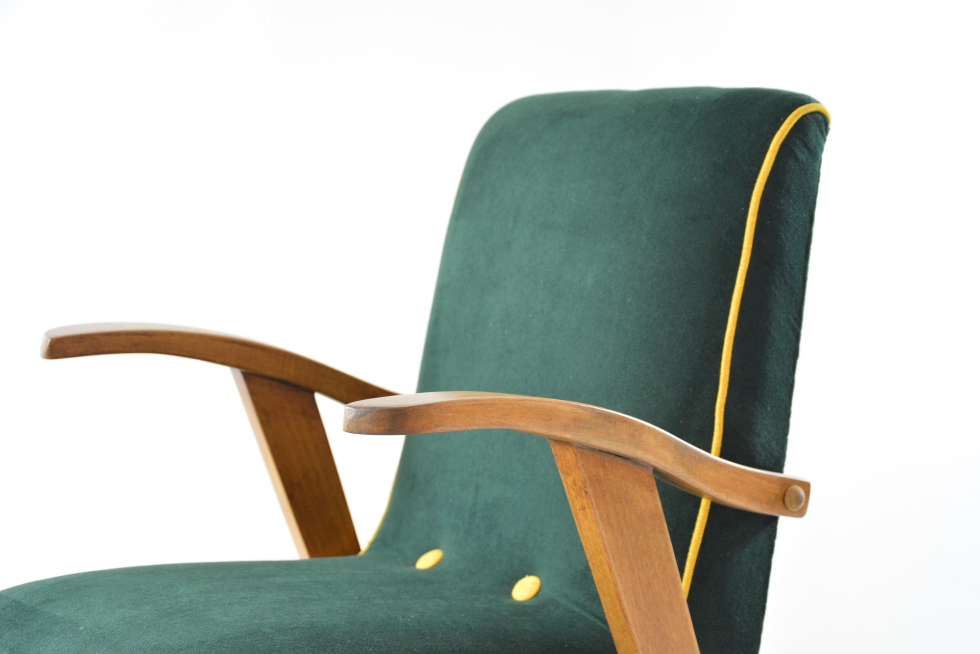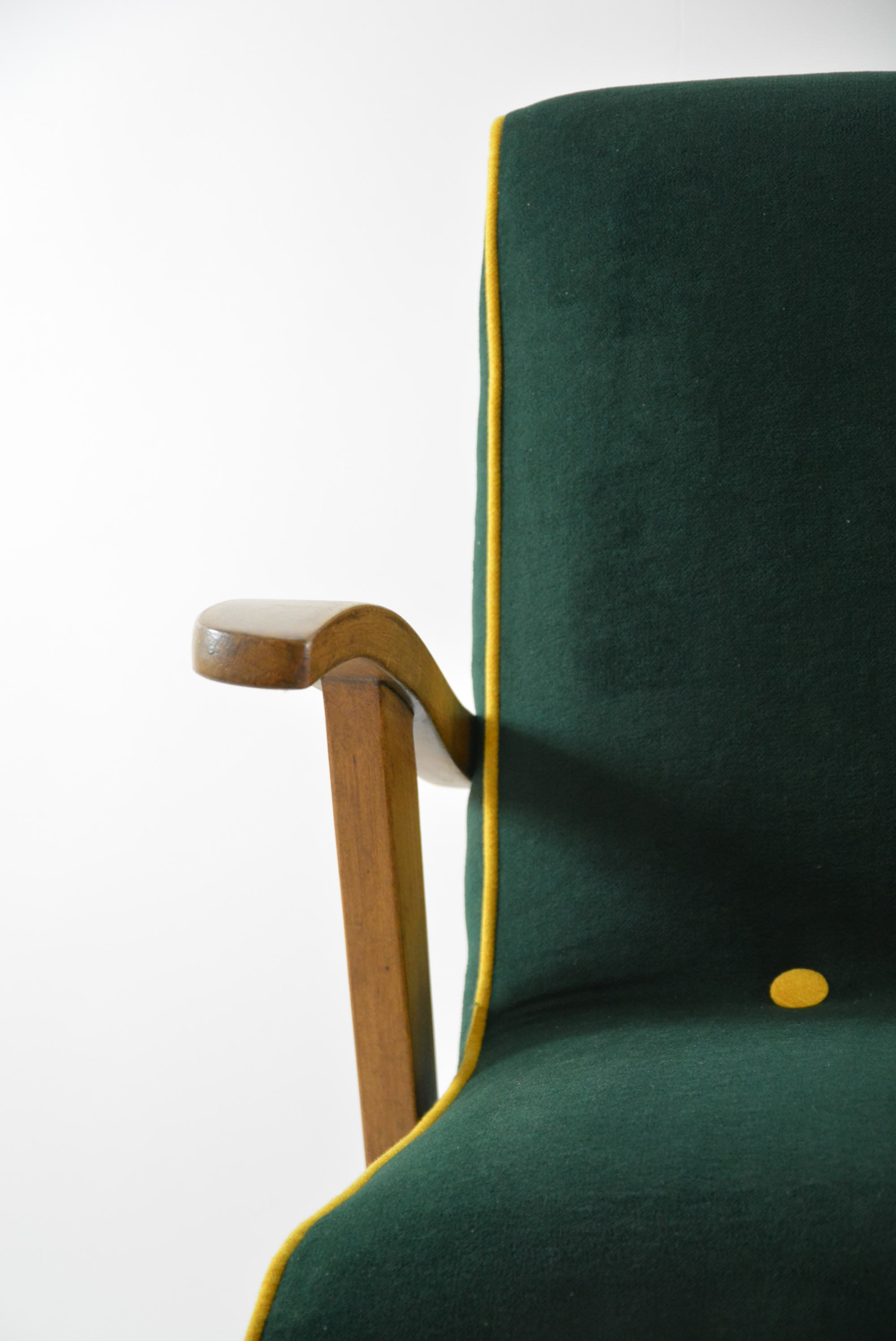 Rénovation intégrale incluant: changement de garniture, ponçage et verni du bois. Tissu neuf vert sapin avec le passe poil et des bottons jaunes.