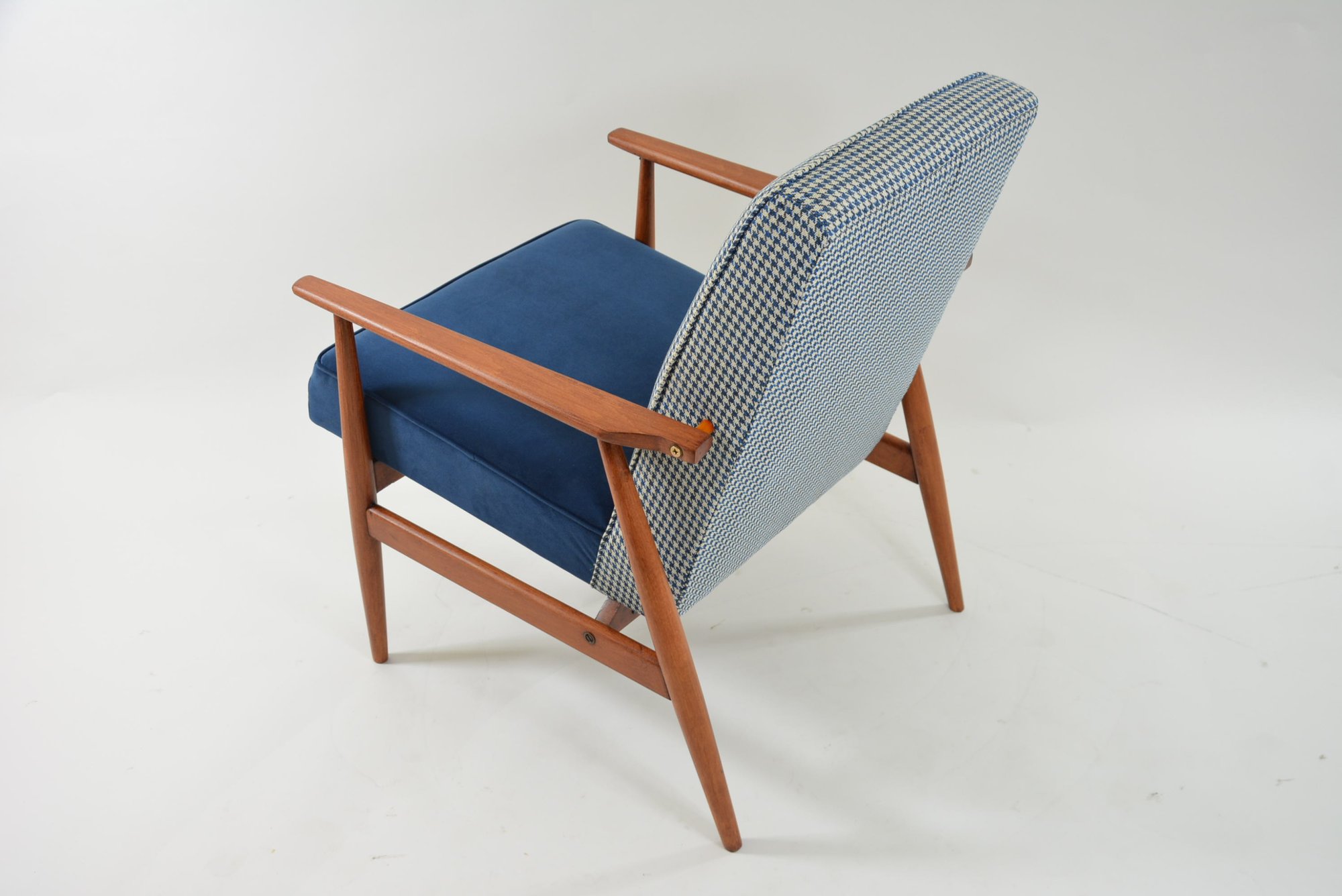 Entièrement restaurés. Tissu chiné à motif pieds de poule bleu sur le dossier, velours antitache bleu sur l'assise. Beau vernis teck brun/ aspect ciré satin/ avec la structure de bois poncée et revernie.